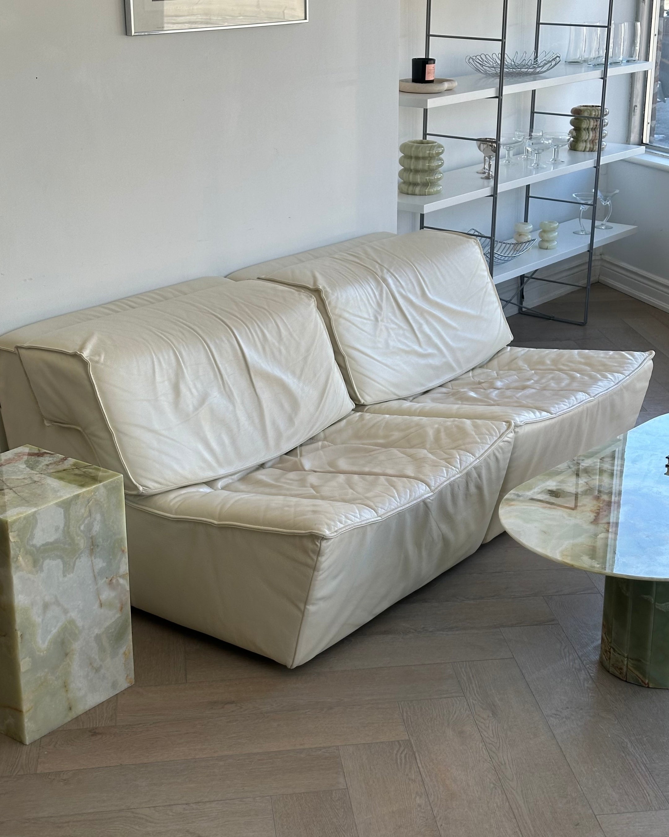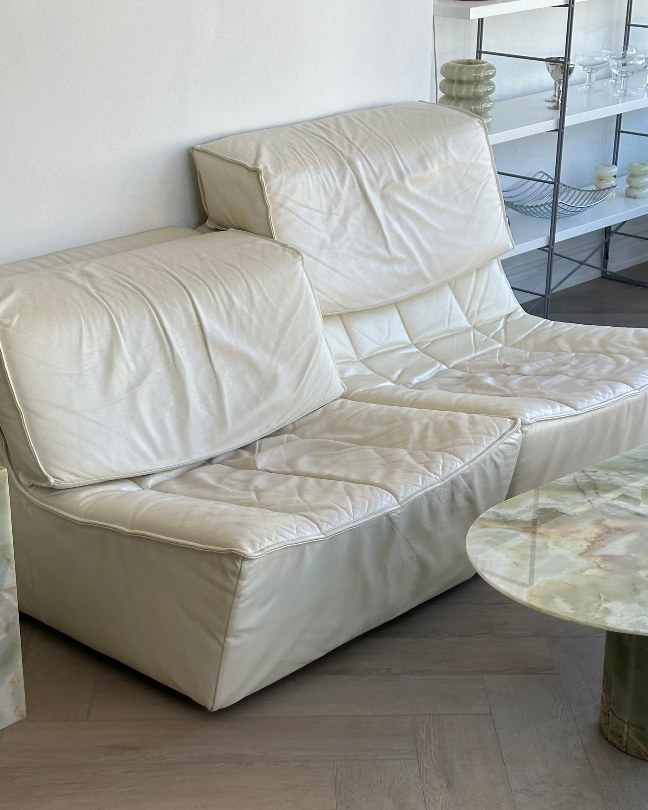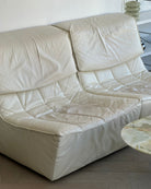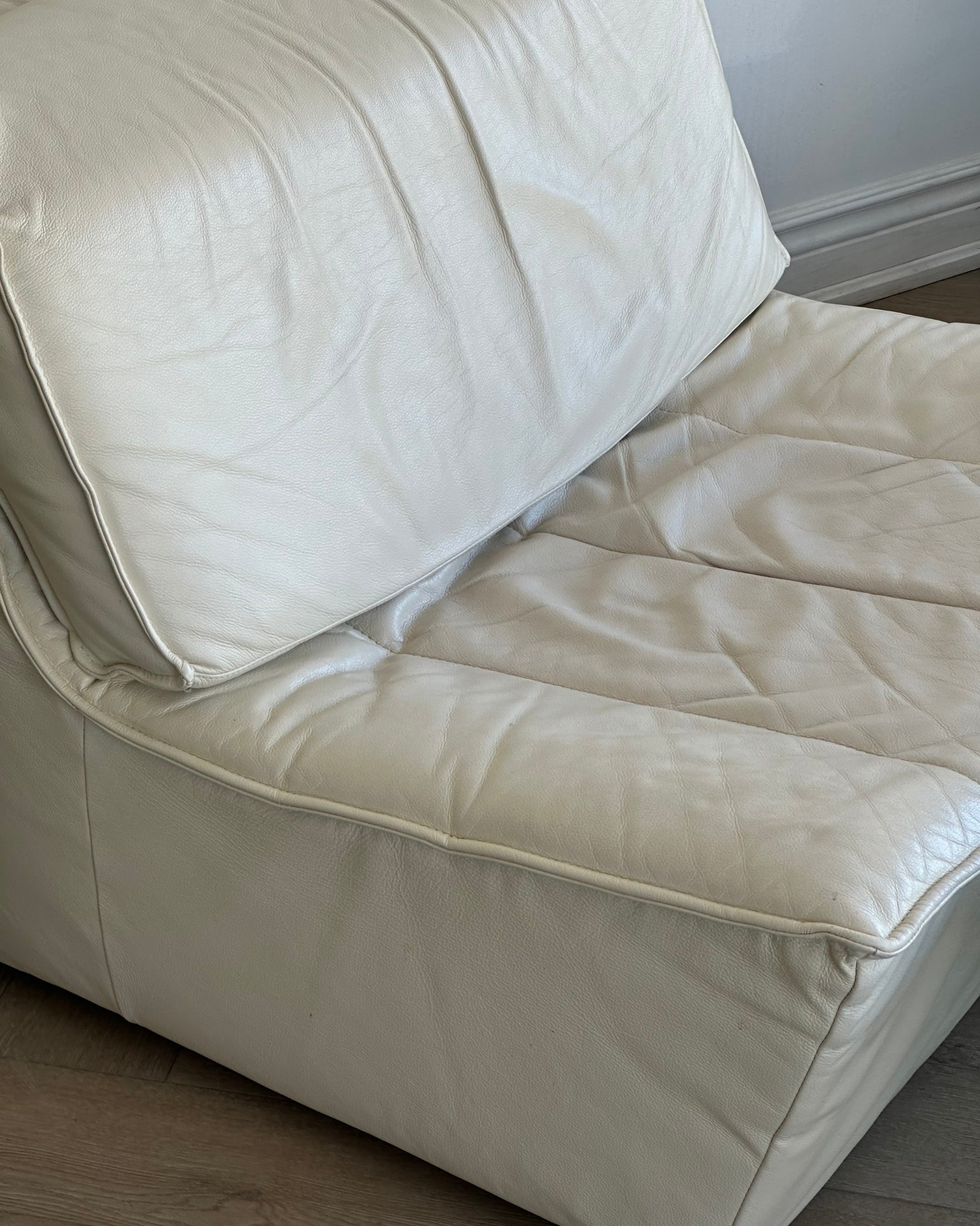 Excellent vintage condition 2-piece modular by Sylvian Joly for Chateaux d’Ax, made in Italy in the early 2000’s. Made from buttery leather in a soft ivory. Sold as two individual accent chairs; with the option to pair together as a loveseat. Backrest cushions have adjustable heights and are removable.