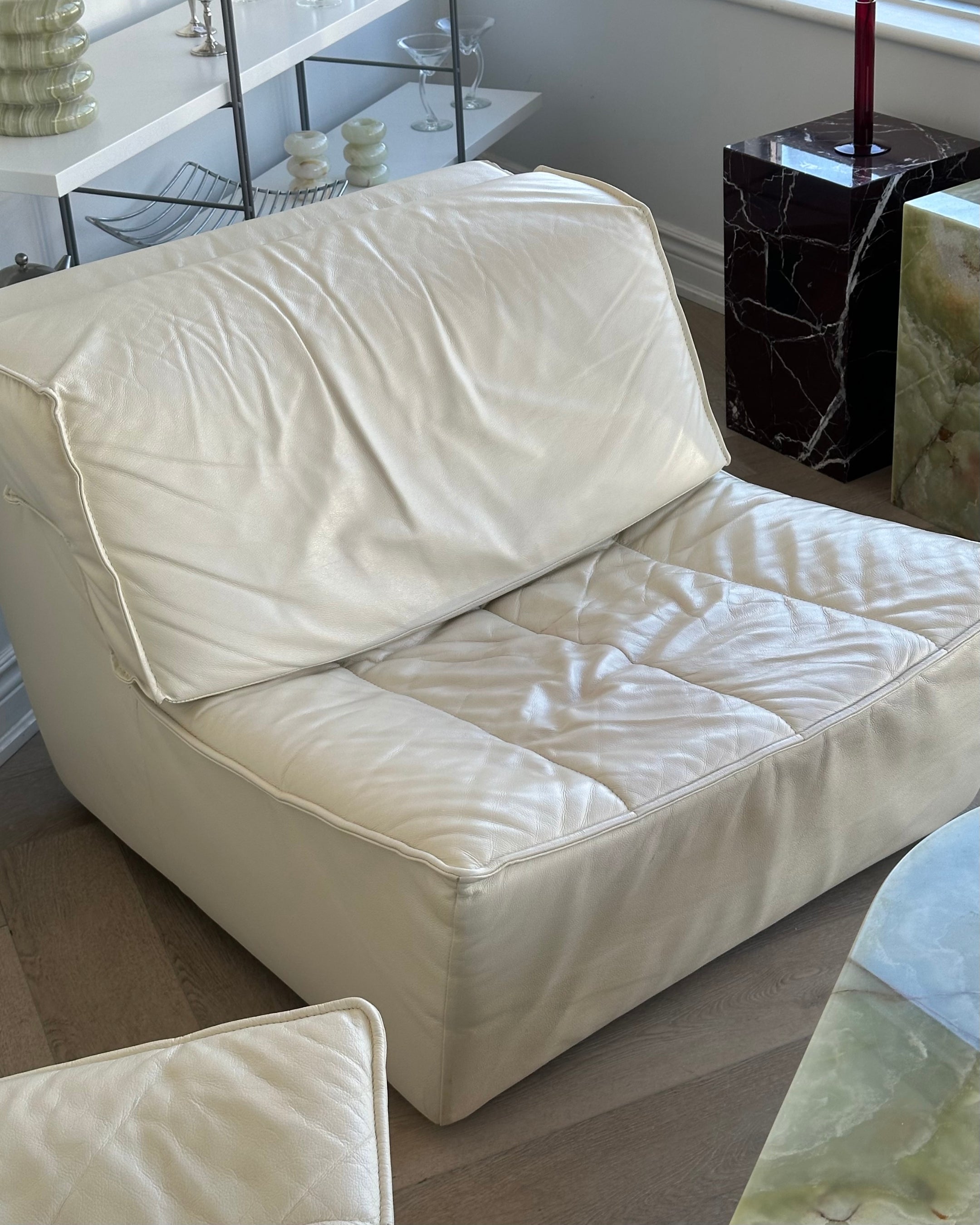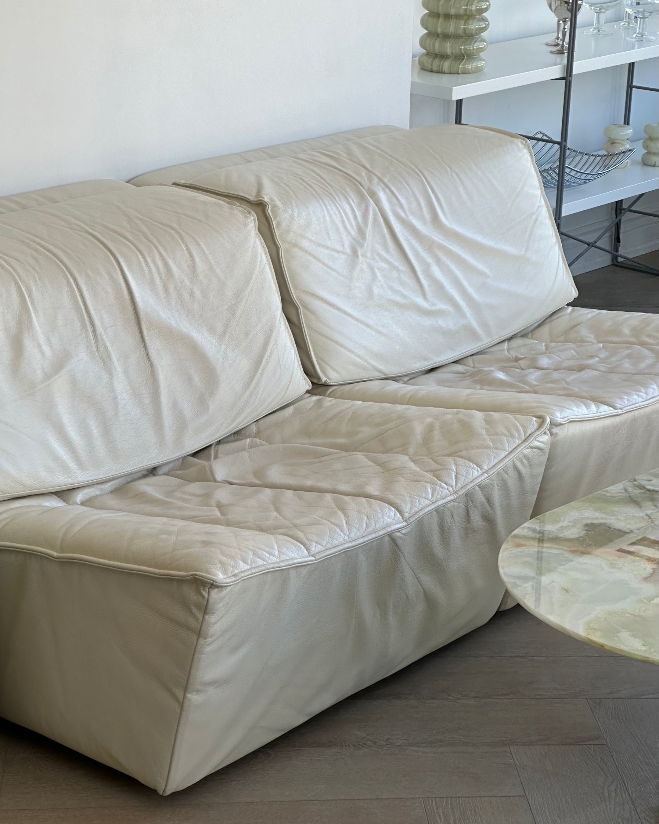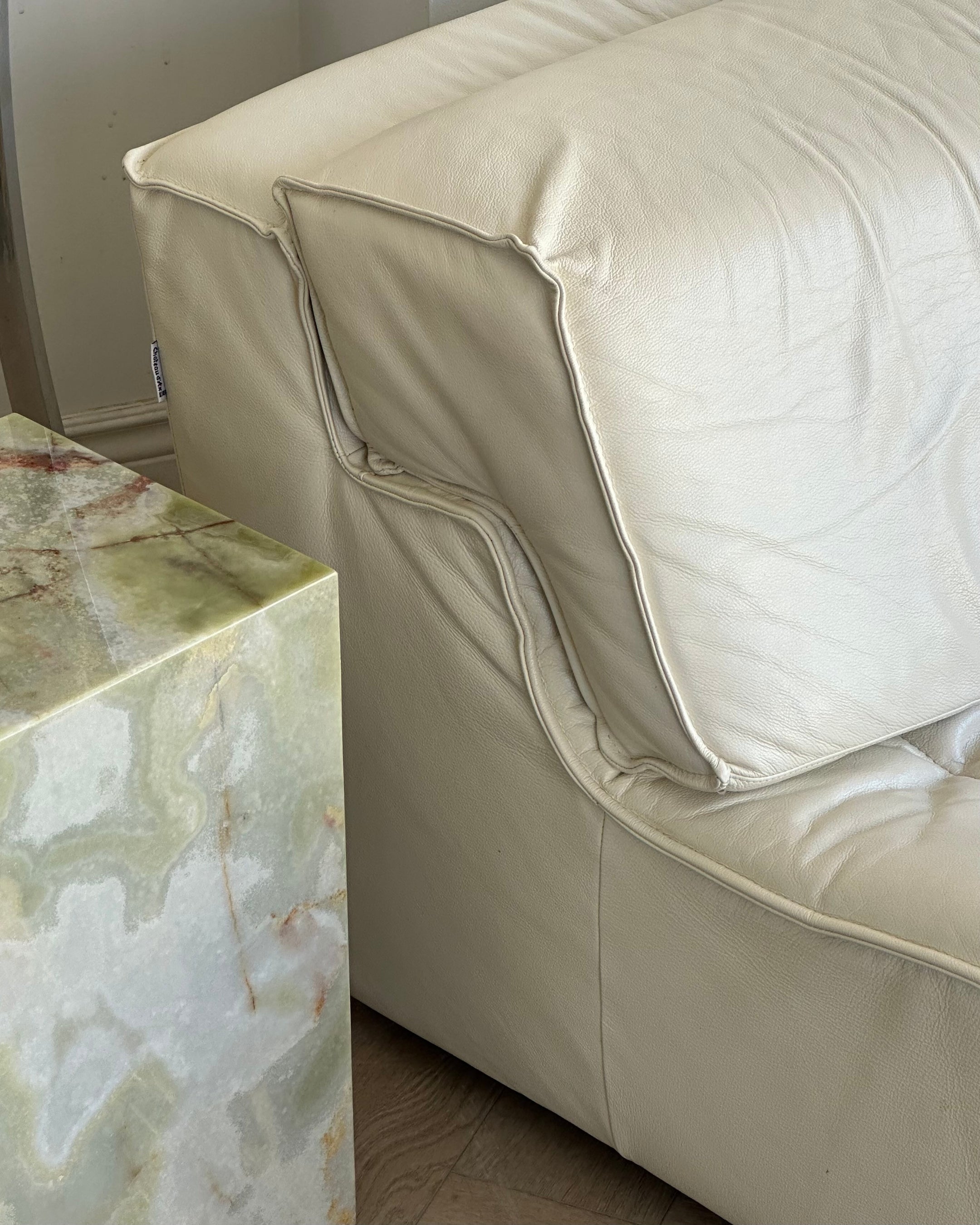 Excellent vintage condition 2-piece modular by Sylvian Joly for Chateaux d’Ax, made in Italy in the early 2000’s. Made from buttery leather in a soft ivory. Sold as two individual accent chairs; with the option to pair together as a loveseat. Backrest cushions have adjustable heights and are removable.