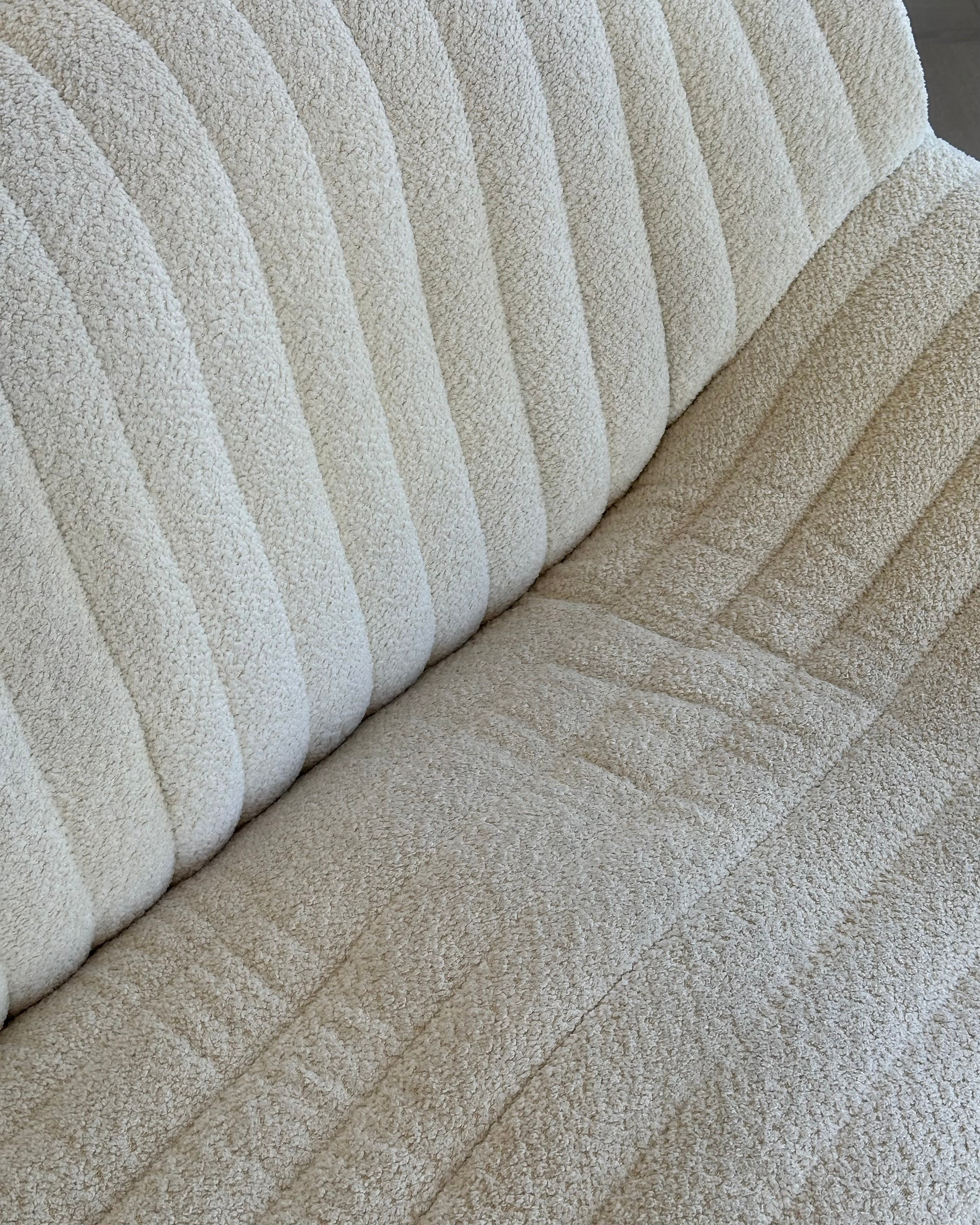 Reproduction Cinna Sandra sofa by Linge Roset; produced by Eternity Modern. A beautiful ivory textured b boucle fabric with minimal overall wear. In excellent condition. Features unique curvature seating. 3-seater.