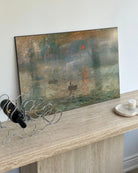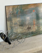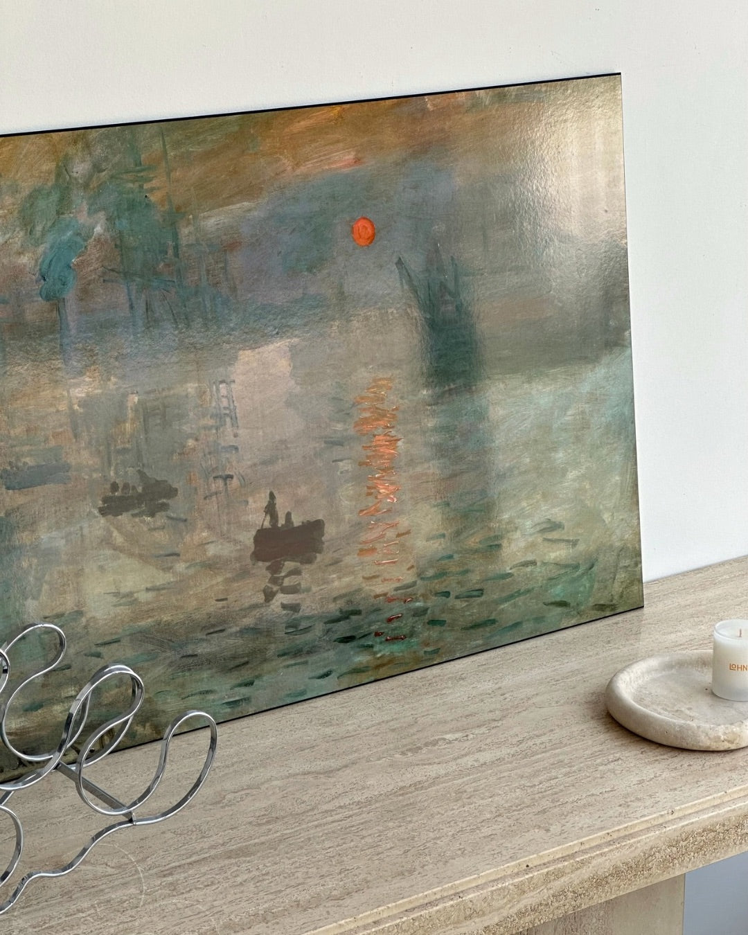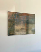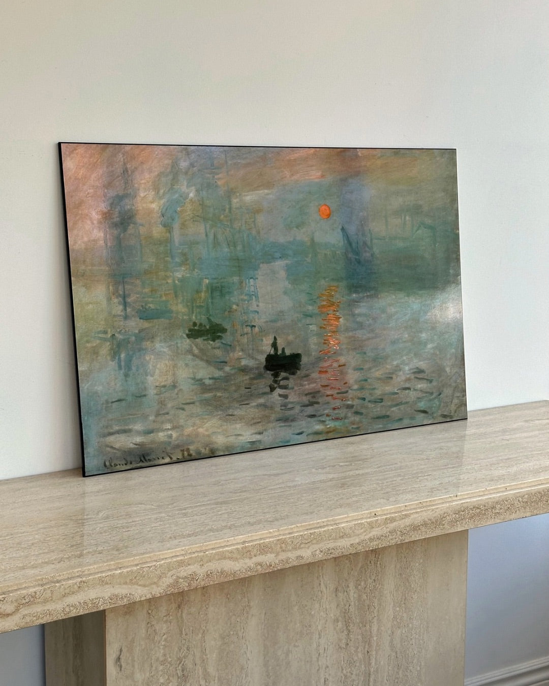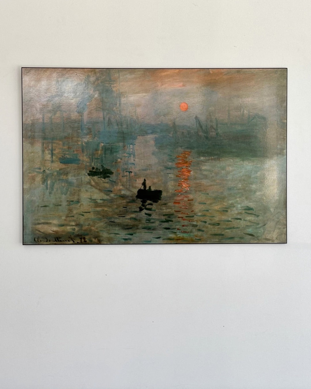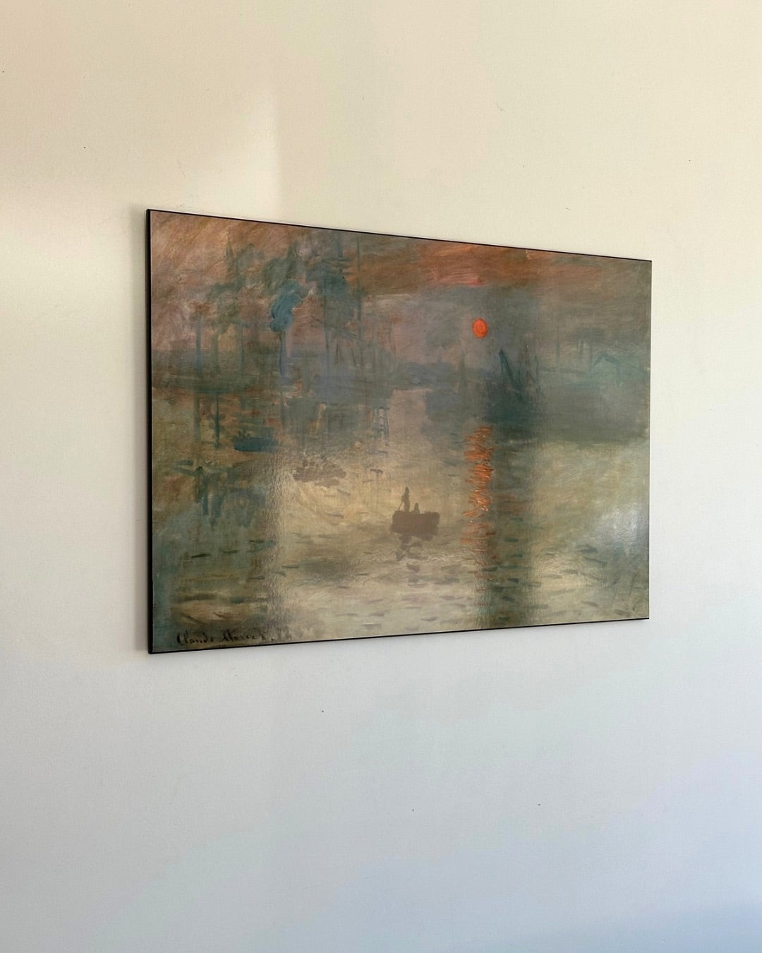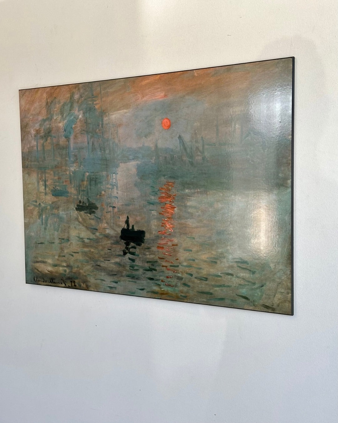 Impression, Sunrise painting by Claude Monet mounted on posterboard. Features a glossy finish and matte black edging with hanging inserts. This painting is coined as what inspired the name of the Impressionist Movement. Depicting the port of Monet’s hometown in deep hues.