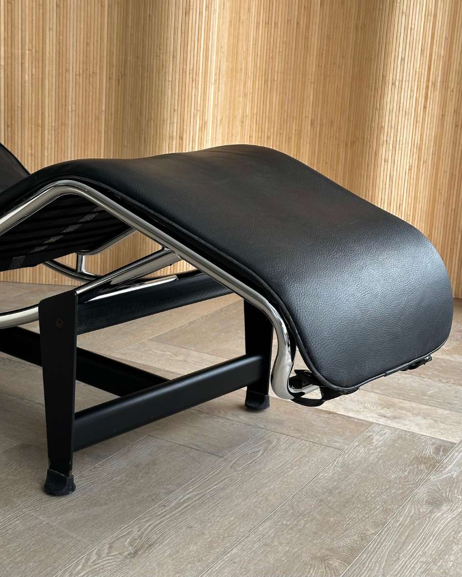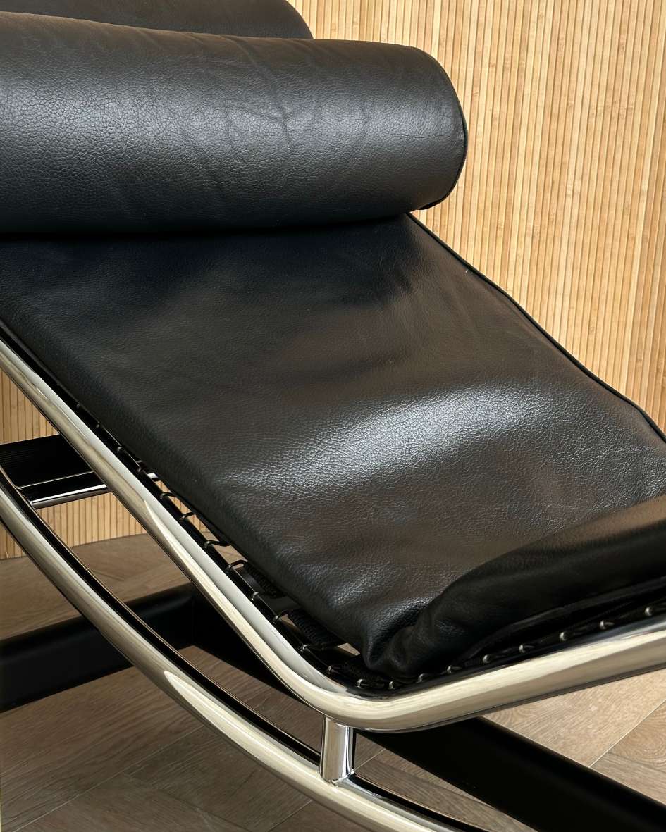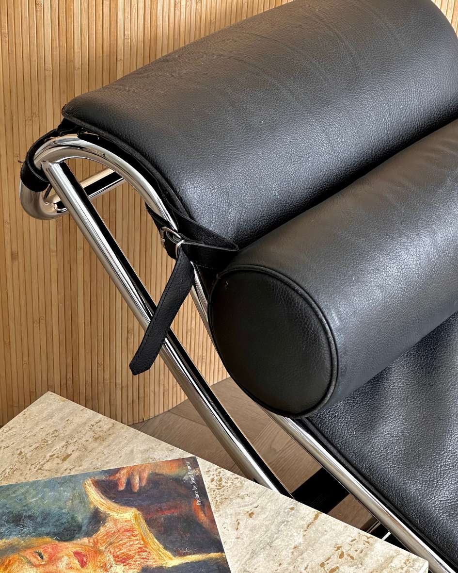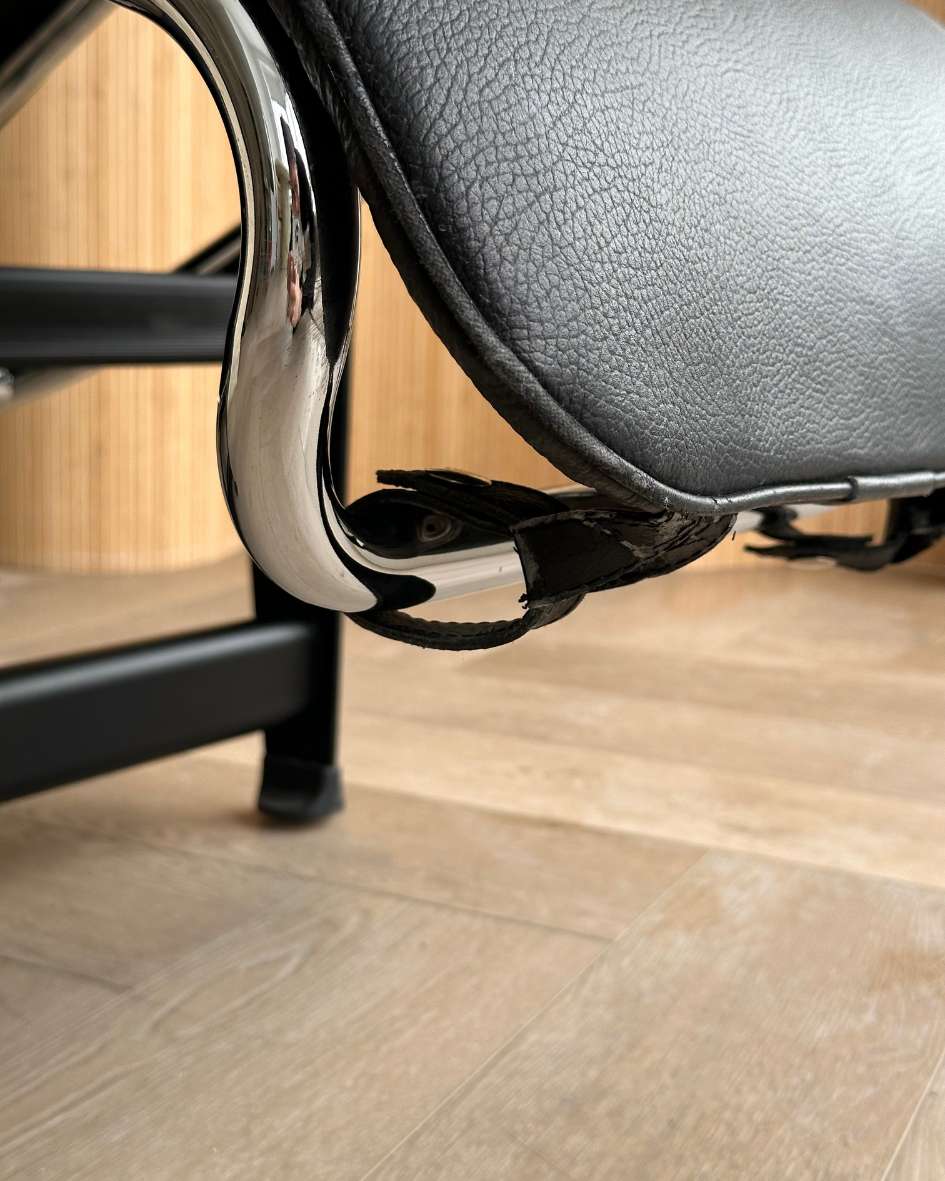 Vintage chaise lounge in the style of Le Corbusier. Made from genuine leather in great overall condition. Slight fraying on attaching straps and a small white mark on the lounge cushion as shown in photos. Minimal age-related wear.