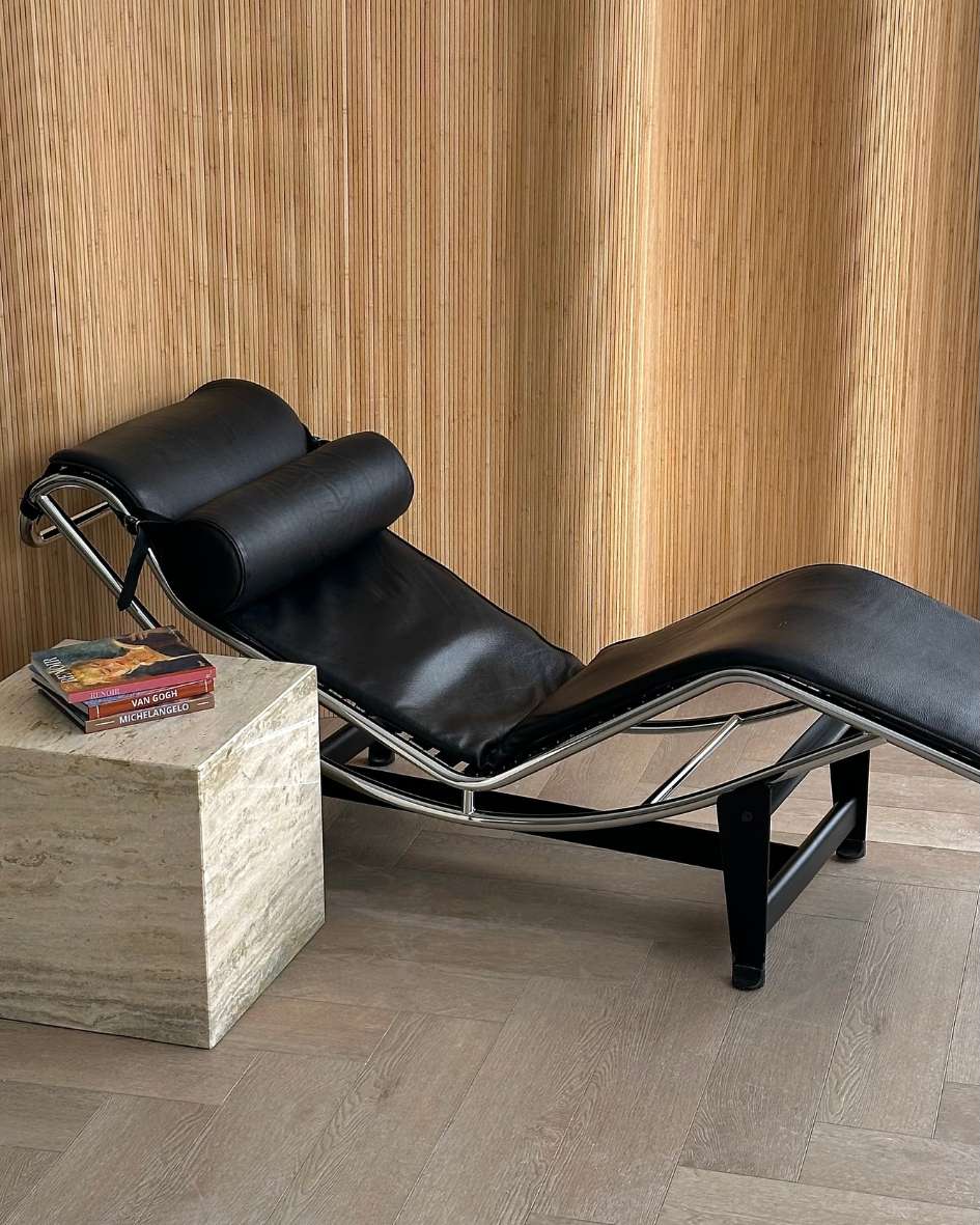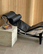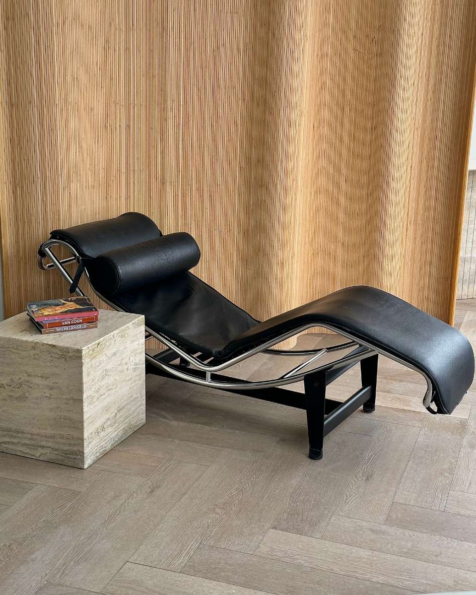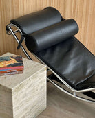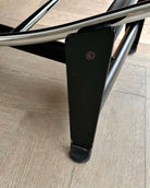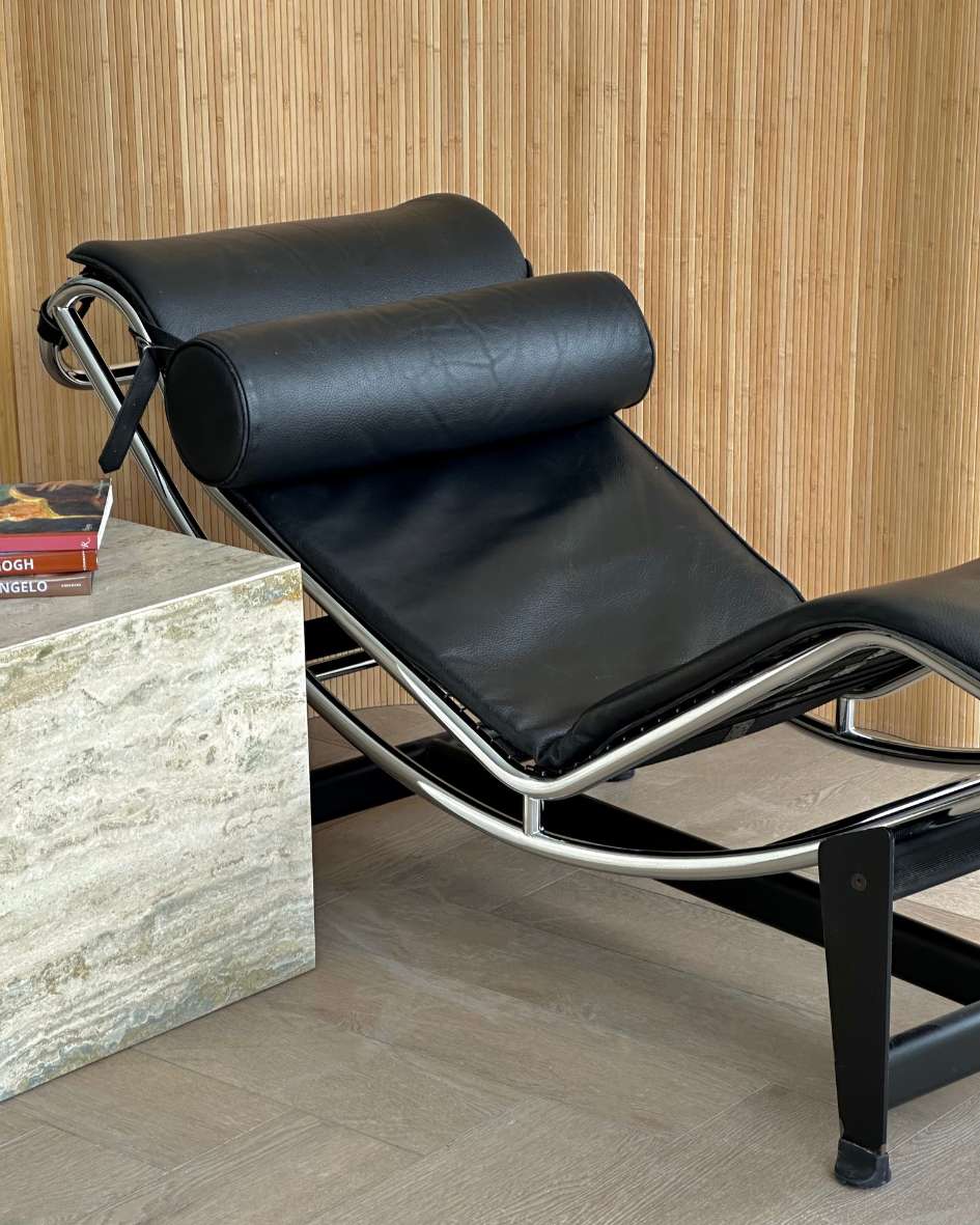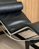 Vintage chaise lounge in the style of Le Corbusier. Made from genuine leather in great overall condition. Slight fraying on attaching straps and a small white mark on the lounge cushion as shown in photos. Minimal age-related wear.