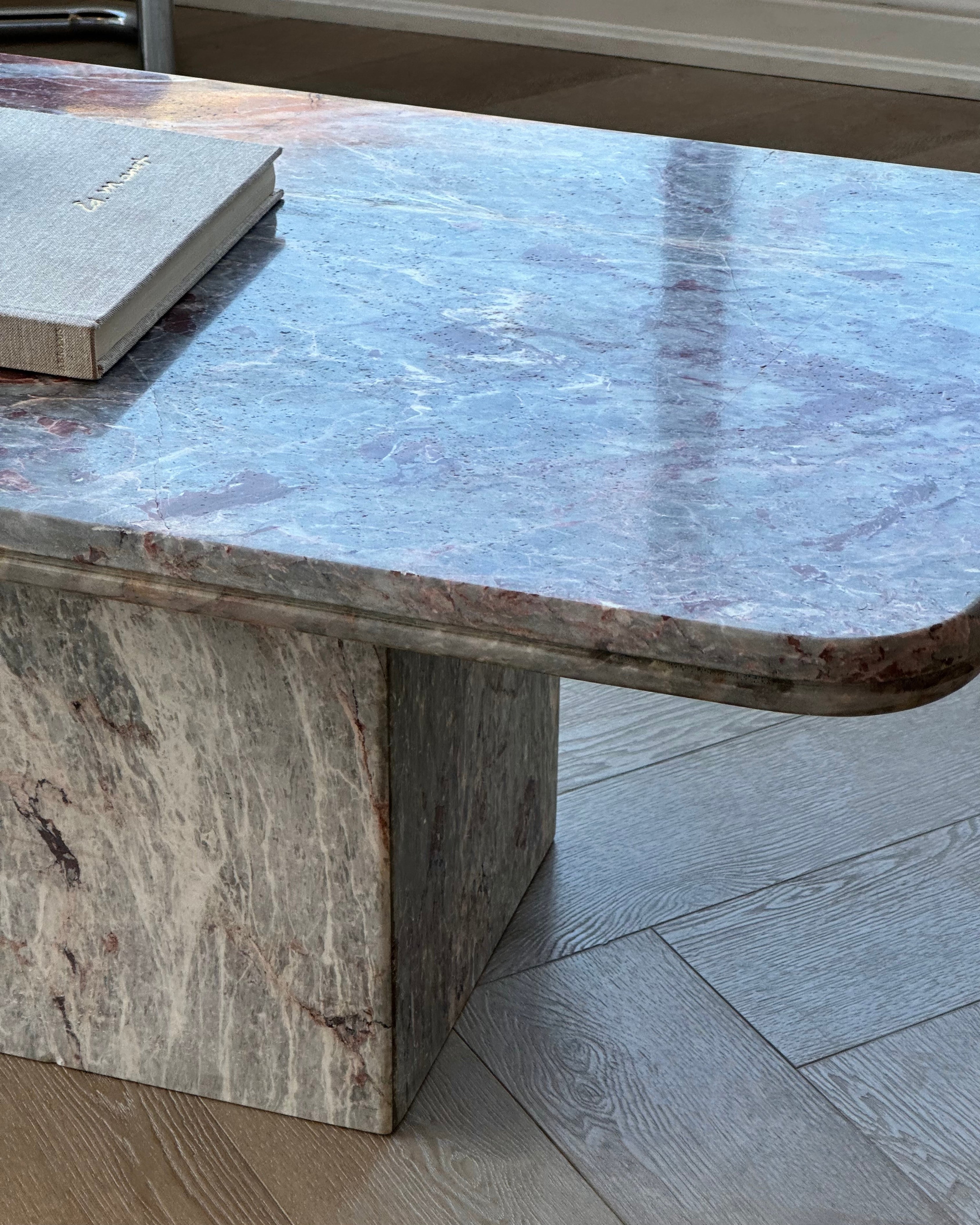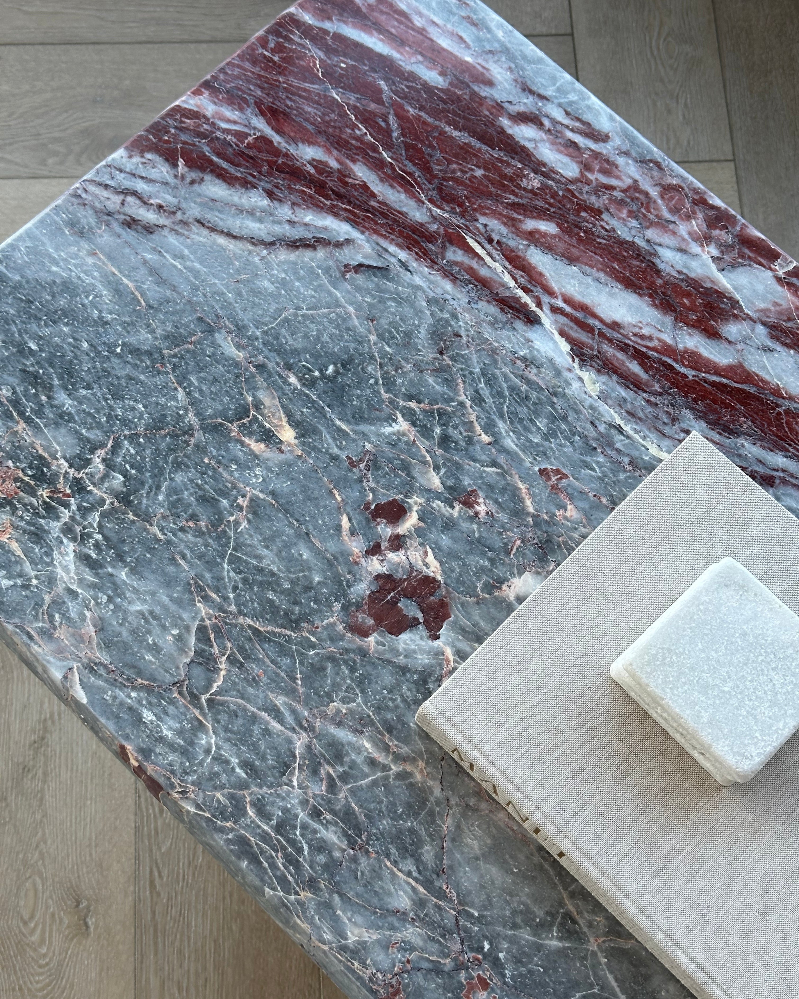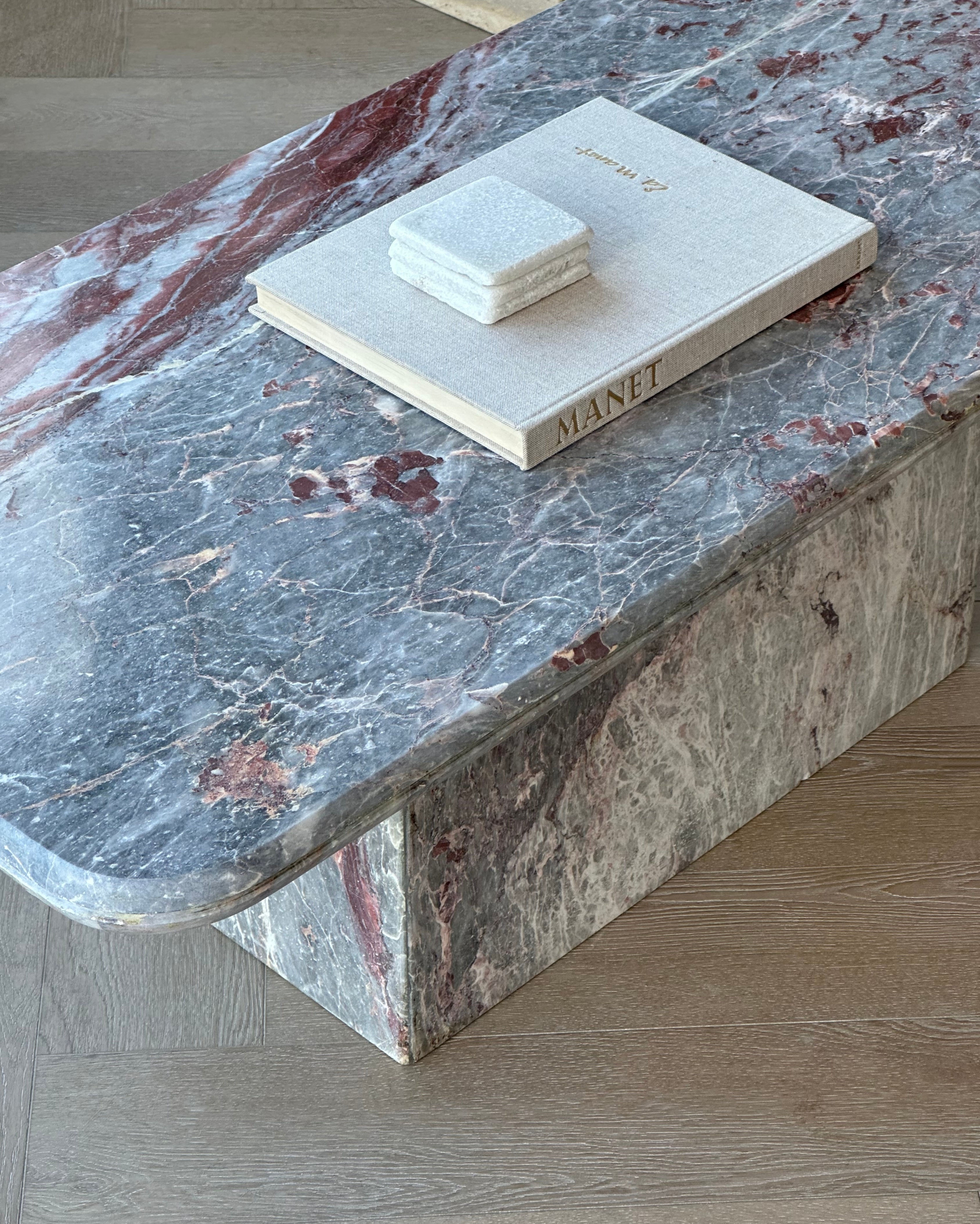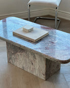 Vintage Italian Salome marble coffee table featuring beautiful hues of grey, pink and ivory. Surface has been professionally restored to a leathered finish. A rare, smaller sized rectangular table suitable for narrow spaces.