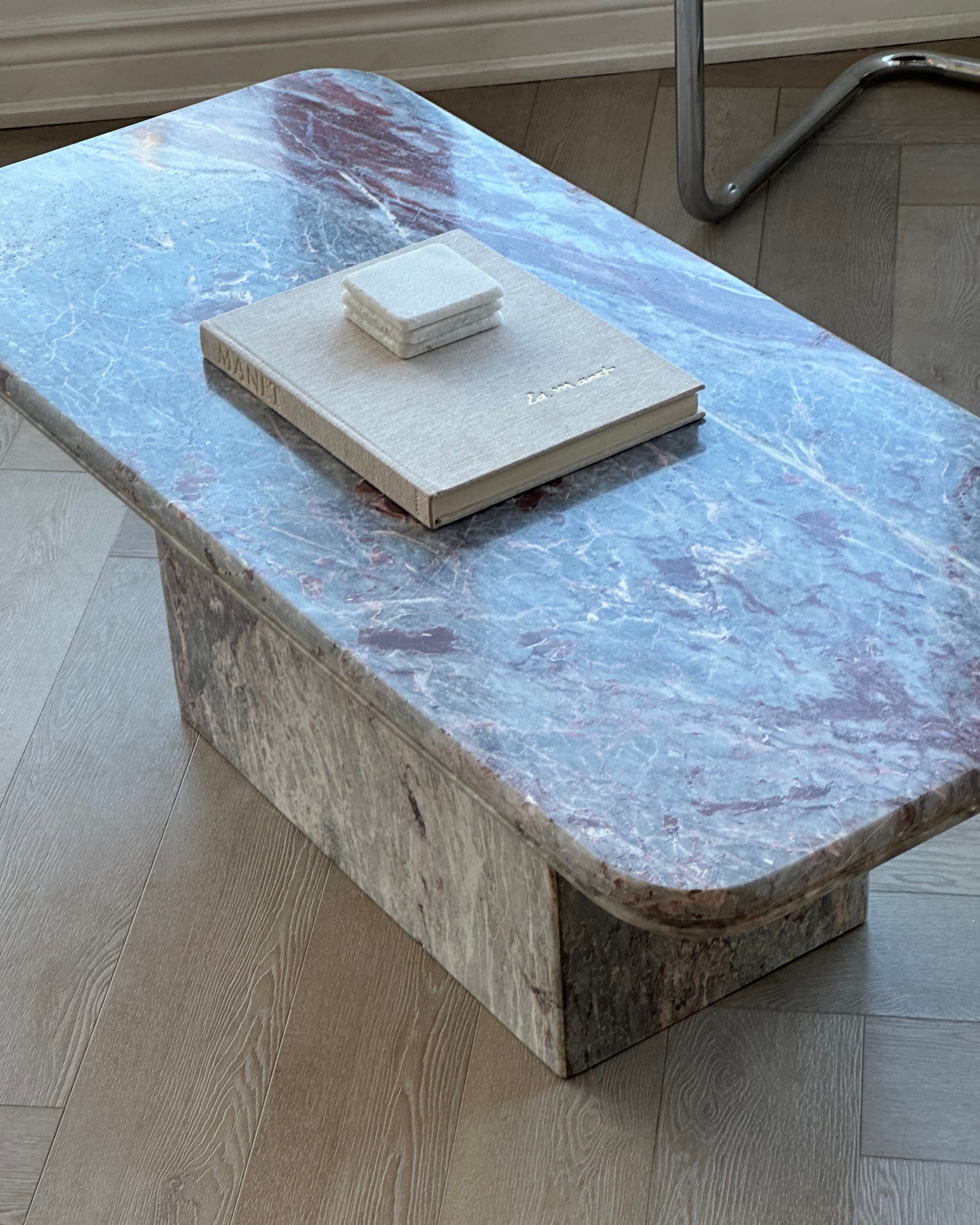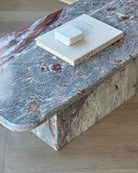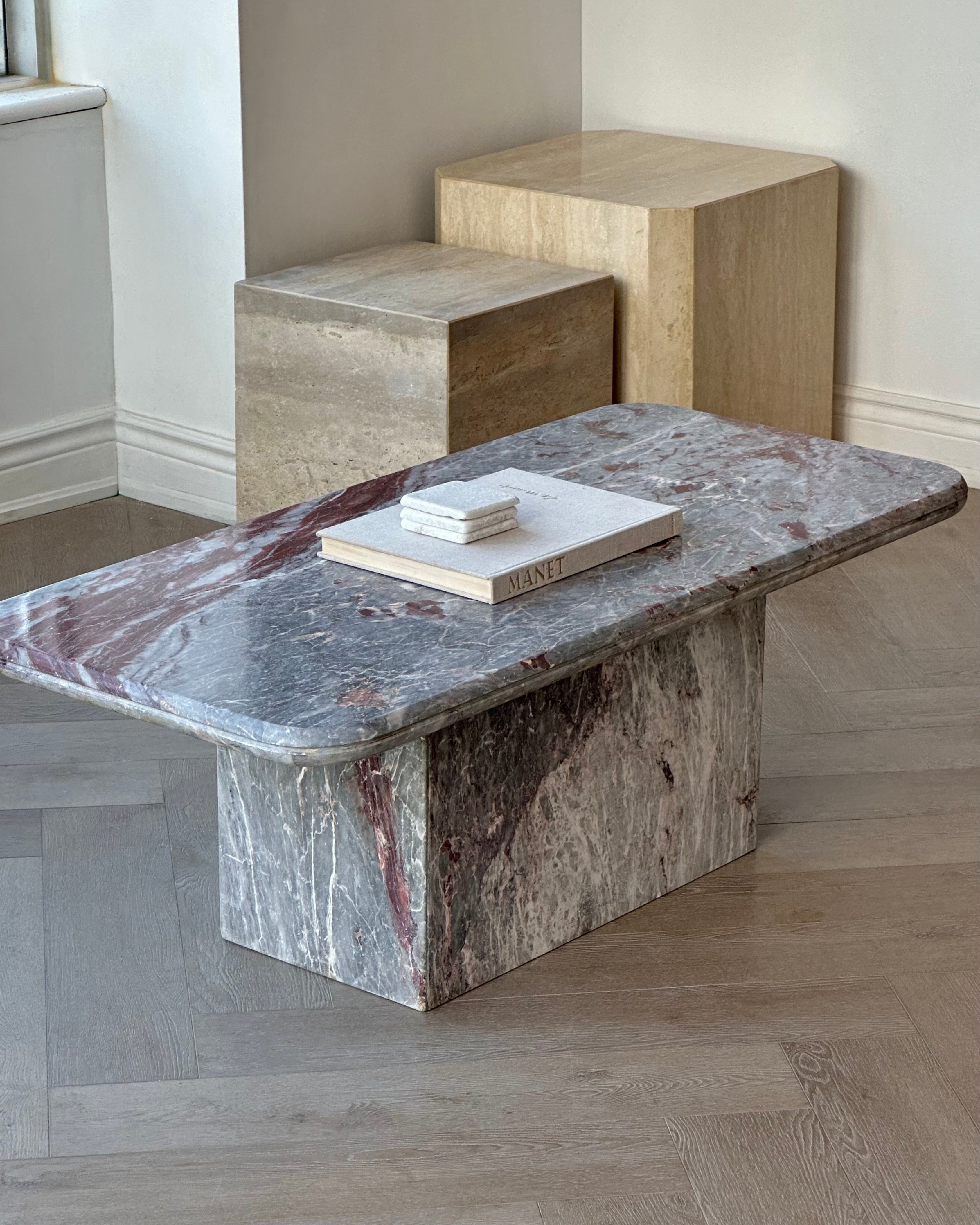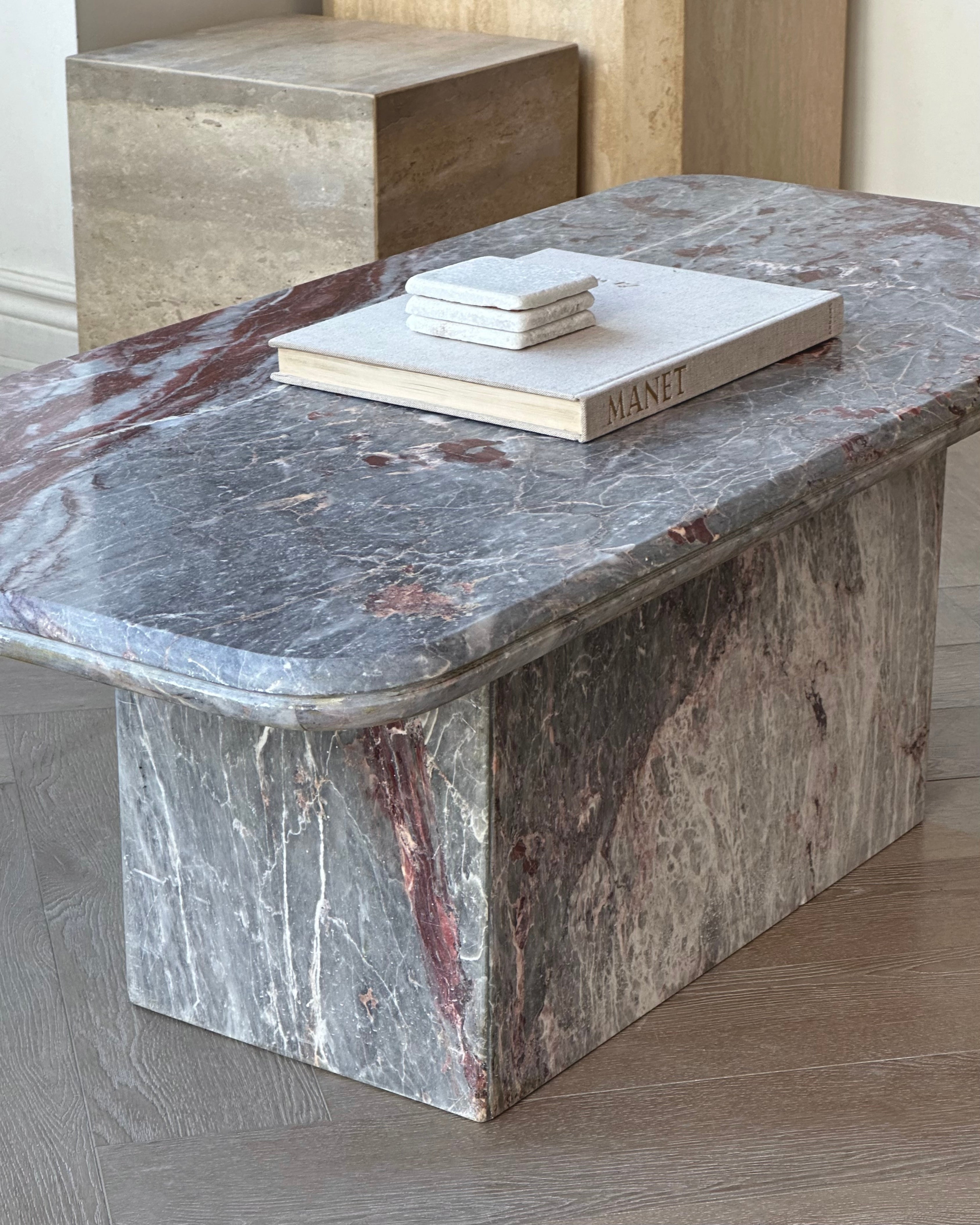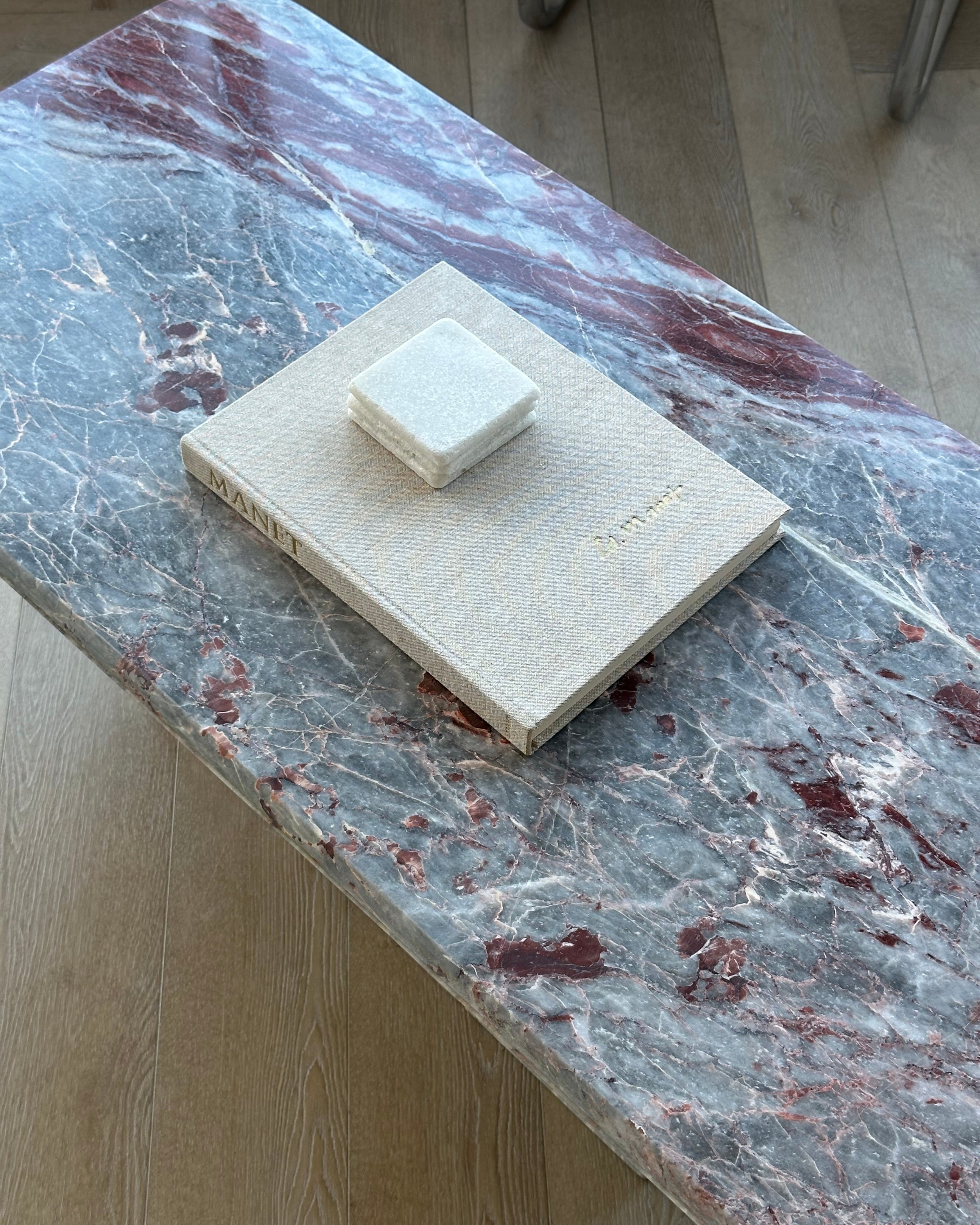 Vintage Italian Salome marble coffee table featuring beautiful hues of grey, pink and ivory. Surface has been professionally restored to a leathered finish. A rare, smaller sized rectangular table suitable for narrow spaces.