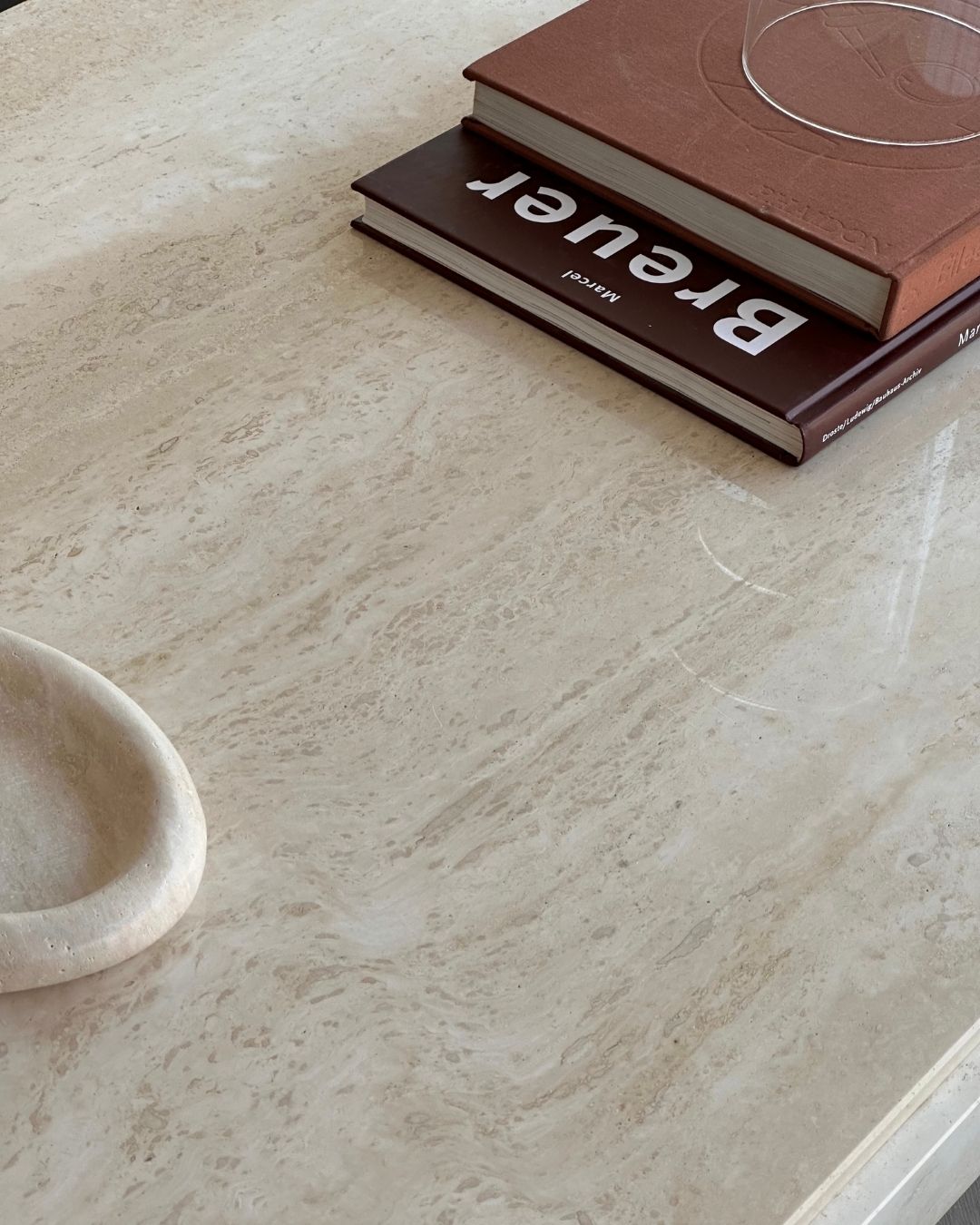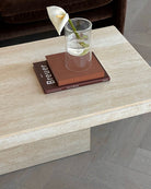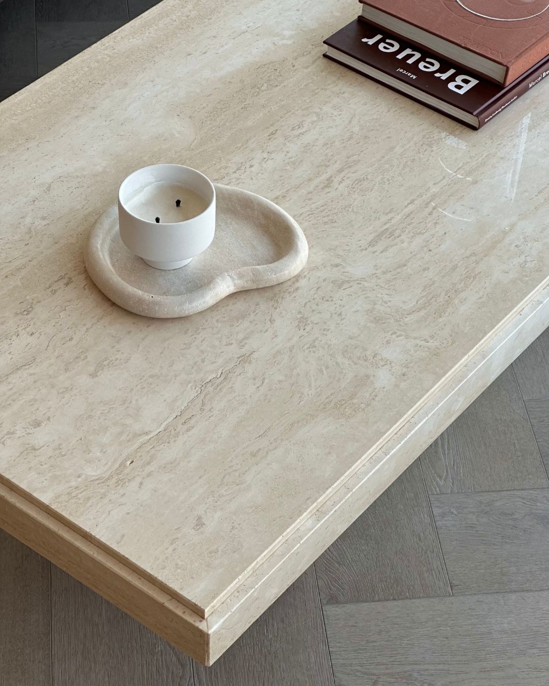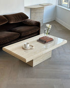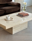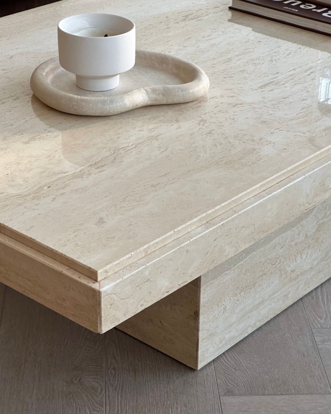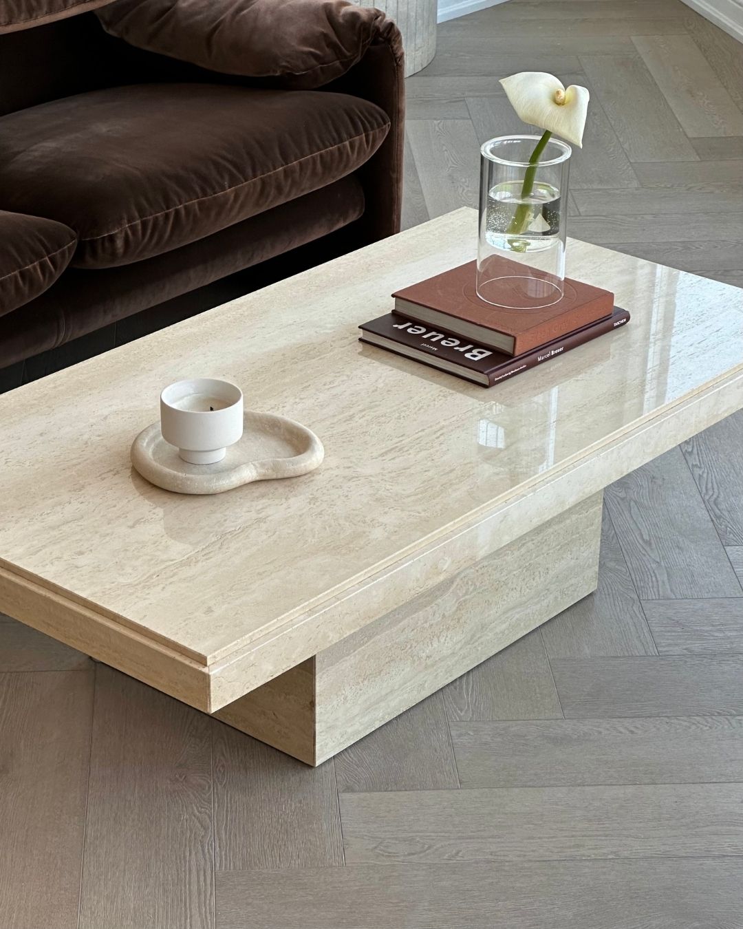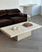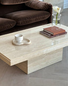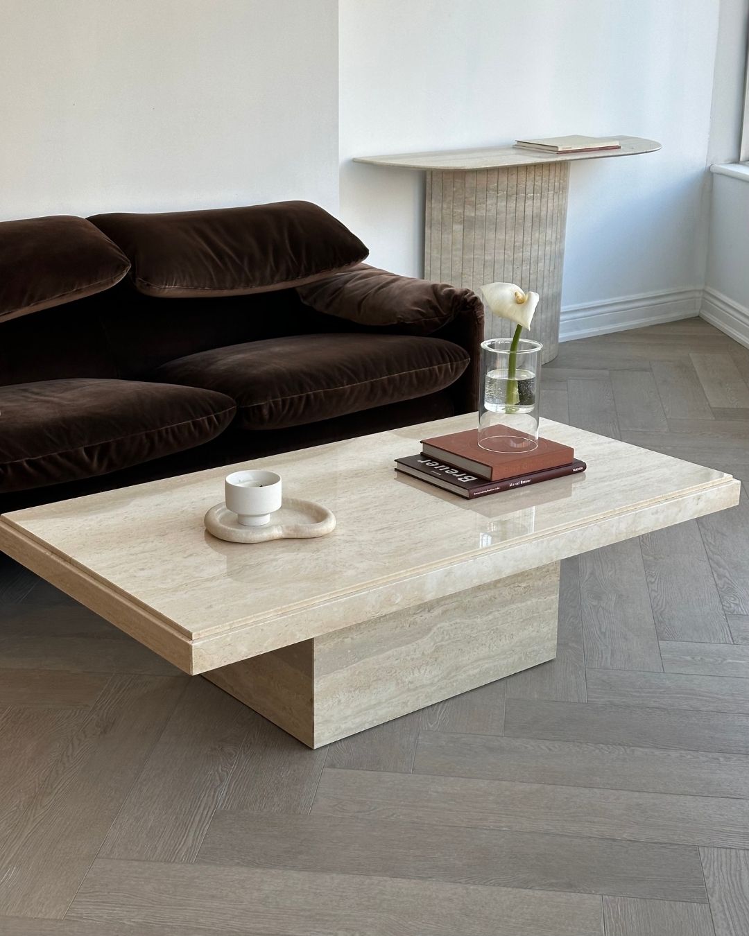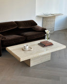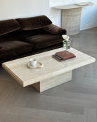 Vintage low-profile travertine coffee table in excellent condition. Surface has been professionally polished and restored. A rare low height of 14" makes this piece a substantial statement paired against low-sitting sofas and larger living spaces.
