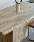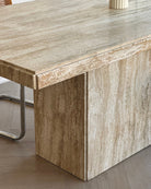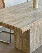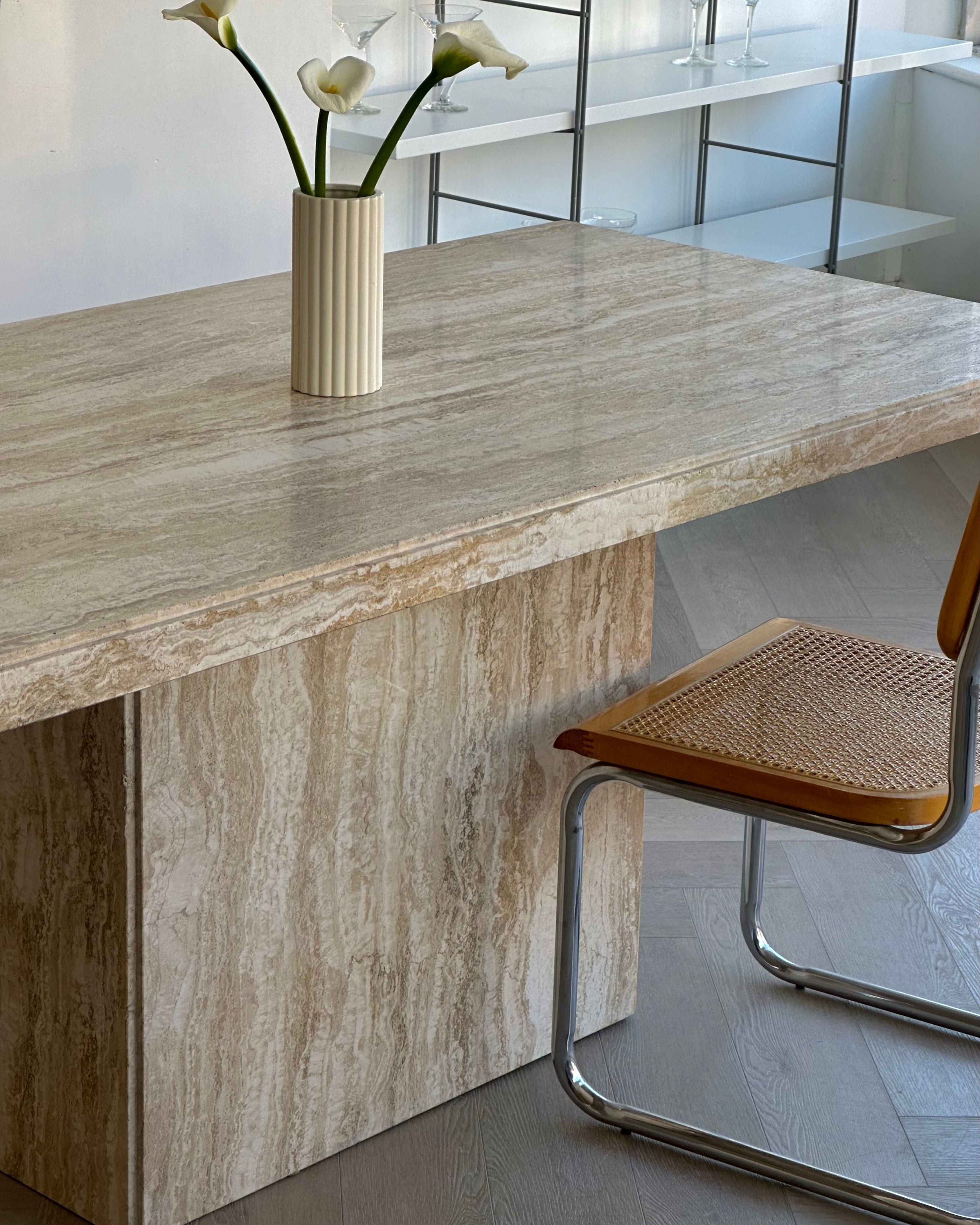 Striking marbled Travertine dining table in excellent vintage condition. Surface has been professionally refinished and polished. Rare, deeper veining adds both depth and dimension to this more common vintage design. Seats 6-8.