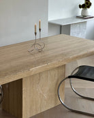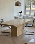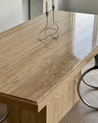 Excellent condition vintage Travertine pedestal dining table with striking veining. Presents itself with a deeper colour palette while remaining a soft neutral stone. Surface has been professionally restored and polished. Seats 8 comfortably.
