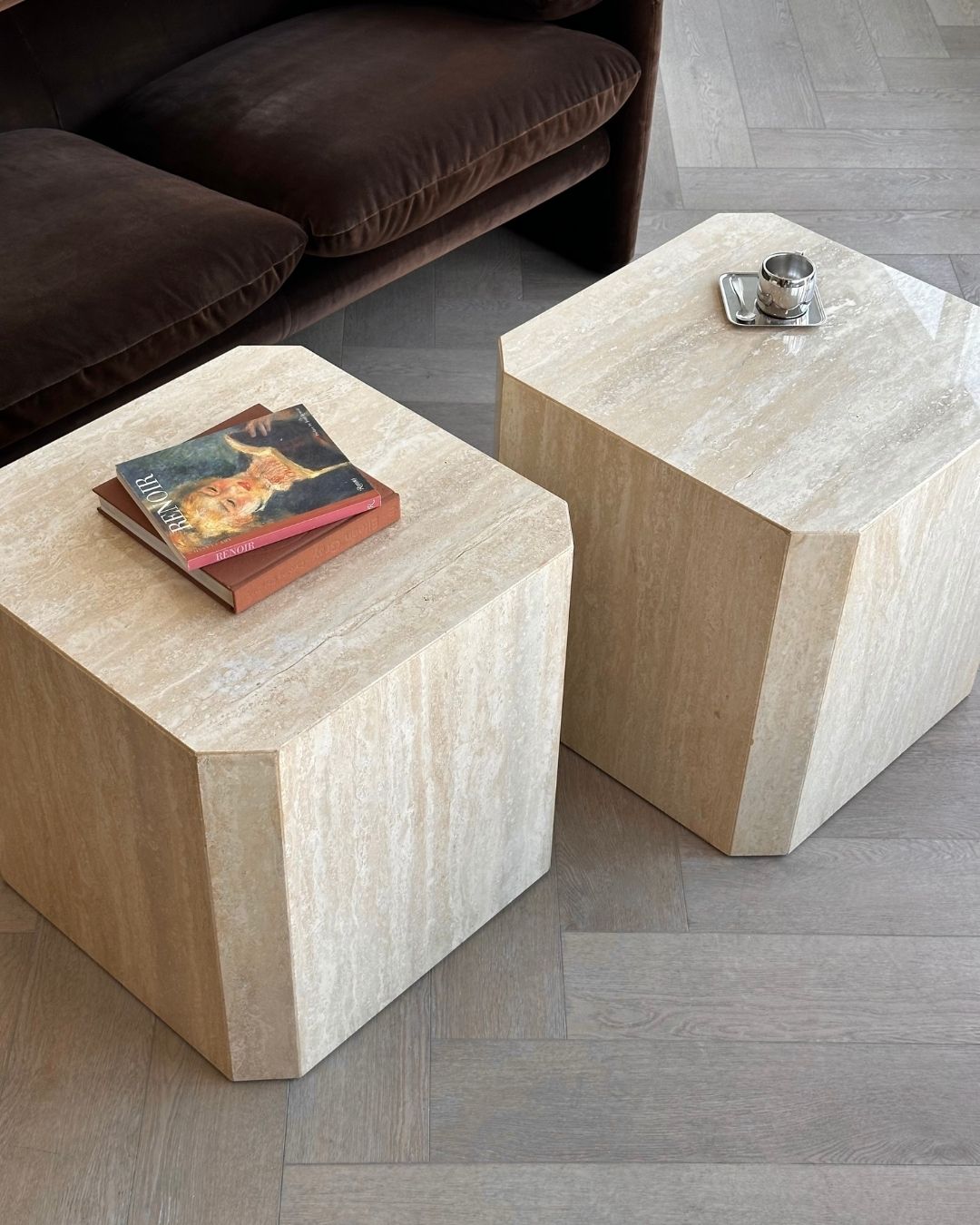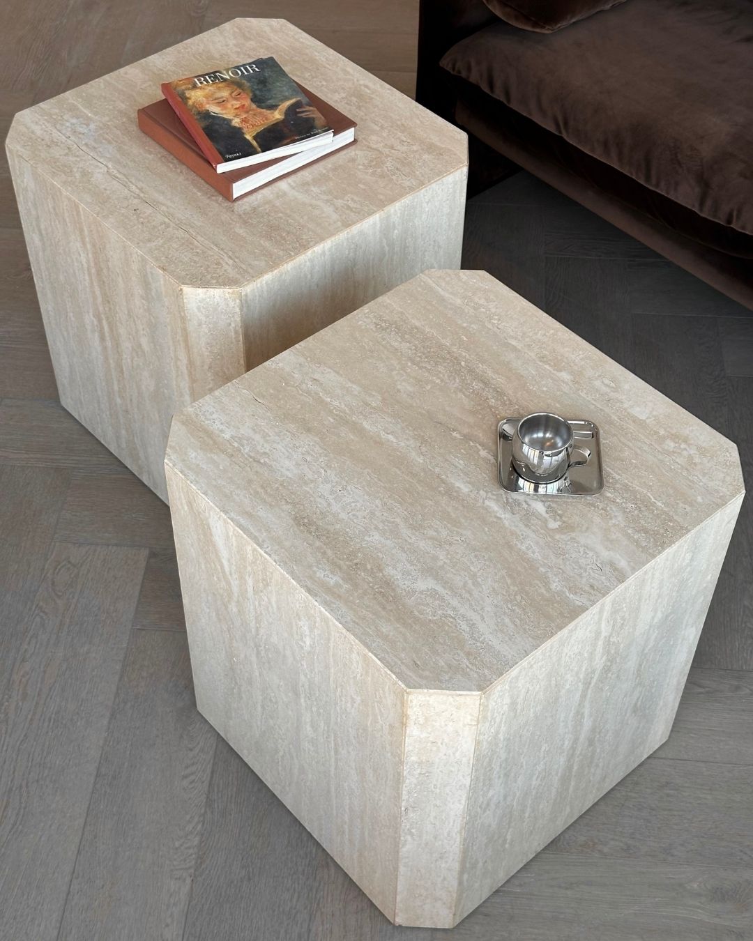 Vintage travertine cubes restored and polished to a high shine. Suitable as bedside or end tables, or in between two accent chairs. One remaining.