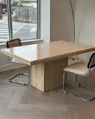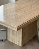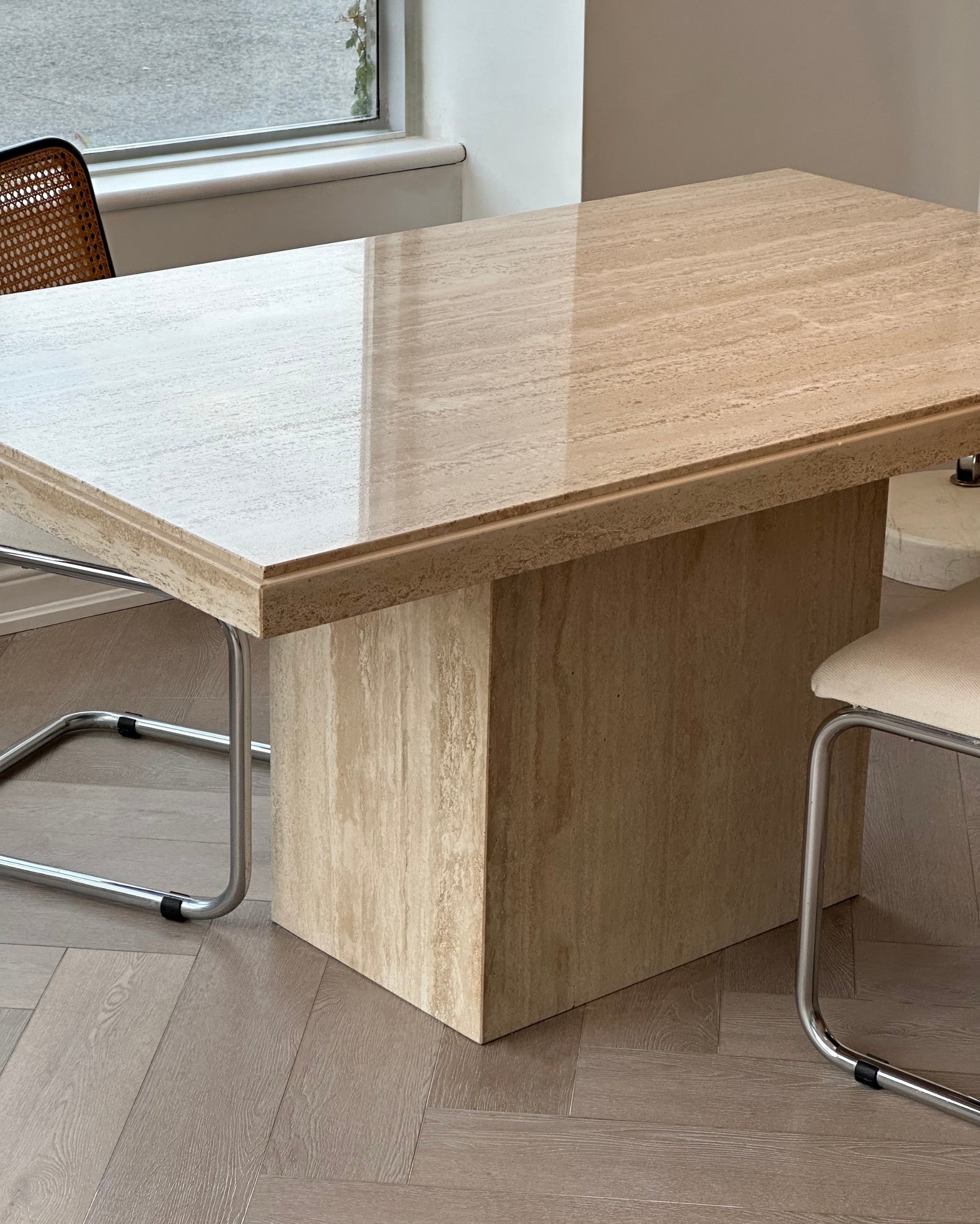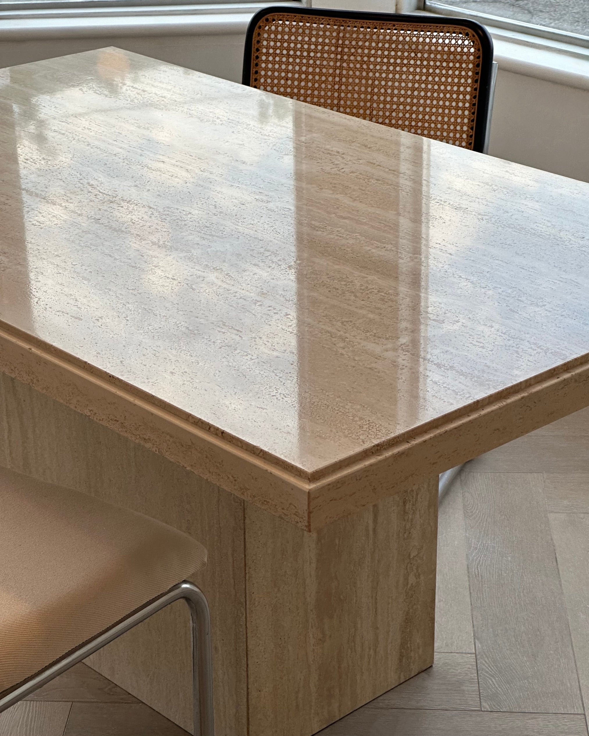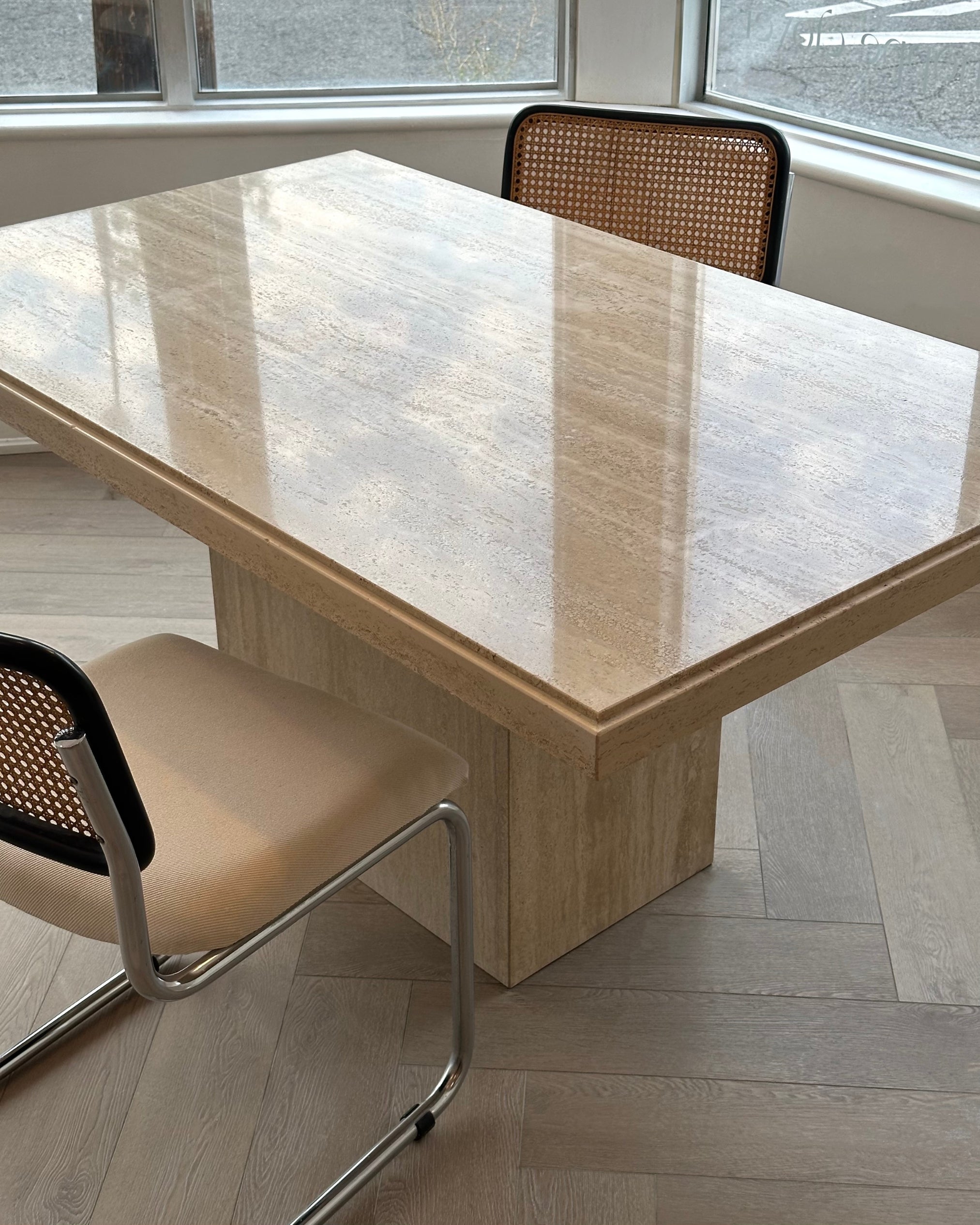 Polished Travertine dinette table in excellent vintage condition. Surface has been professionally refinished and polished to look like new. Seat 6 comfortably with its rare smaller sized format. Larger sizes to seat 8 are on their way — please reach out to inquire!