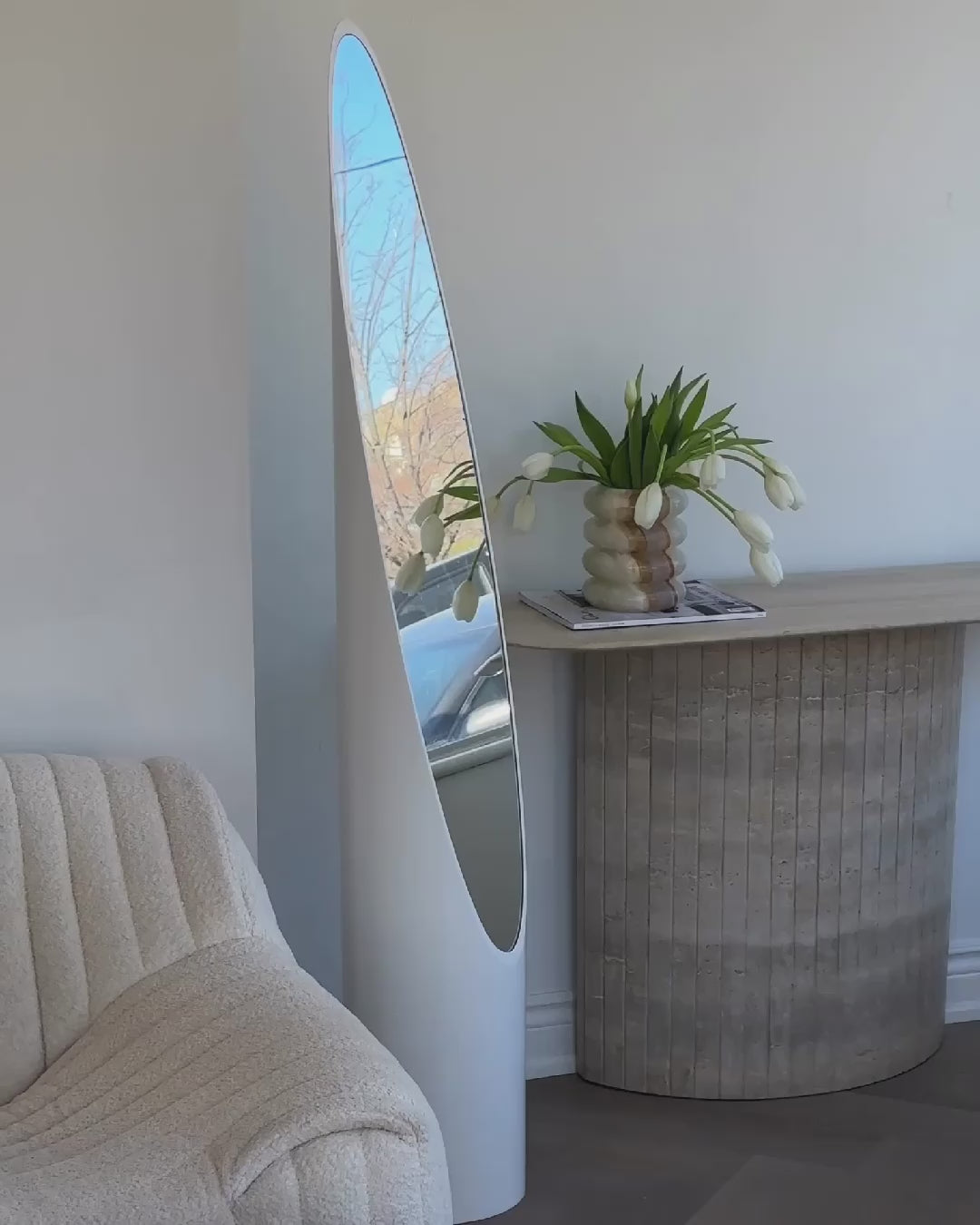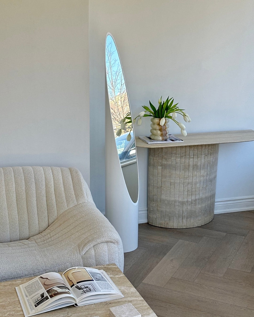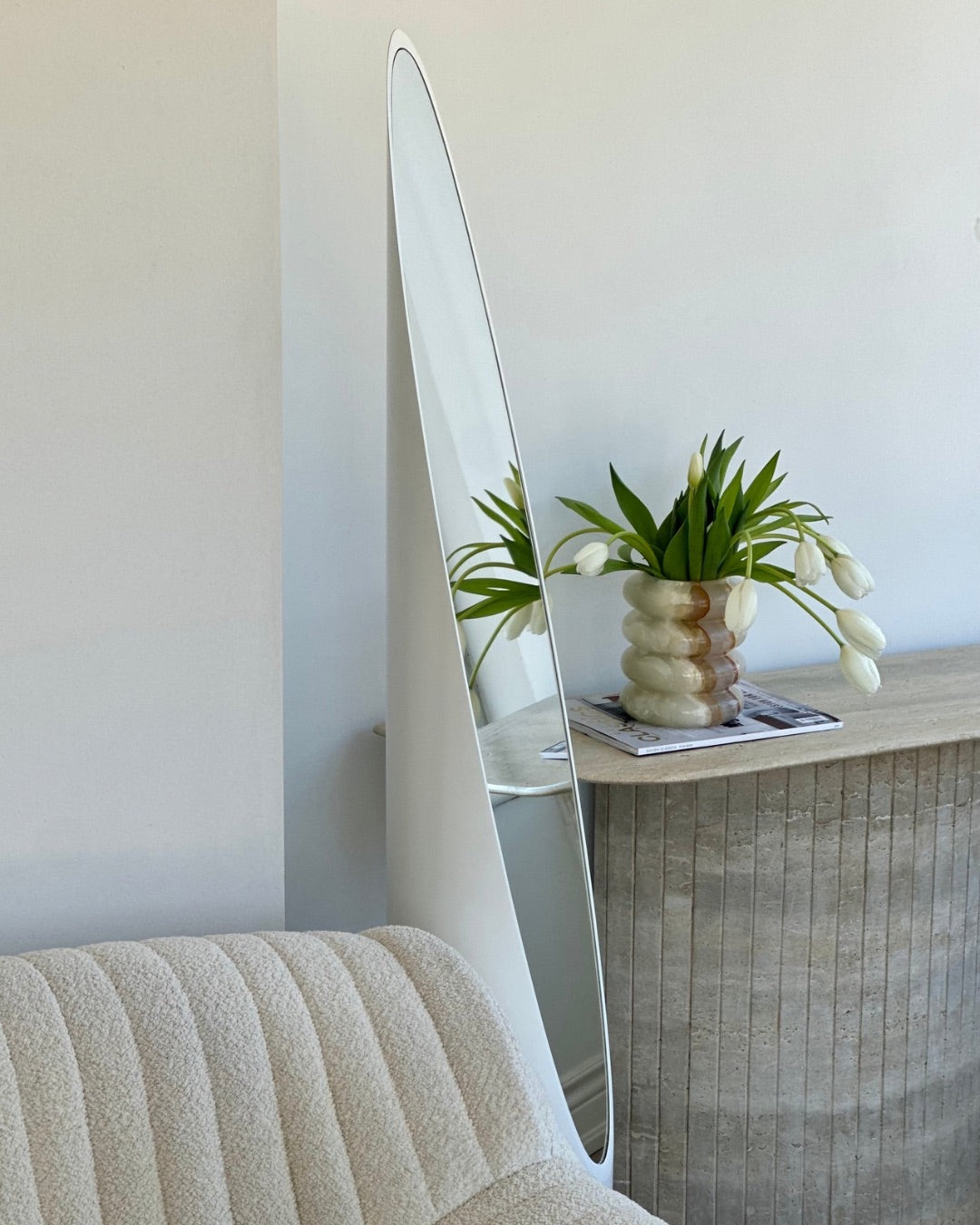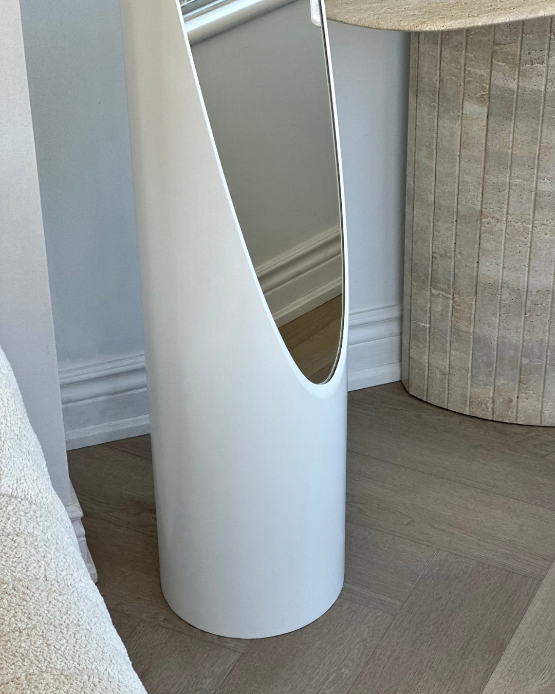Roger Lecal inspired lipstick mirror in excellent vintage condition. Resembling the iconic 1970s French design with identical sizing and proportions in a classic white. Suitable in nearly any space or corner. Two faint signs of wear to edging of mirror as shown in photos. Otherwise in like-new condition.