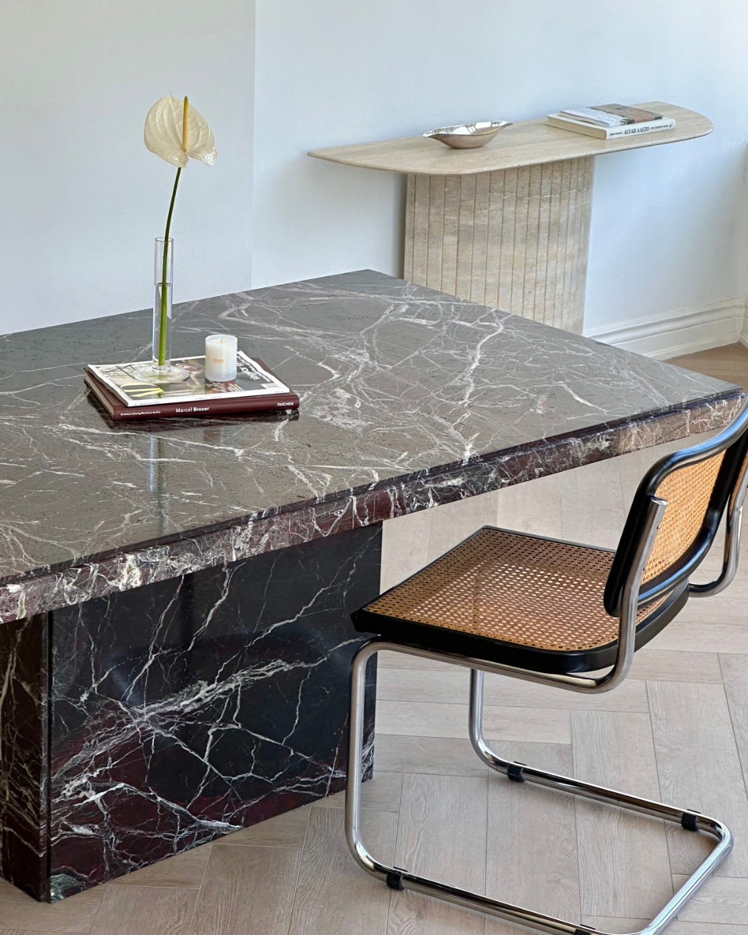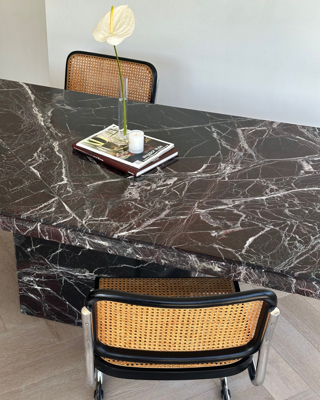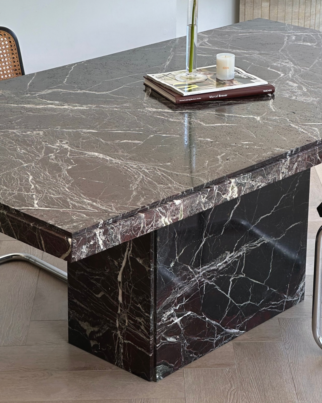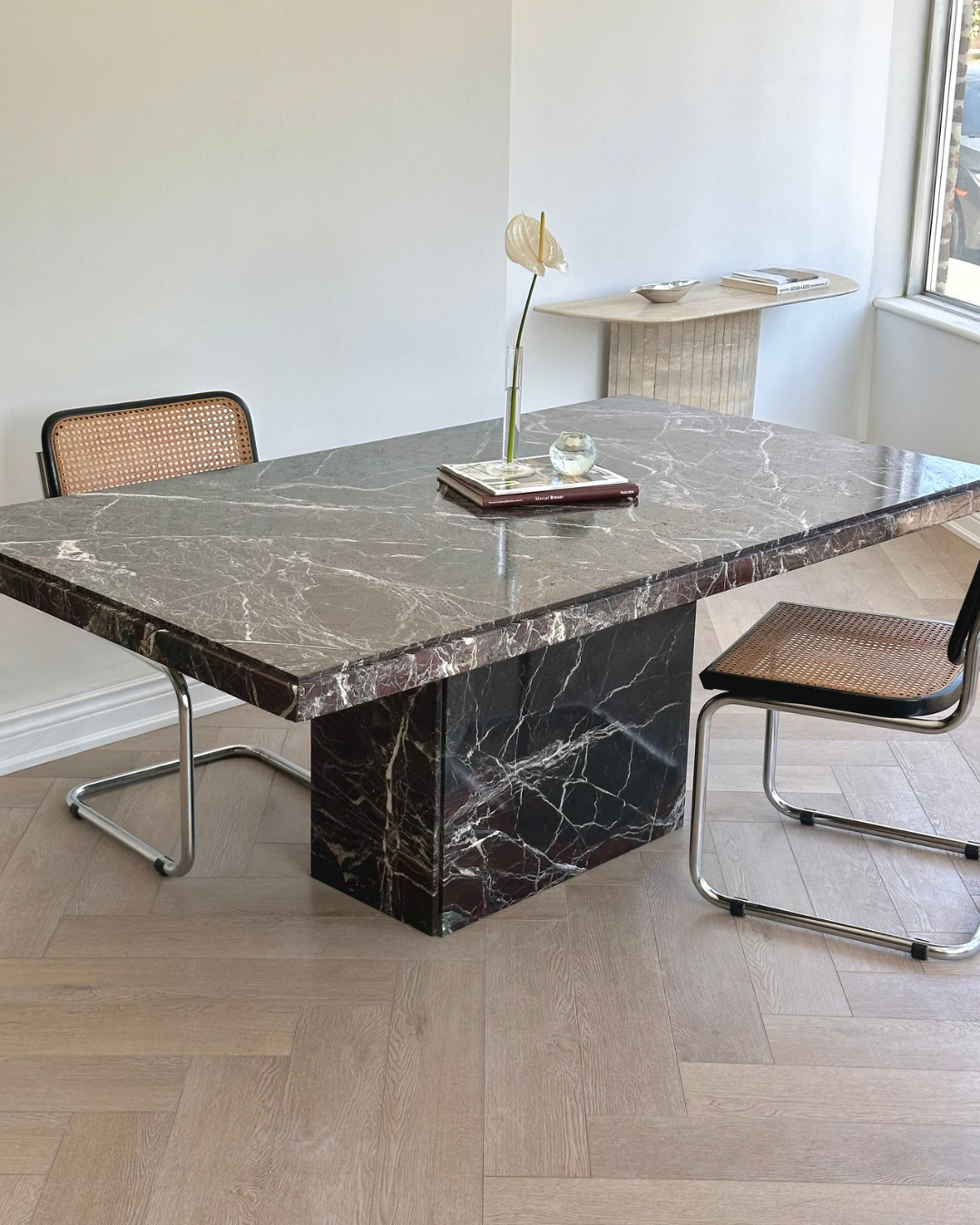 Rosso Levanto beveled-edge marble dining table in excellent vintage condition.