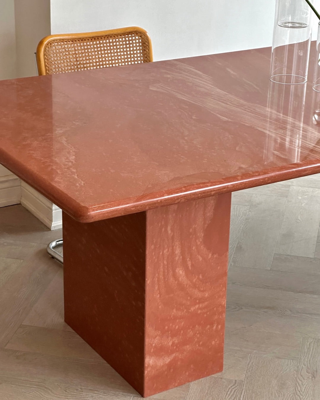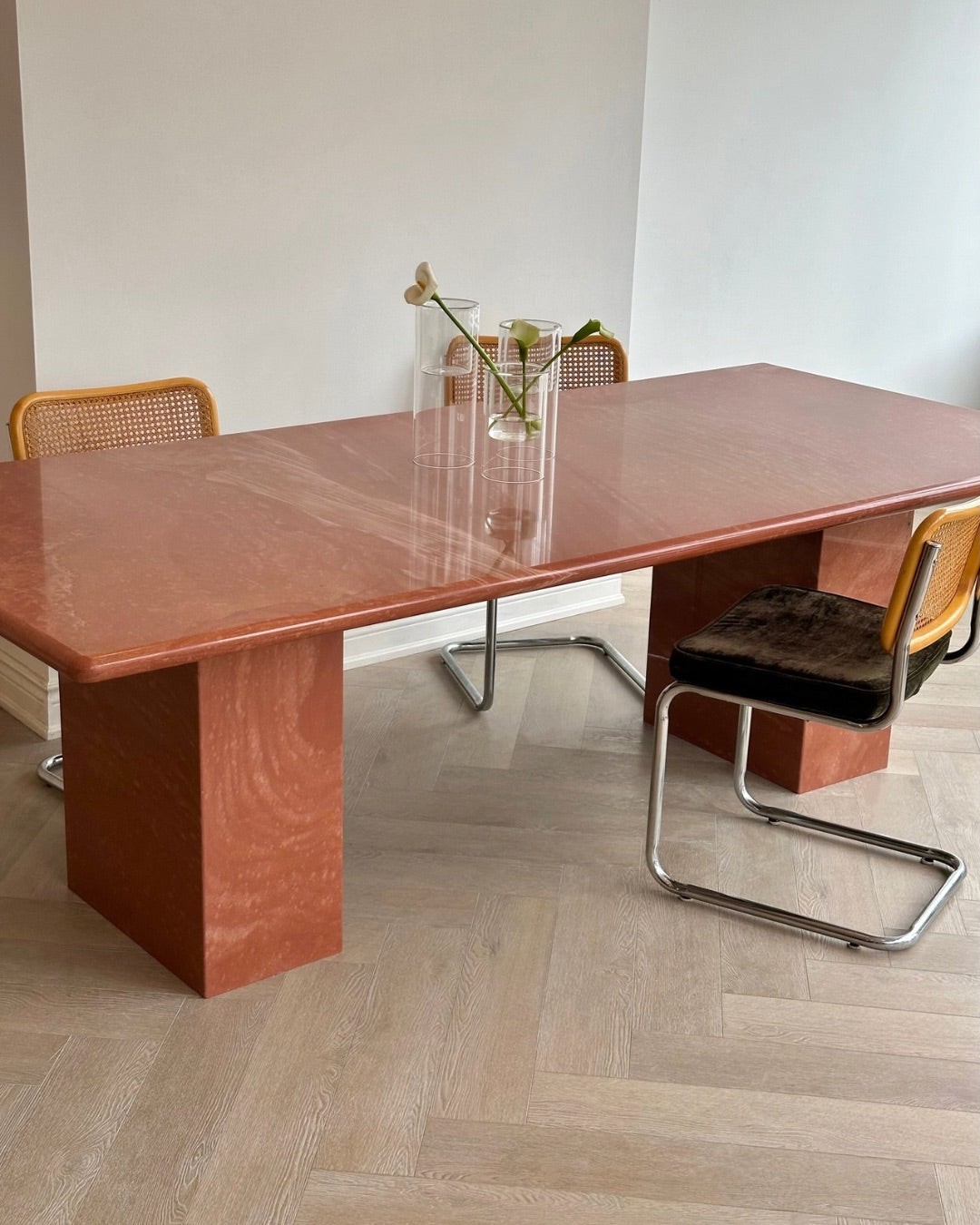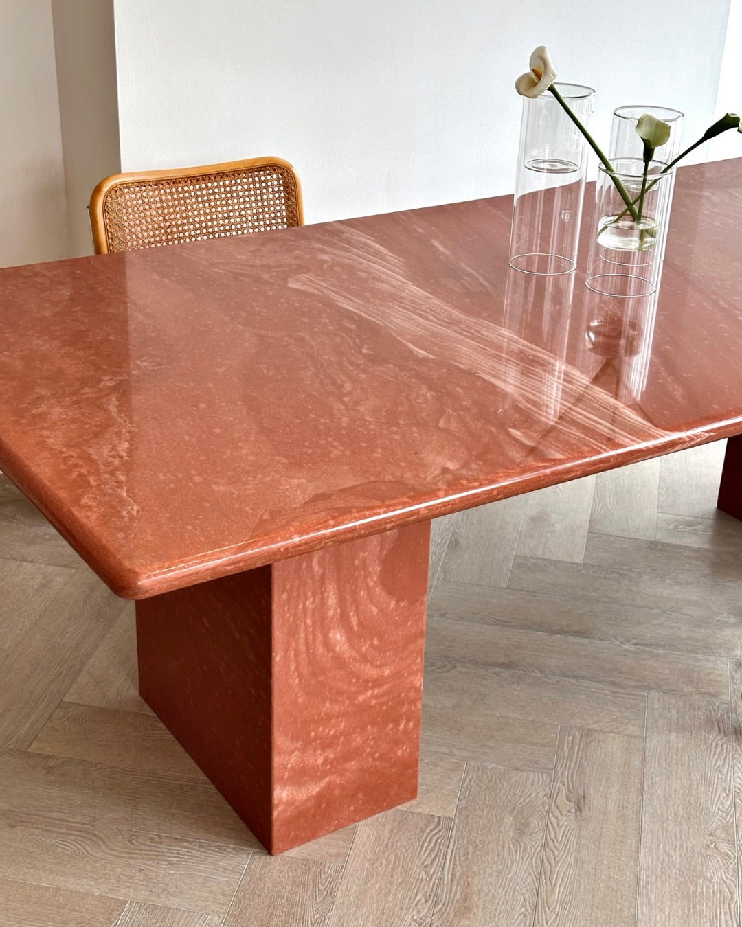 Striking Rosso Sandstone dining table in rare larger size format, seating 10-12. Double pedestal legs and double edged for a substantial appearance. Surface is polished to a high shine and is a more dense and durable stone less prone to stains and etching. A true statement piece.