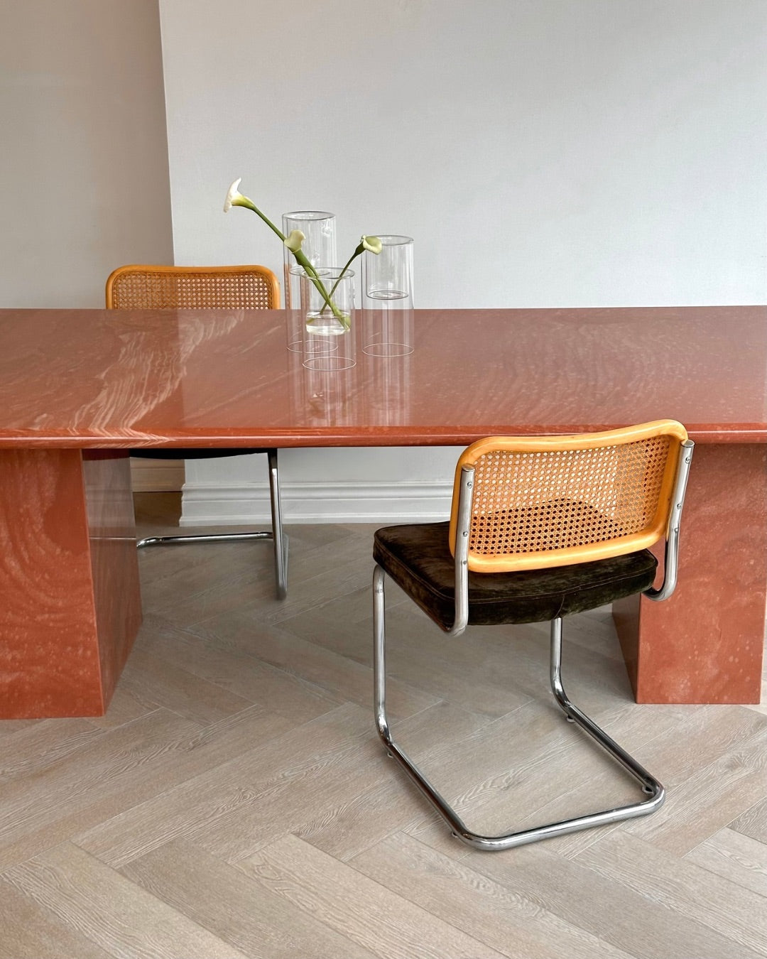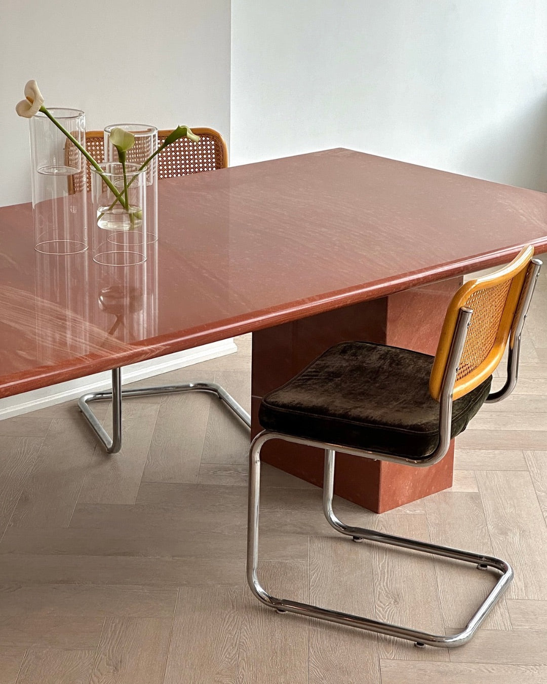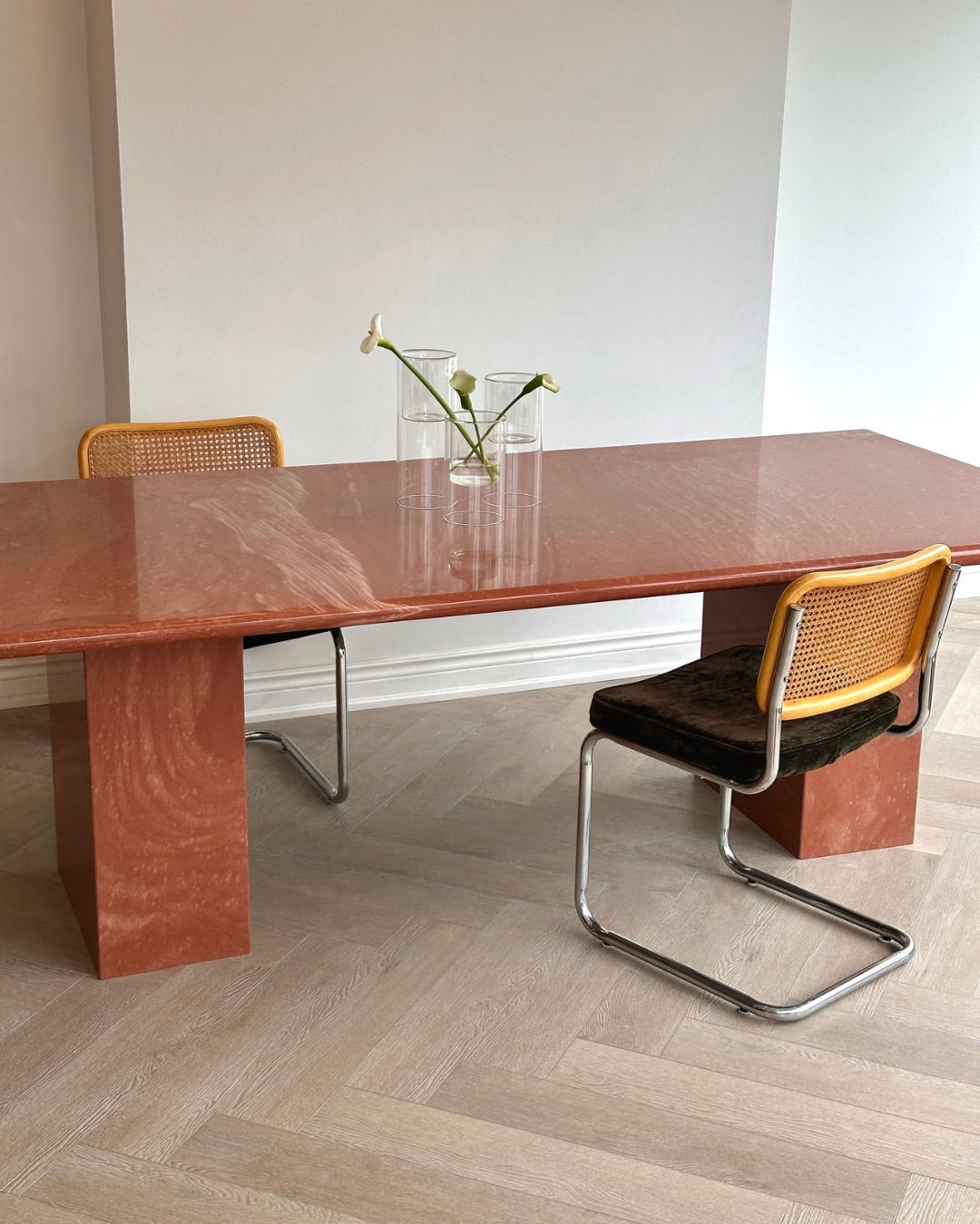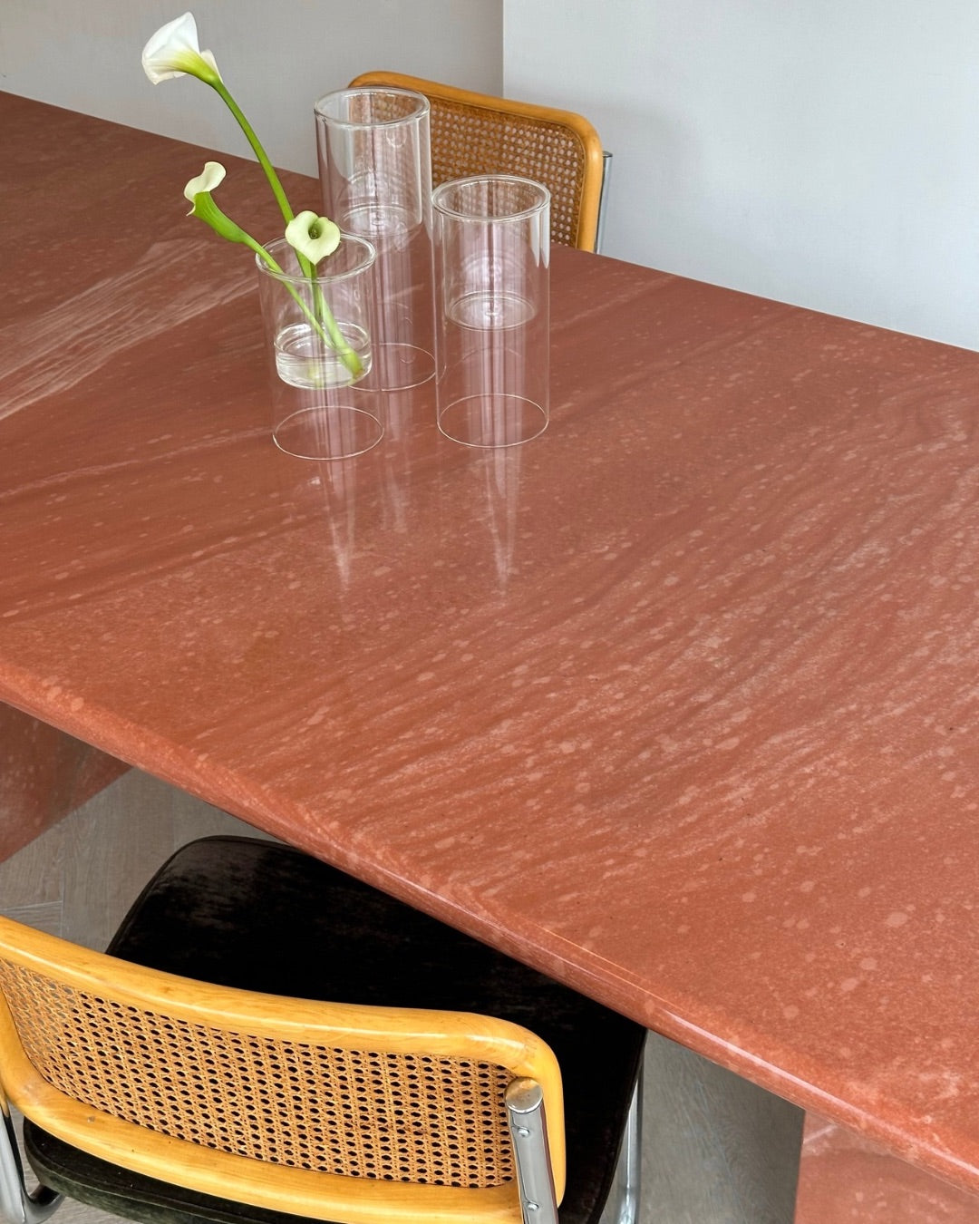 Striking Rosso Sandstone dining table in rare larger size format, seating 10-12. Double pedestal legs and double edged for a substantial appearance. Surface is polished to a high shine and is a more dense and durable stone less prone to stains and etching. A true statement piece.