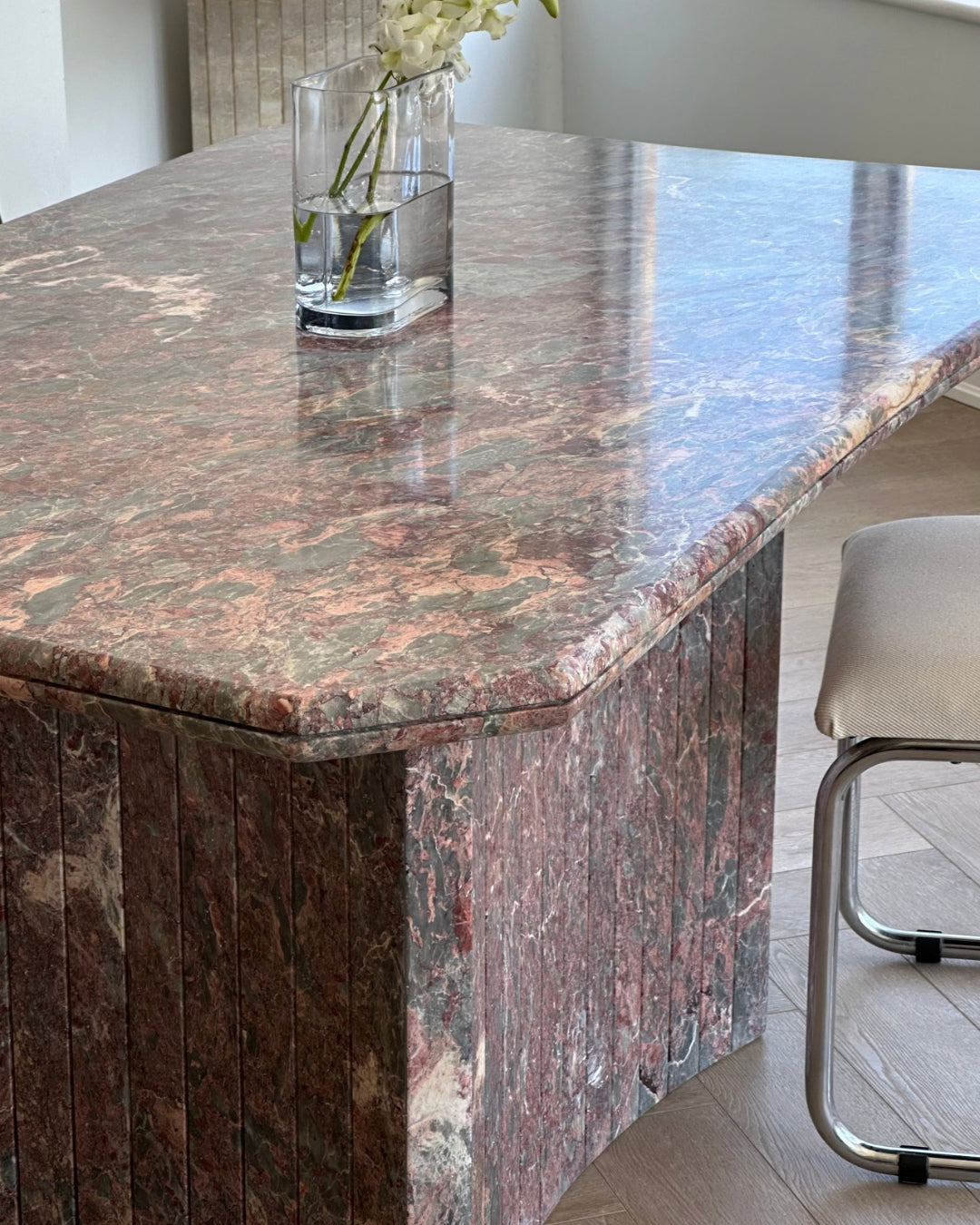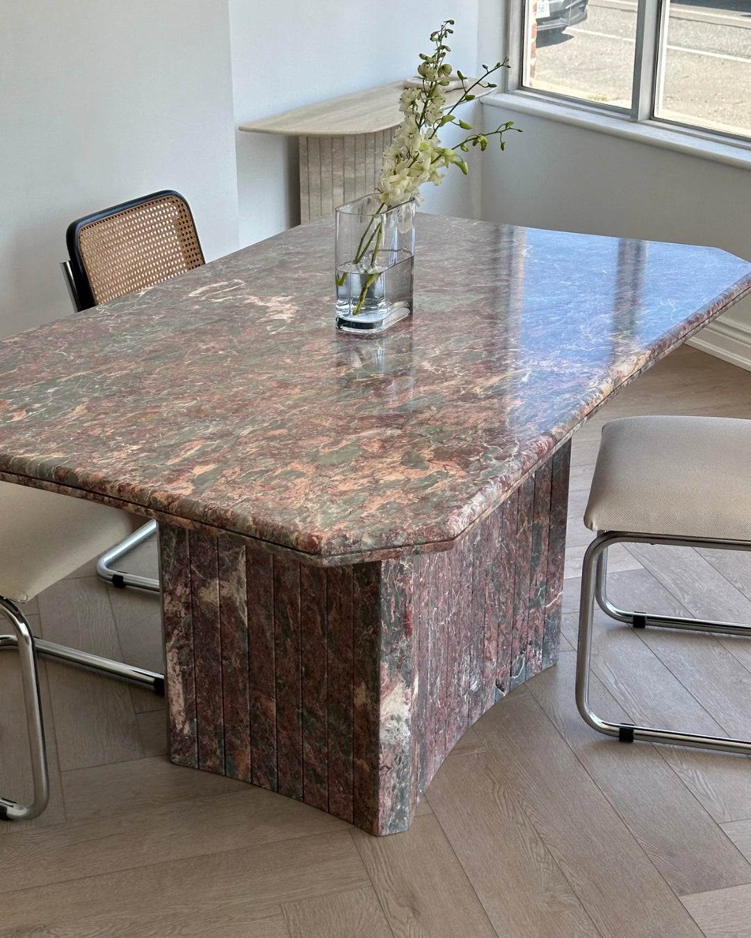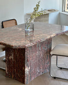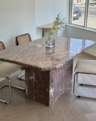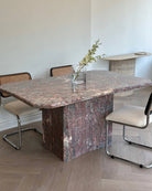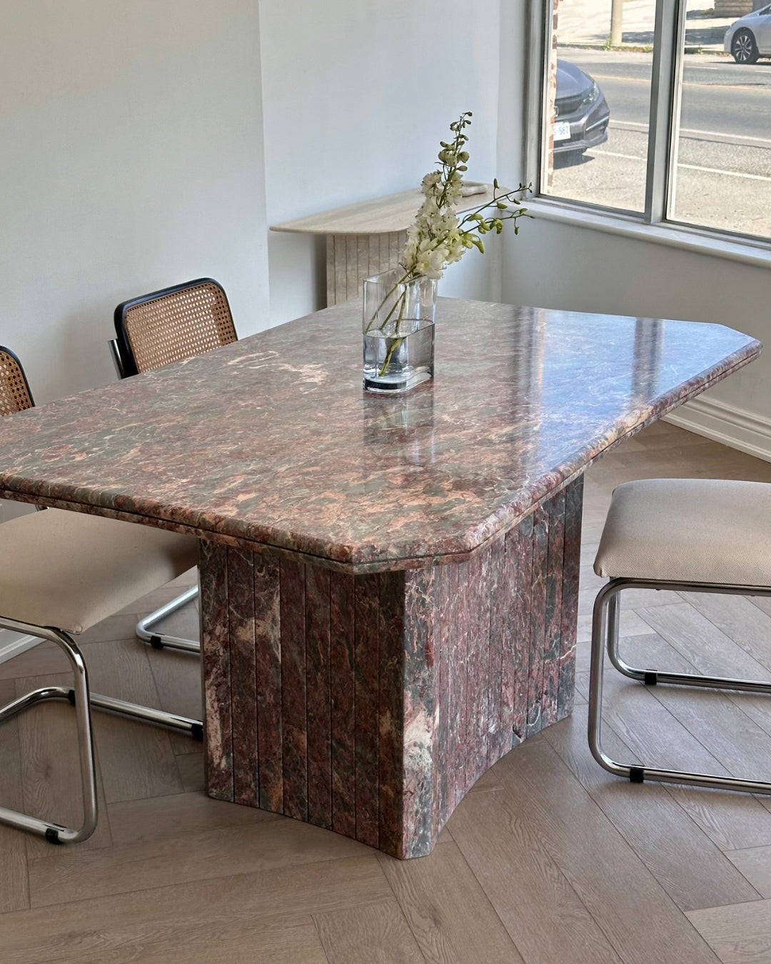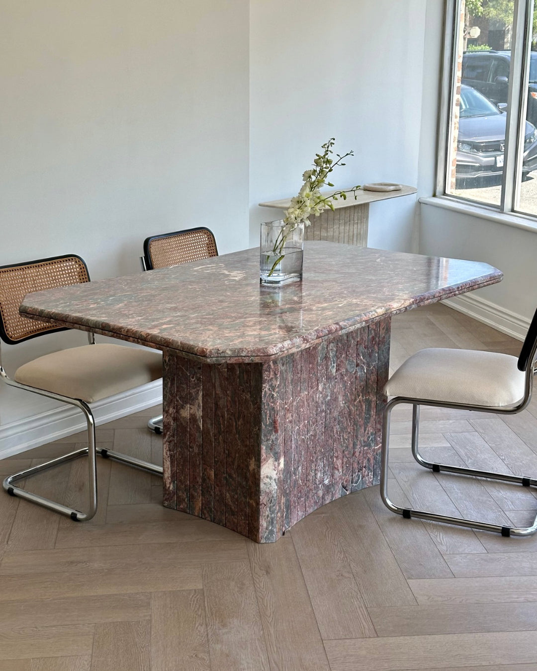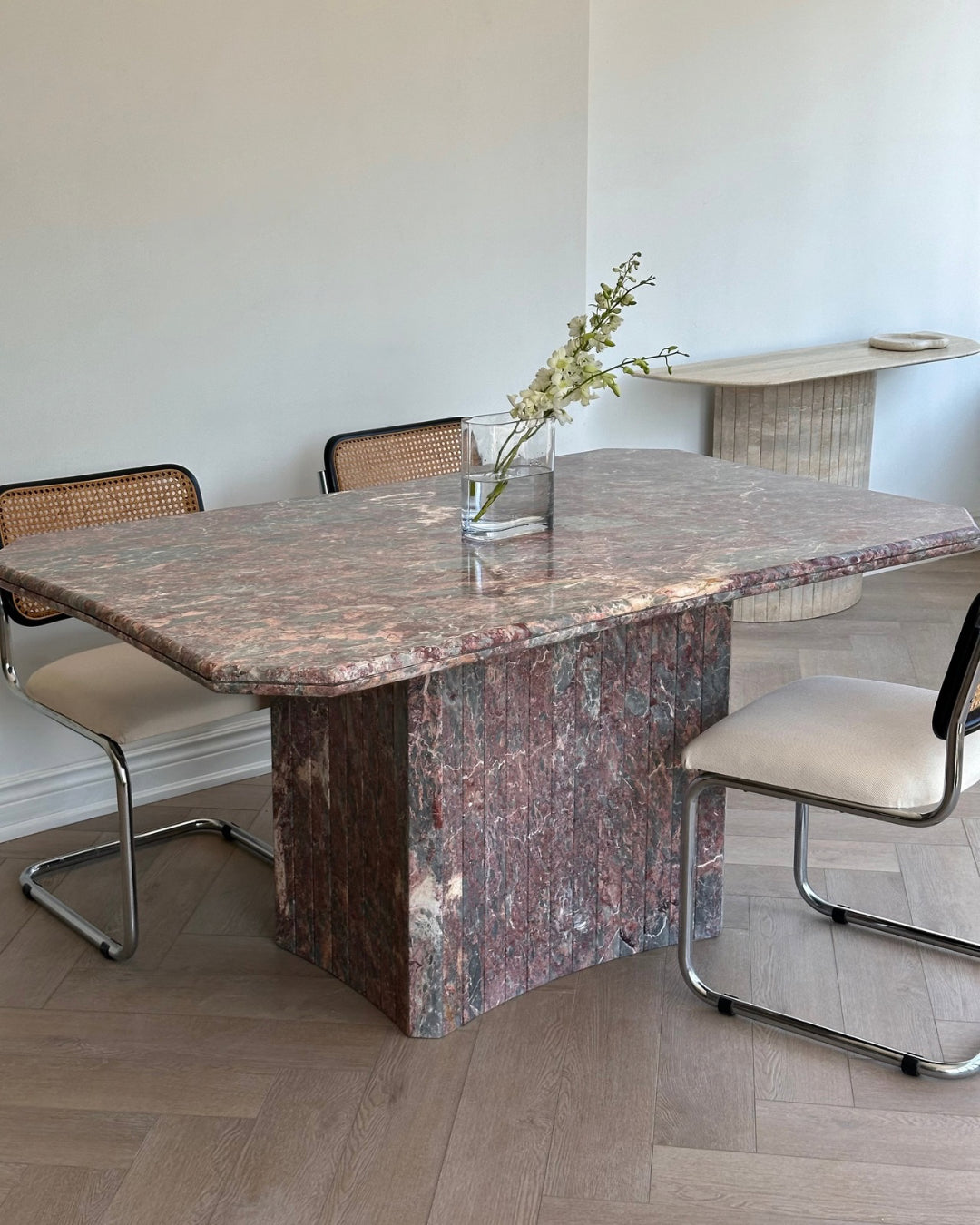 Turkish Salome marble dining table in excellent vintage condition. Salome marble is known for its solid and striking hues of pink, grey, ivory and lilac. Surface has been professionally polished and sealed. Minimal age-related wear. A rare smaller-sized rectangular piece seating 4-6 comfortably.