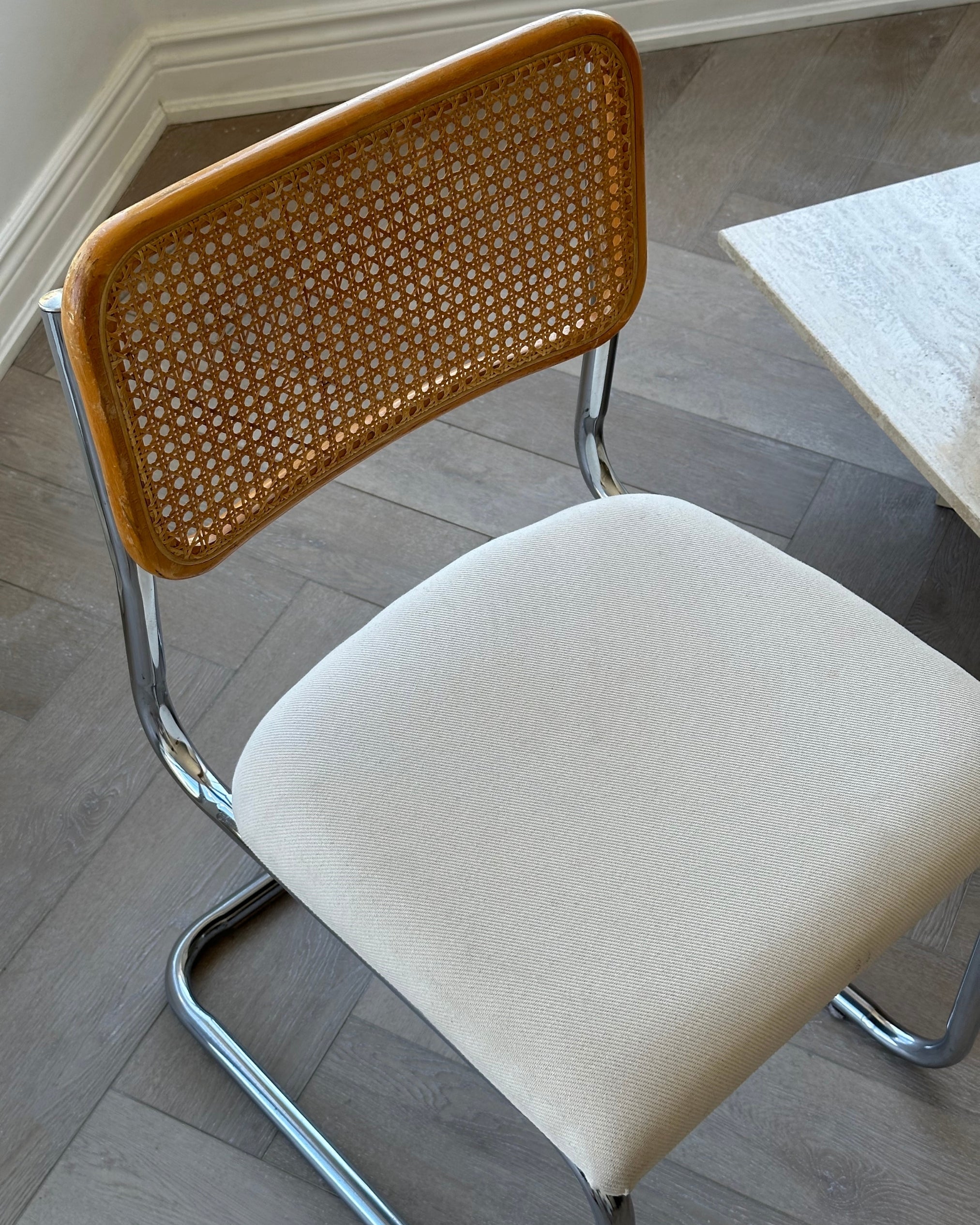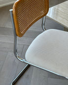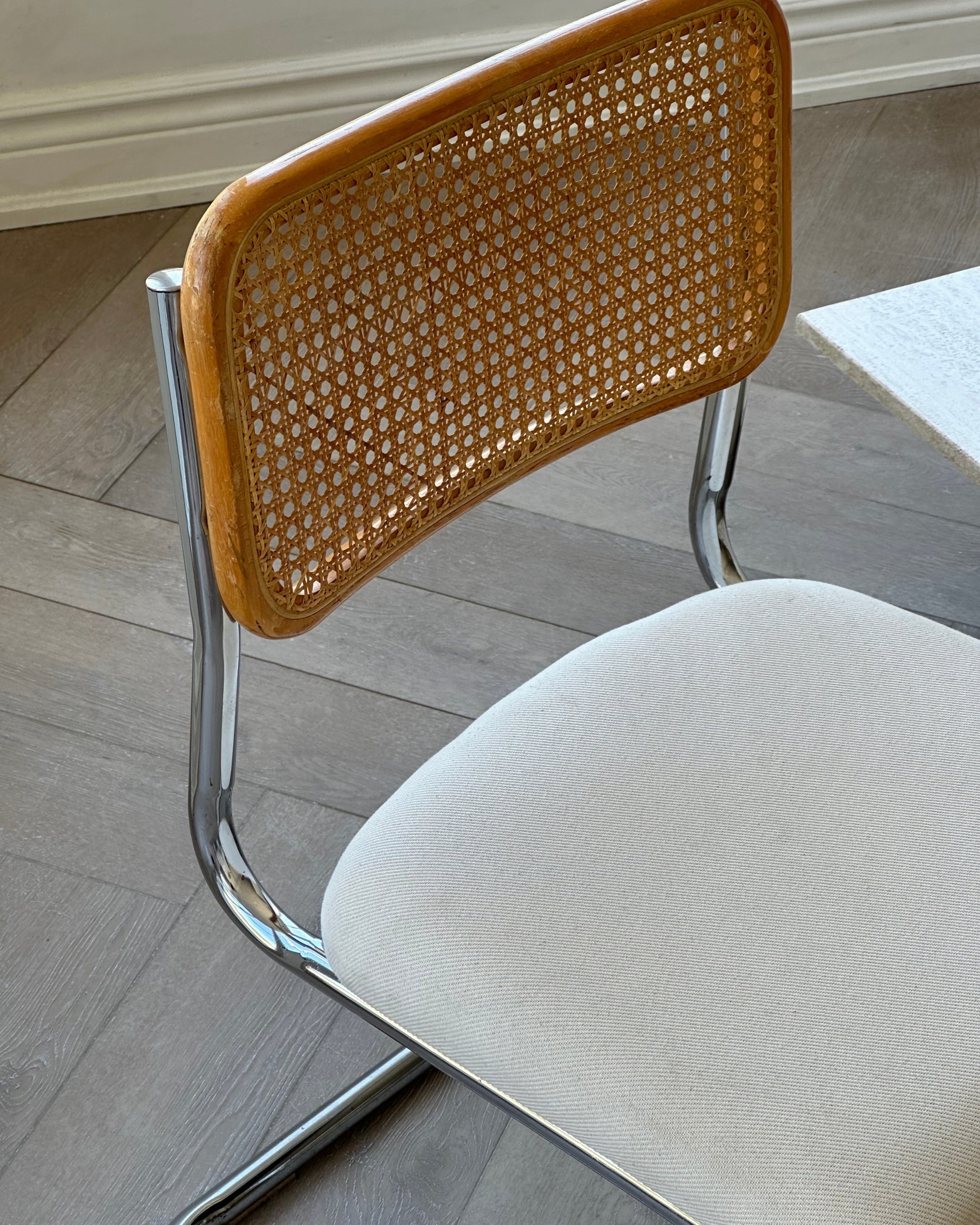Pair of upholstered Cesca-style chairs. Sold as a set of 2. Chrome and wood framing in great vintage condition, with only minimal signs of age-related patina. No major holes or tears to caning. Current upholstery is a durable beige canvas, however, custom fabric and upholstery of your choice can be included at no extra cost.