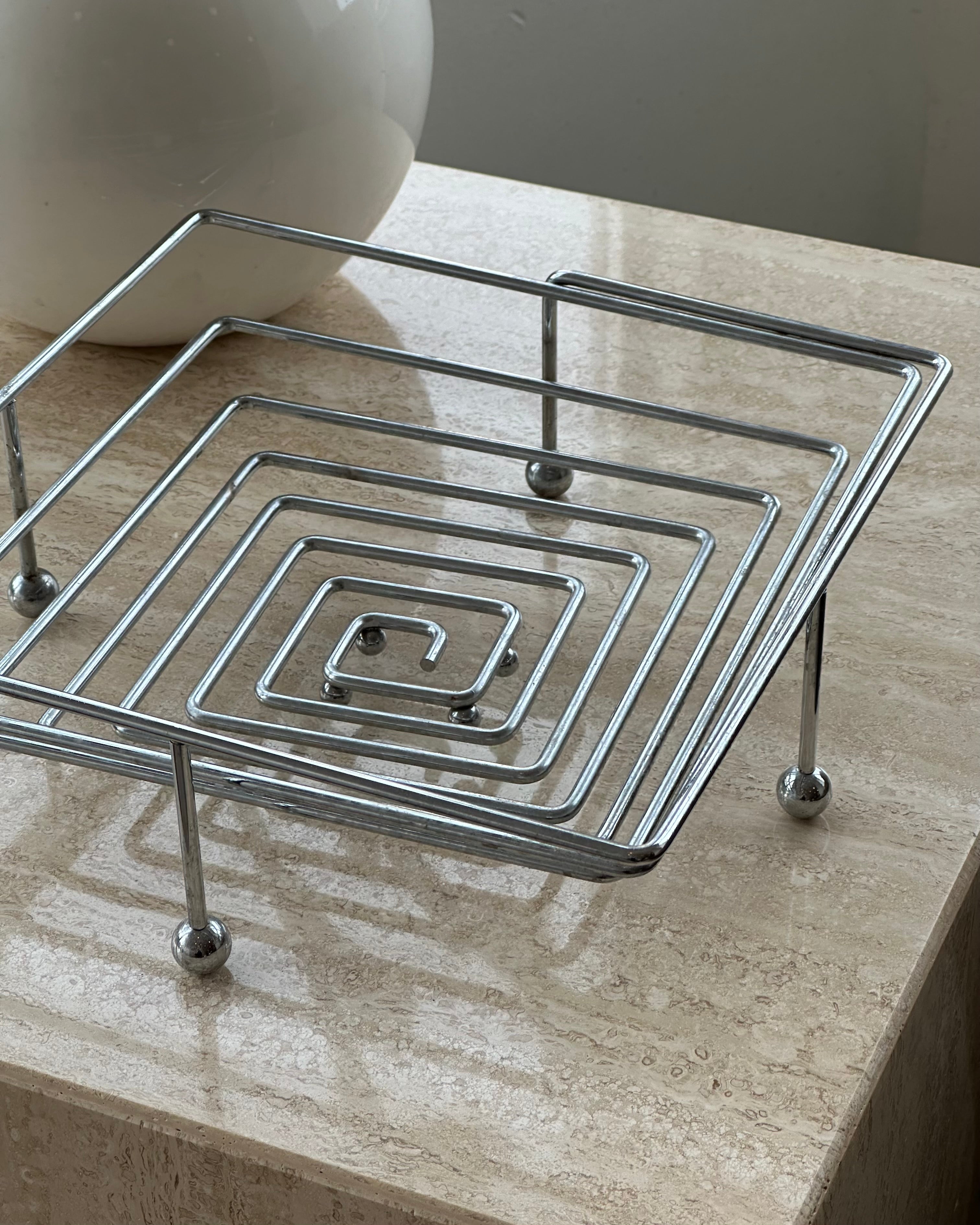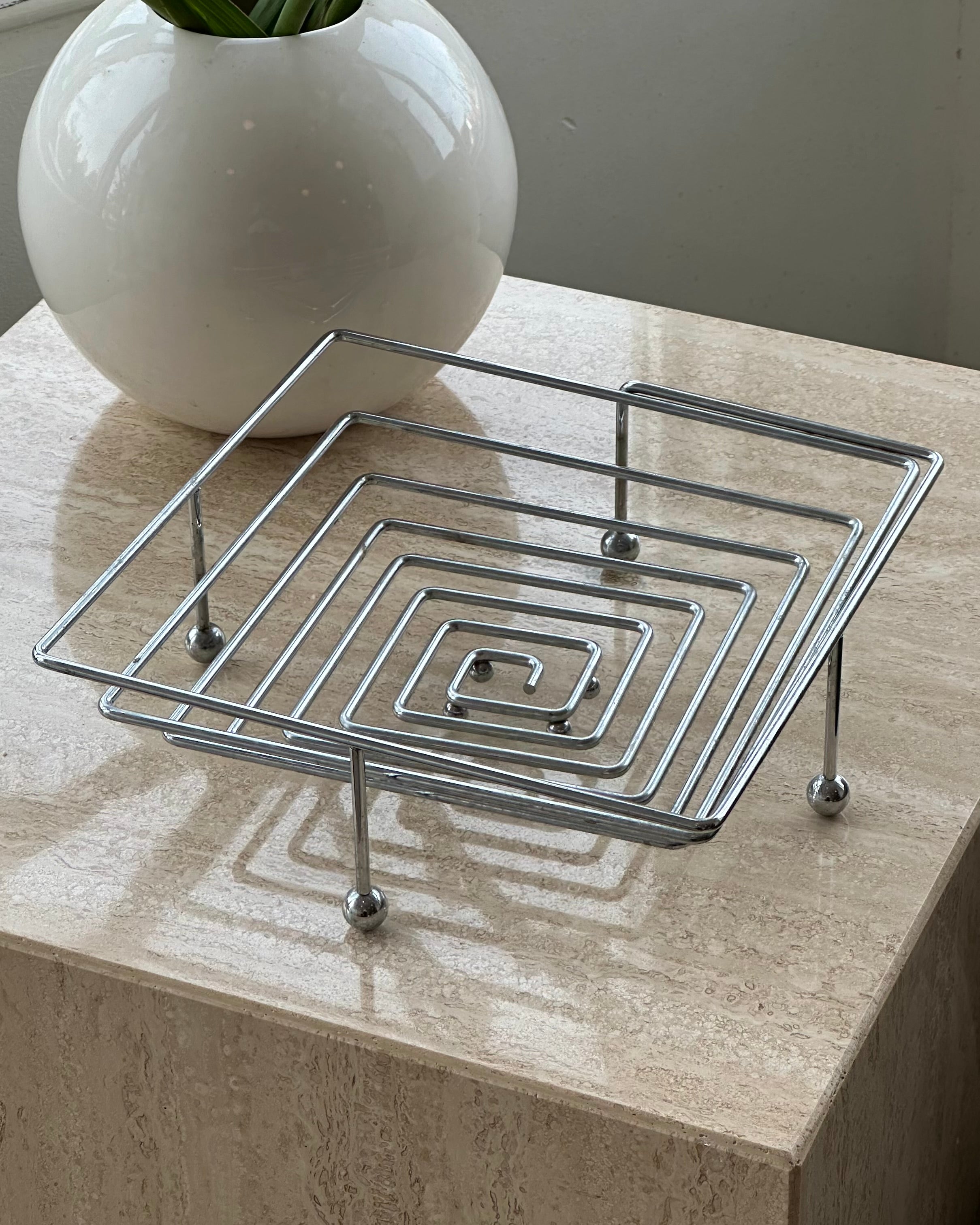 Vintage Space Age chrome fruit basket in excellent condition, features 4 stemmed legs and a floating accordion style spiral frame.