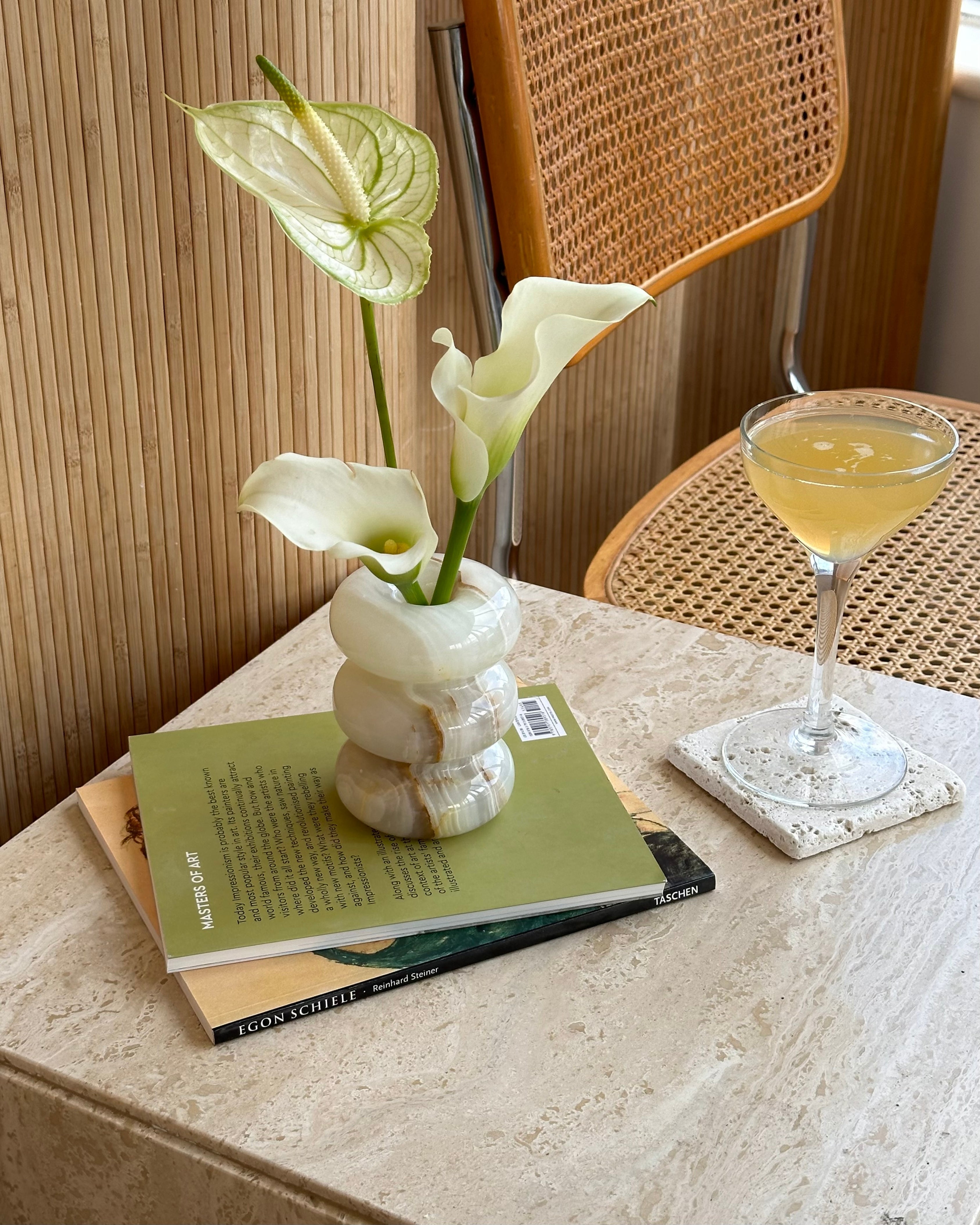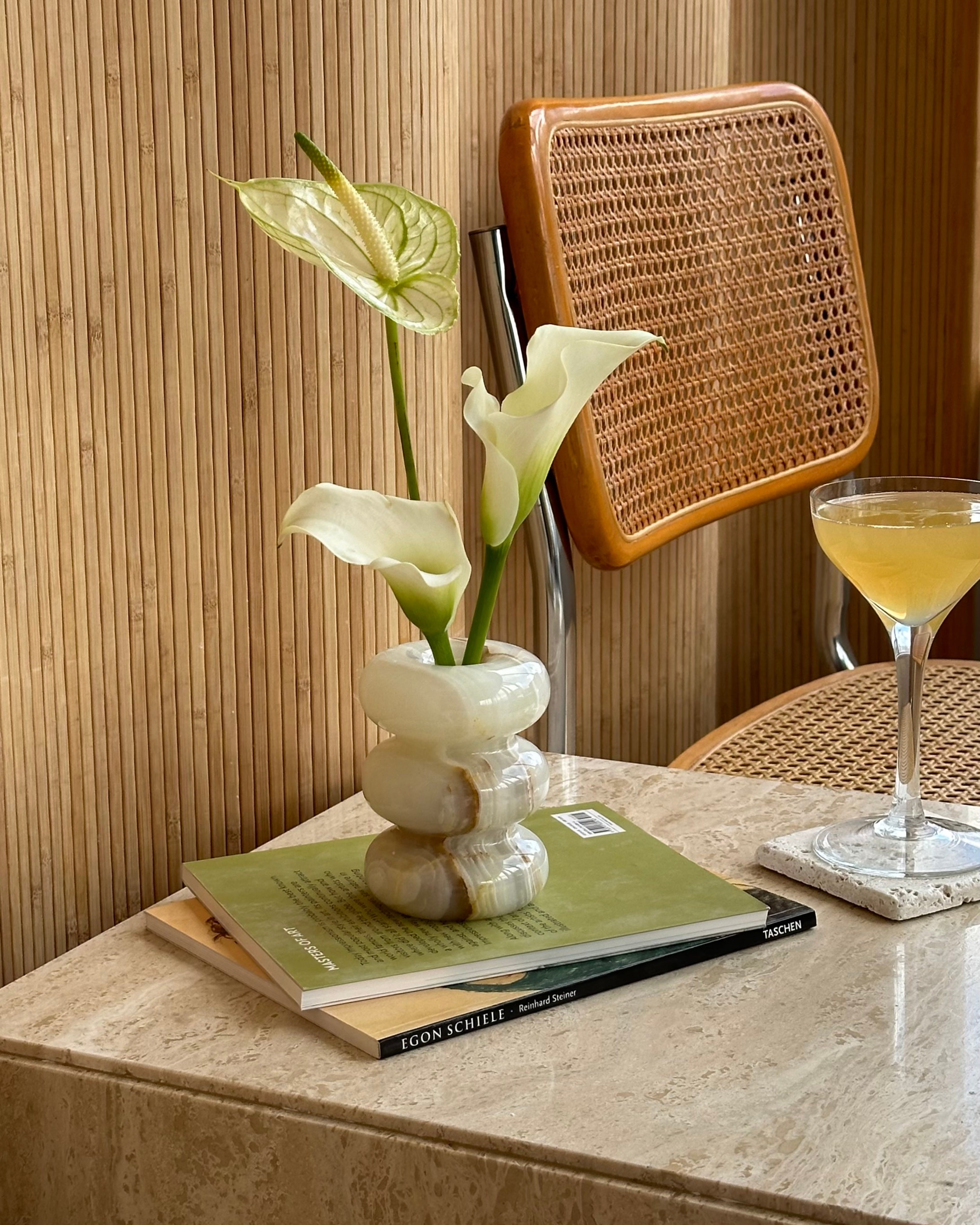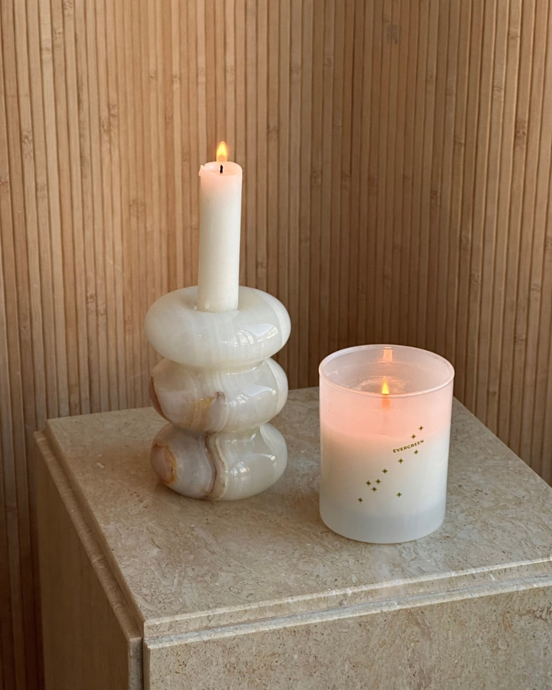 Introducing the Bubble Candleholder; a piece from our in-house designed collection. Made from hand-carved and polished Alabaster stone known for its striking translucent tones of ivory, amber and browns. Each piece will vary in veining and is one-of-a-kind. Updated design has a second narrower insert for florals and incense. Priced individually.
