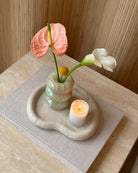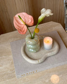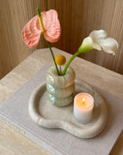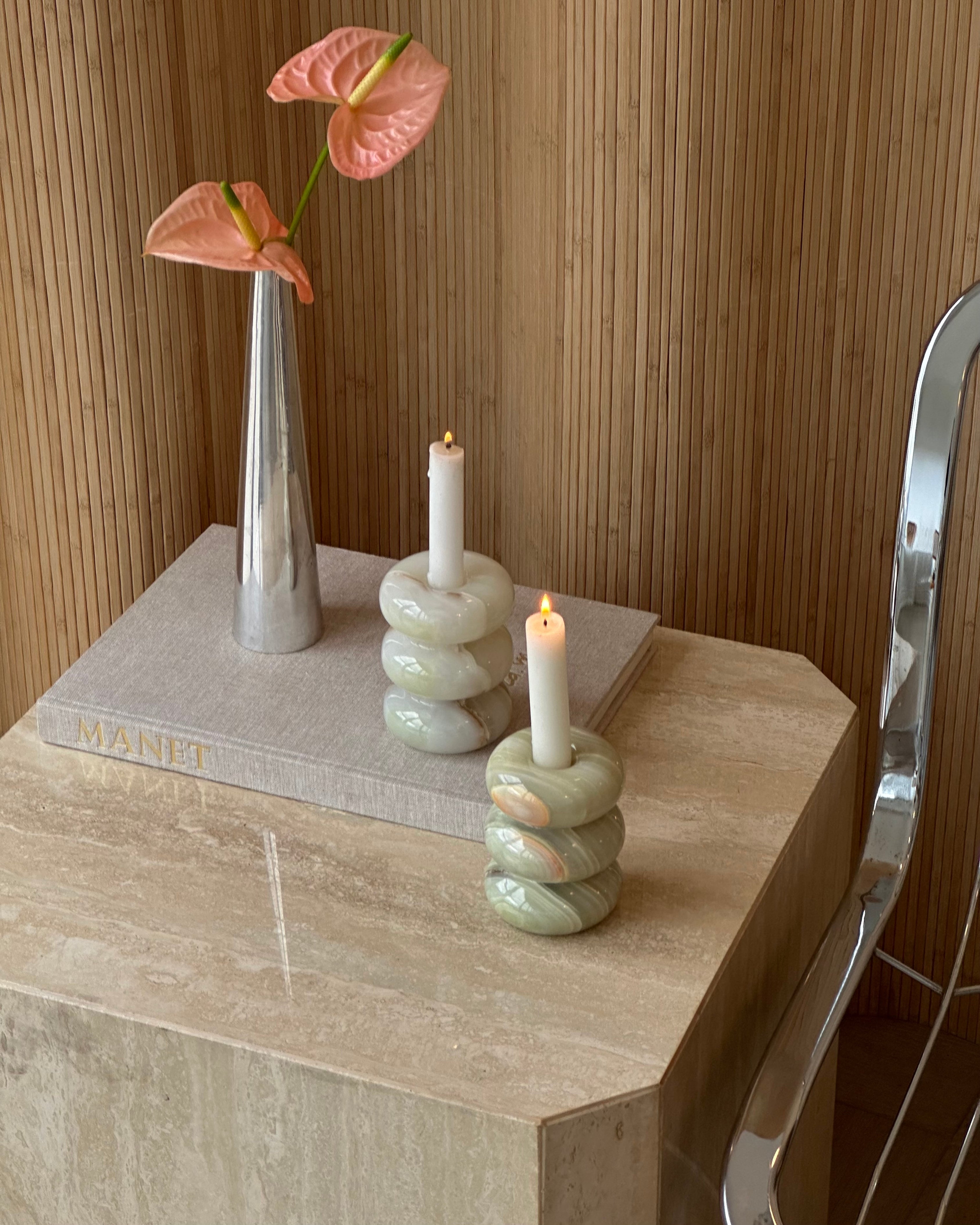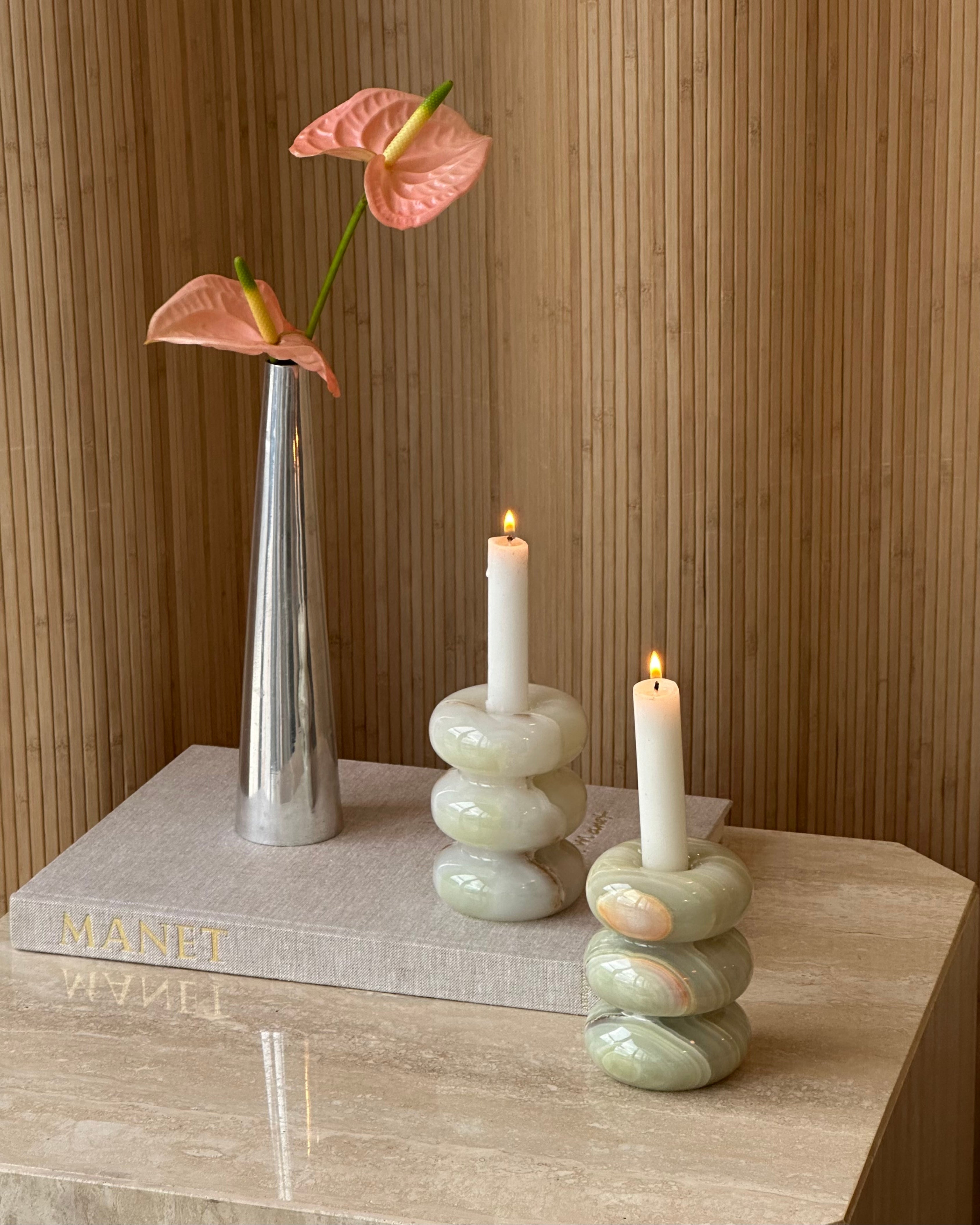 Introducing the Bubble Candleholder; a piece from our in-house designed collection. Made from hand-carved and polished light green Onyx marble known for its striking translucent tones of light green and ivory. Updated design has a second narrower insert for florals and incense. Priced individually.