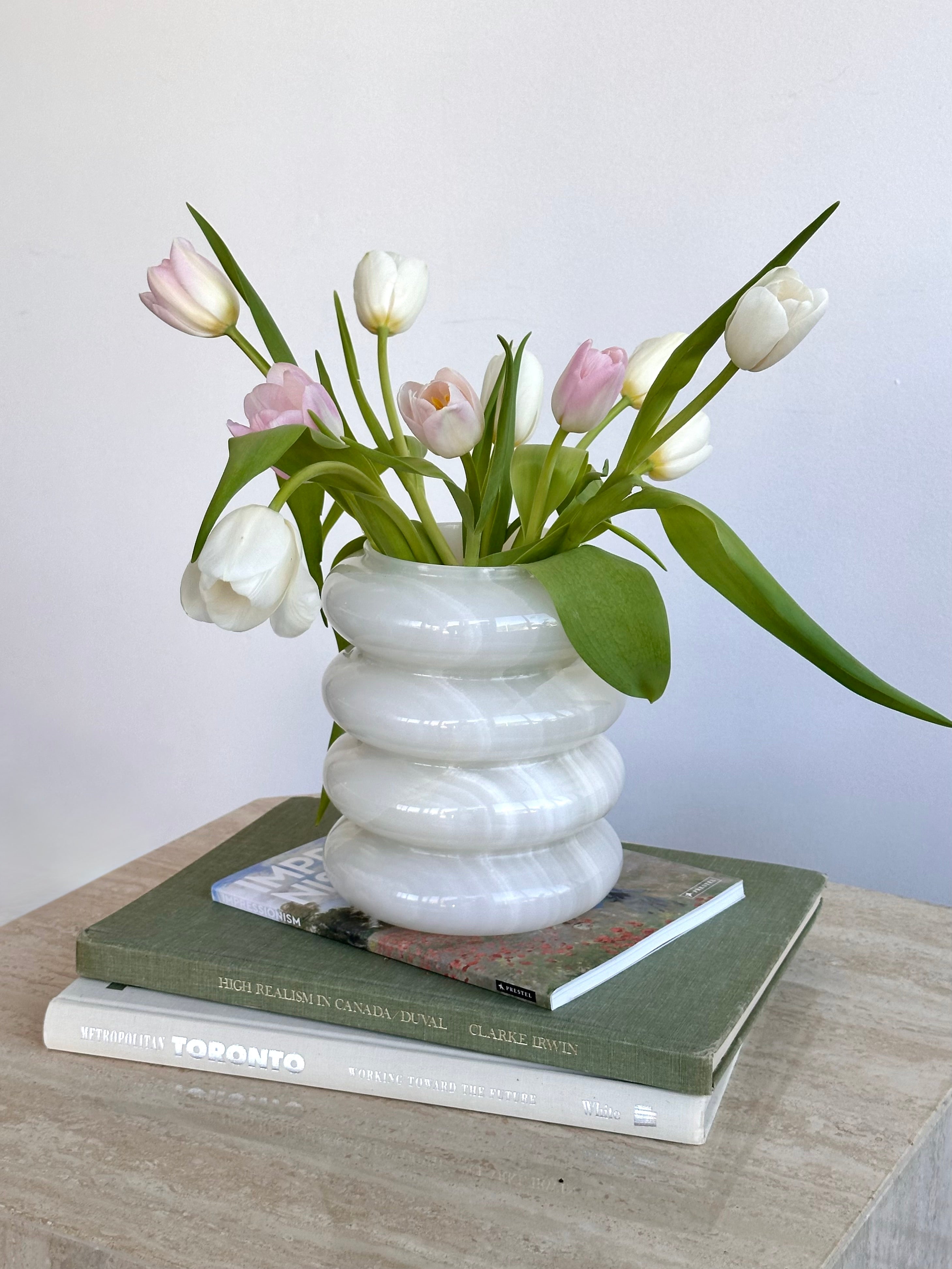 Introducing the Bubble Vessel. Made from hand-carved and polished white Alabaster stone. This beautiful stone features subtle undertones of orange and brown. We designed this piece to be multi-purpose: use it as a flower vase, for utensils, or chill the vessel for use as a wine and bottle chiller.