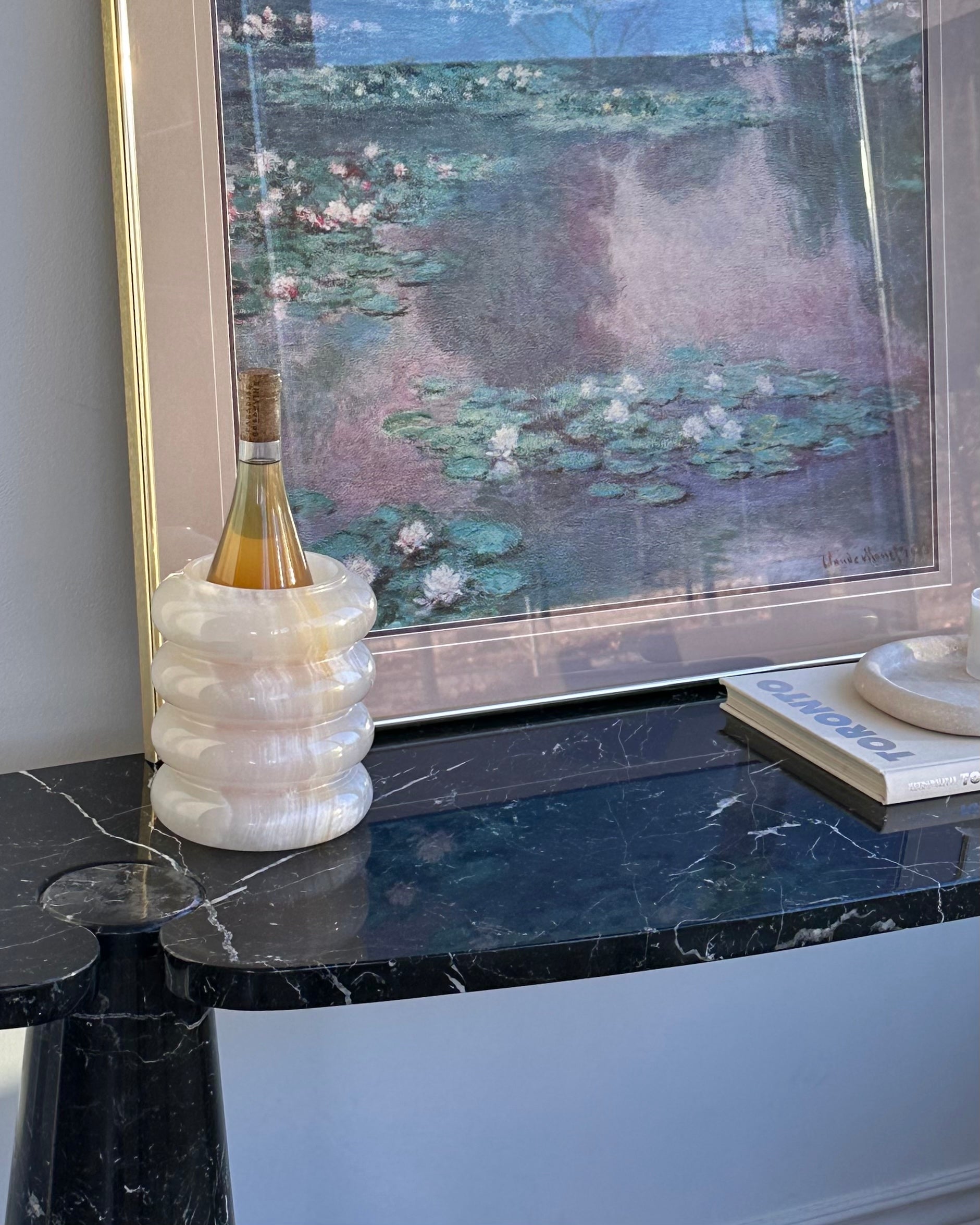 Introducing the Bubble Vessel, a piece from our in-house designed collection. Made from hand-carved and polished white Alabaster Stone known for its gorgeous translucent ivory tones. We designed this piece to serve multiple purposes; use it as a flower vase, utensil holder, or chill the vessel or top with ice for a wine and bottle chiller. It also looks stunning as a candle vessel allowing for a soft flowing interior.