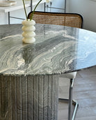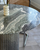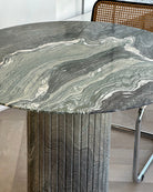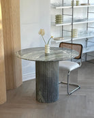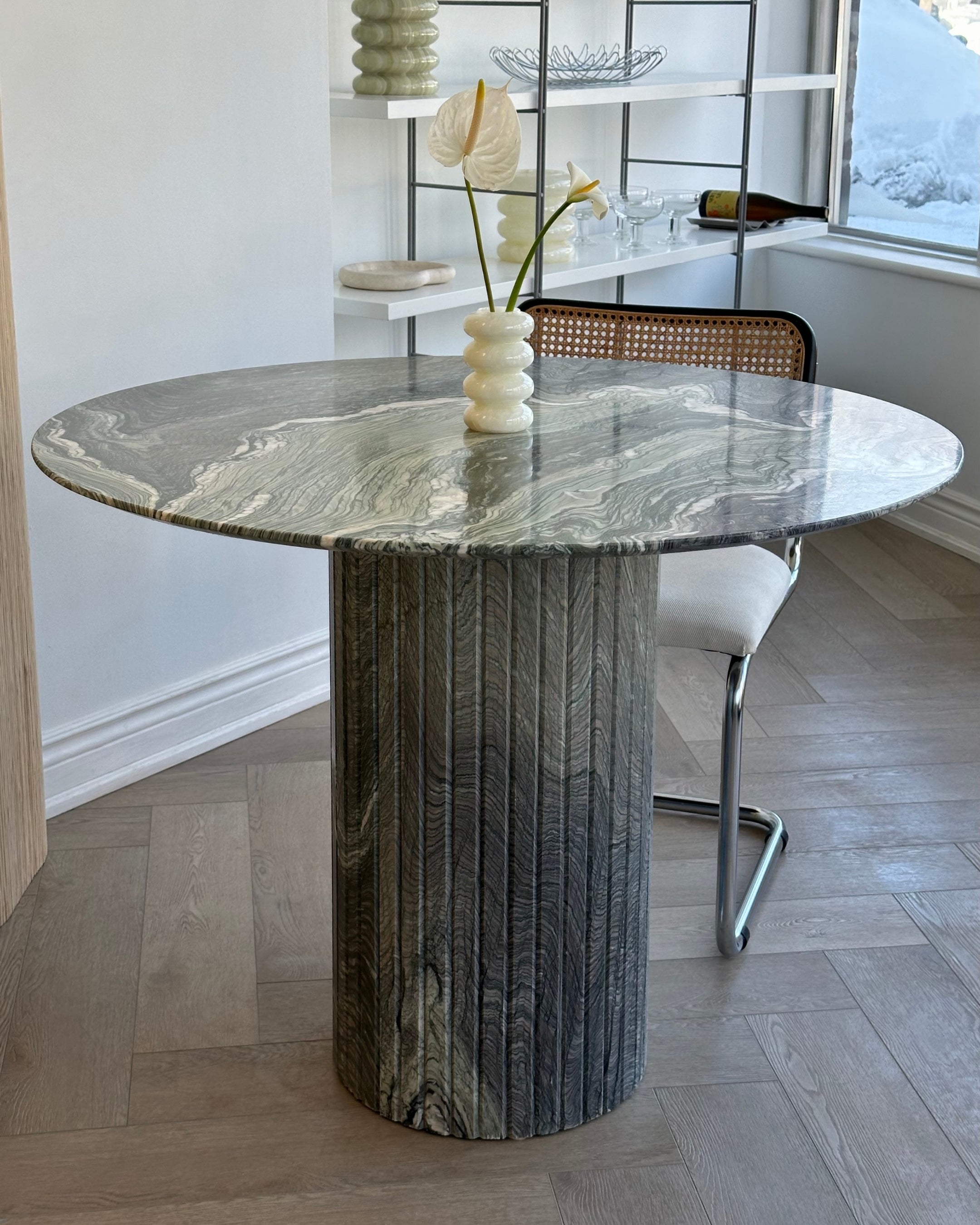 Introducing the Verde Luana Dinette Table from our in-house collection. Crafted from hand selected, incredibly rare Tuscan Italian Verde Luana marble with gorgeous veining throughout and a satin-like finish. The detailed fluted base adds to its timeless design, while its smaller-sized top was designed with functionality in mind. Suitable for kitchenettes, condos and smaller spaces. Seats 4 comfortably.