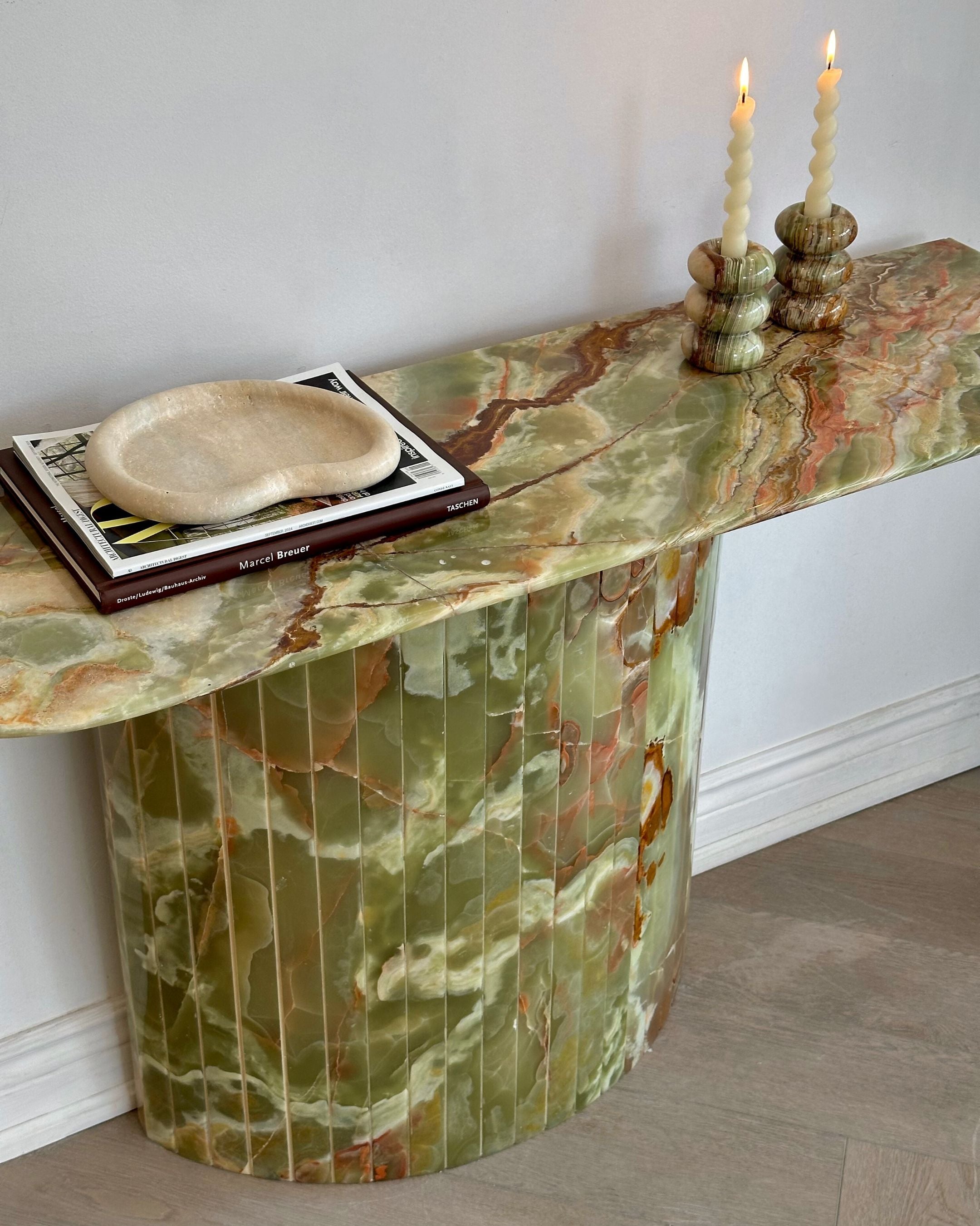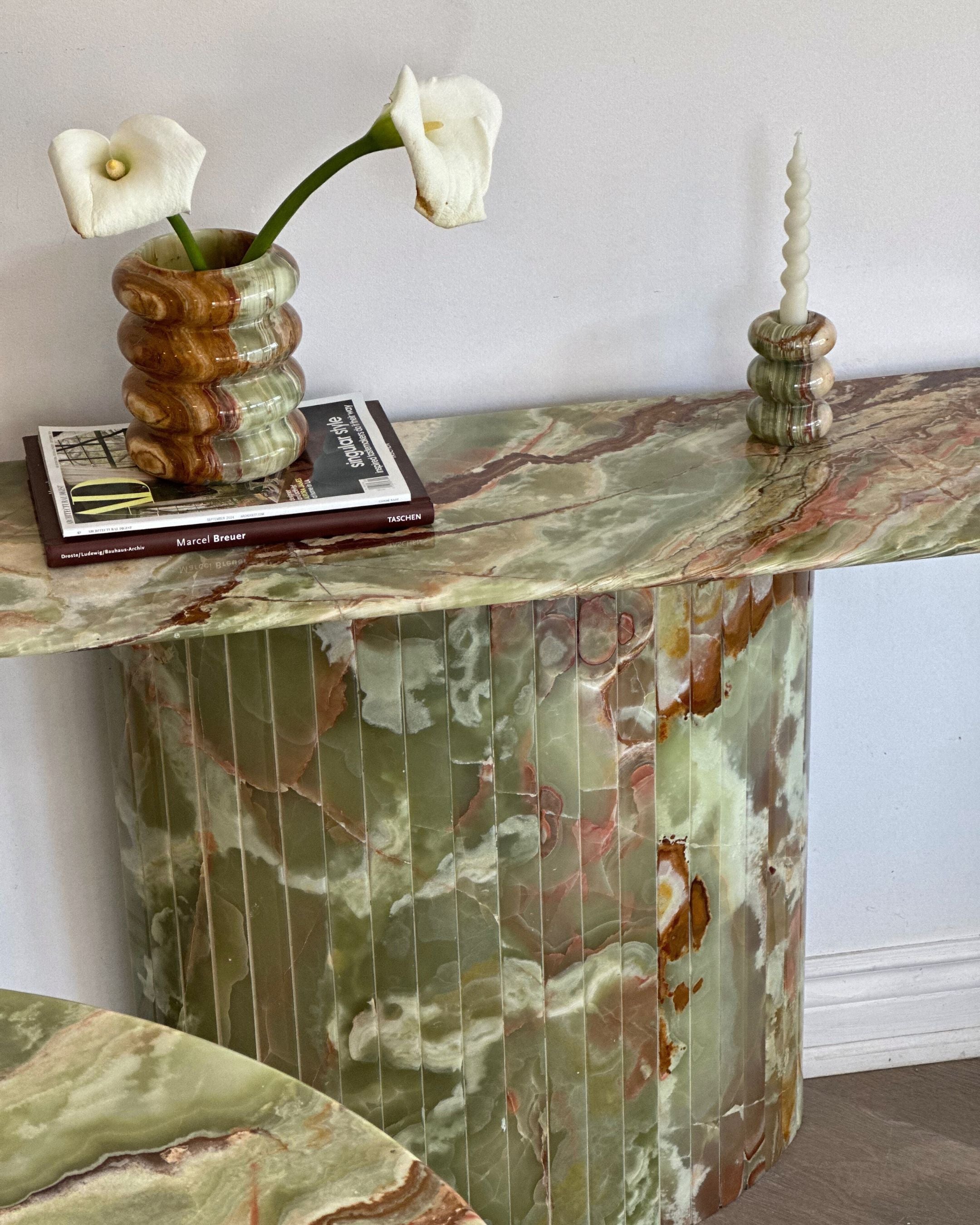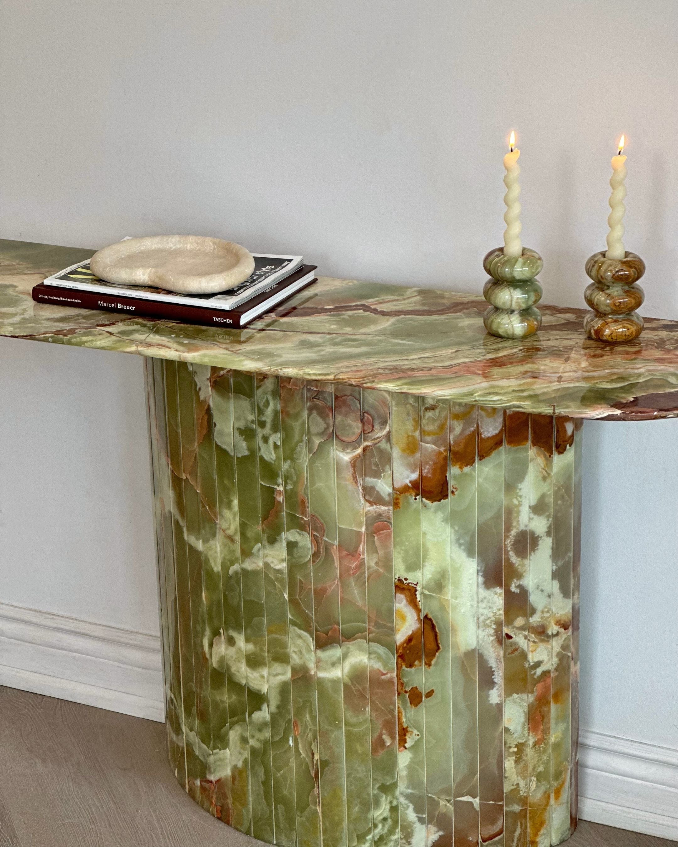 Introducing the Green Onyx Console Table. Crafted from hand selected and incredibly rare Onyx sealed and brought to a high polish finish. The detailed fluted base adds to its timeless design, while its crescent top was intentionally designed not to disrupt the flow when placed in an entryway or hallway.