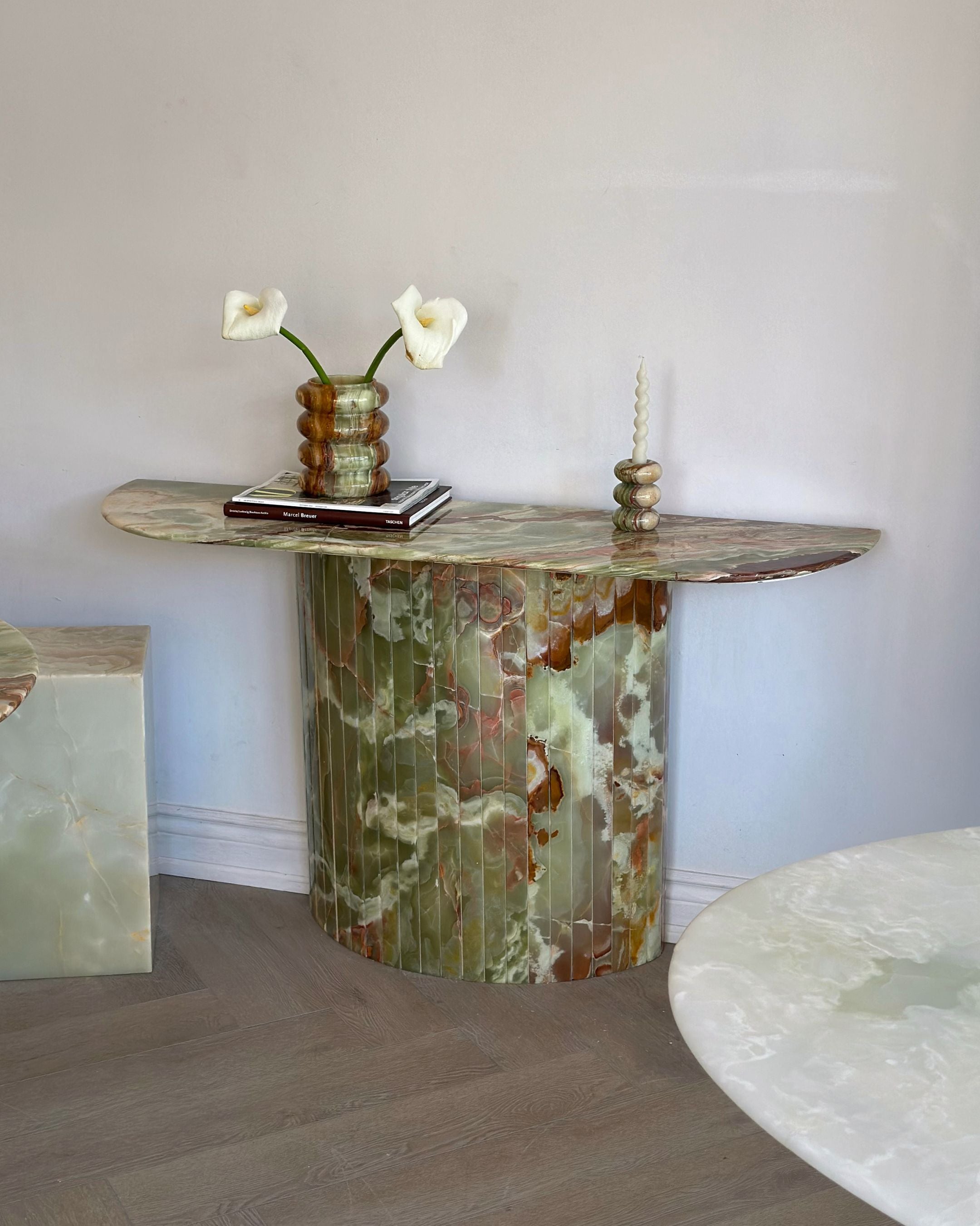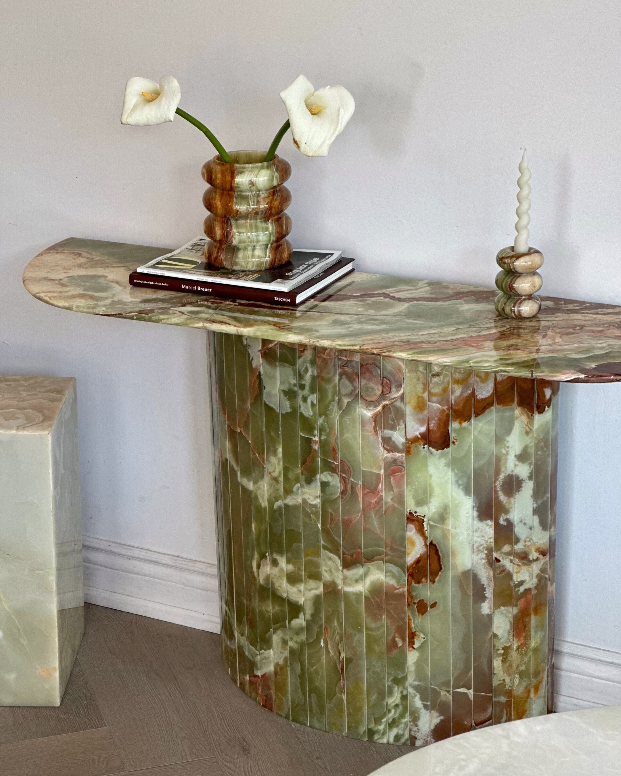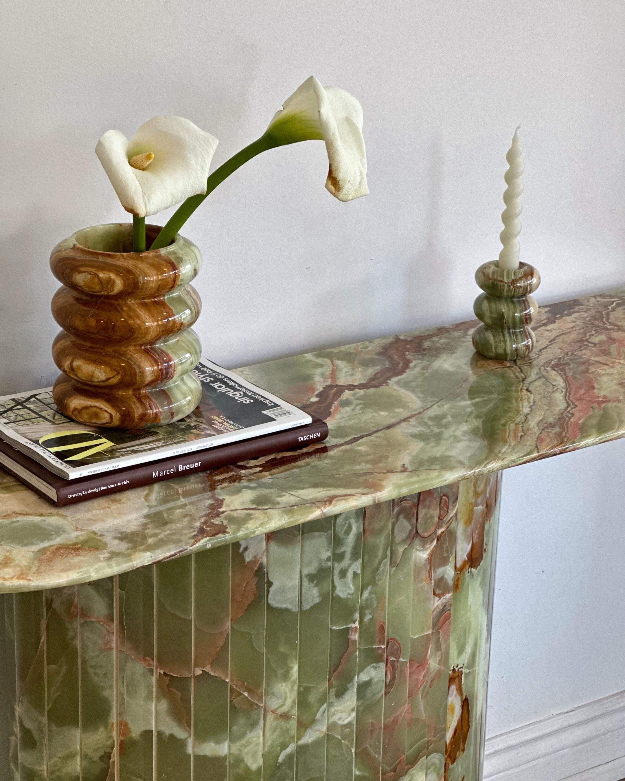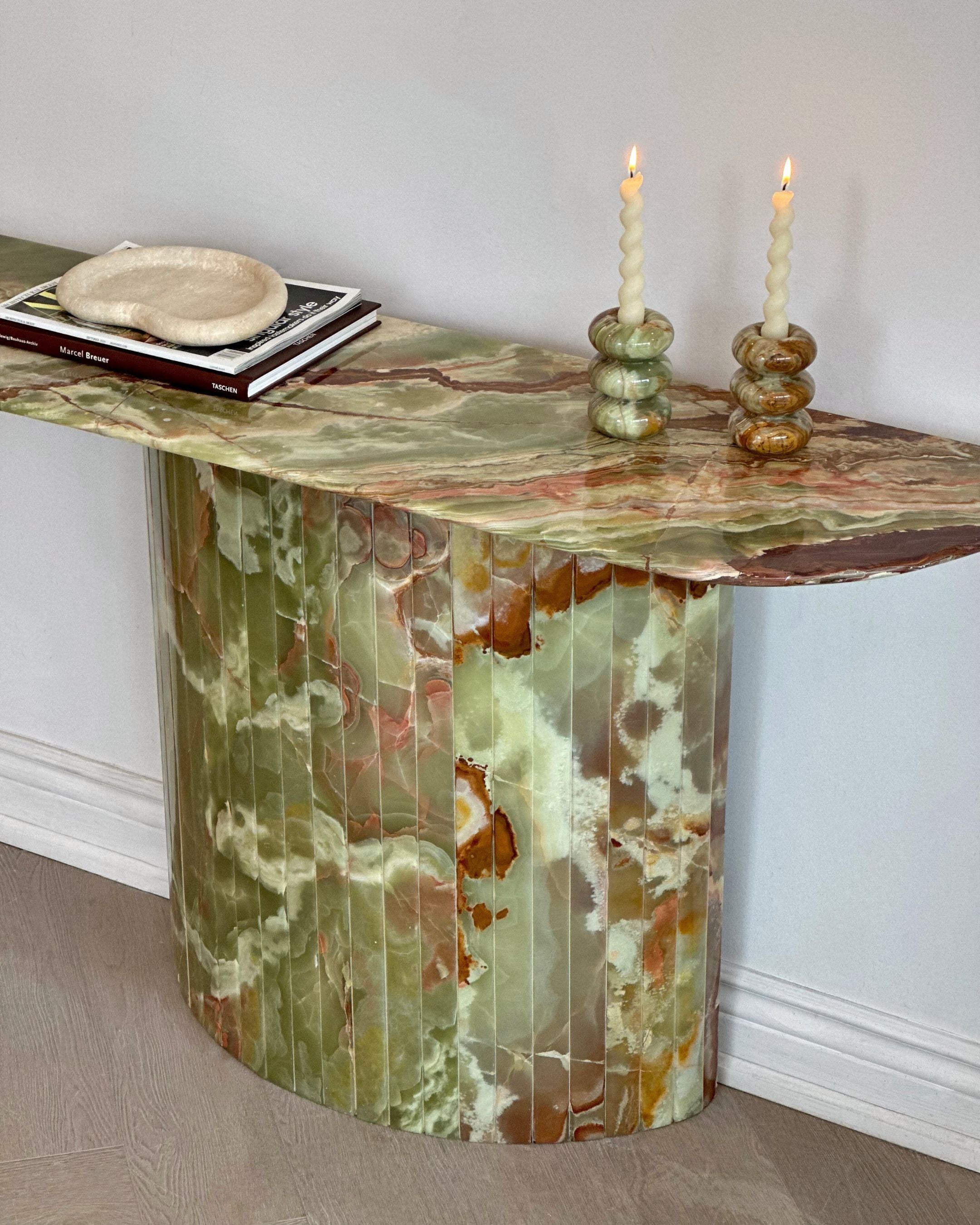 Introducing the Green Onyx Console Table. Crafted from hand selected and incredibly rare Onyx sealed and brought to a high polish finish. The detailed fluted base adds to its timeless design, while its crescent top was intentionally designed not to disrupt the flow when placed in an entryway or hallway.