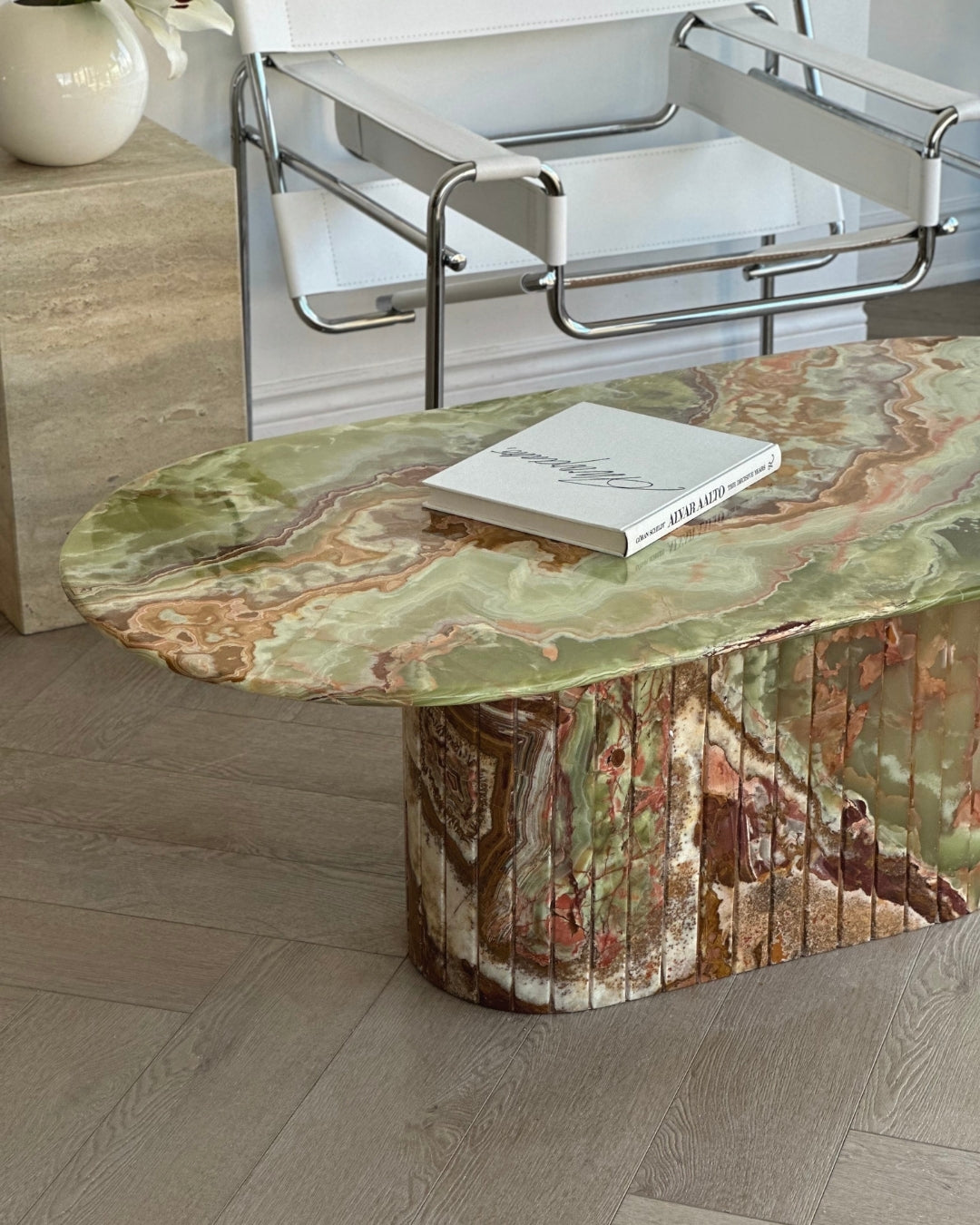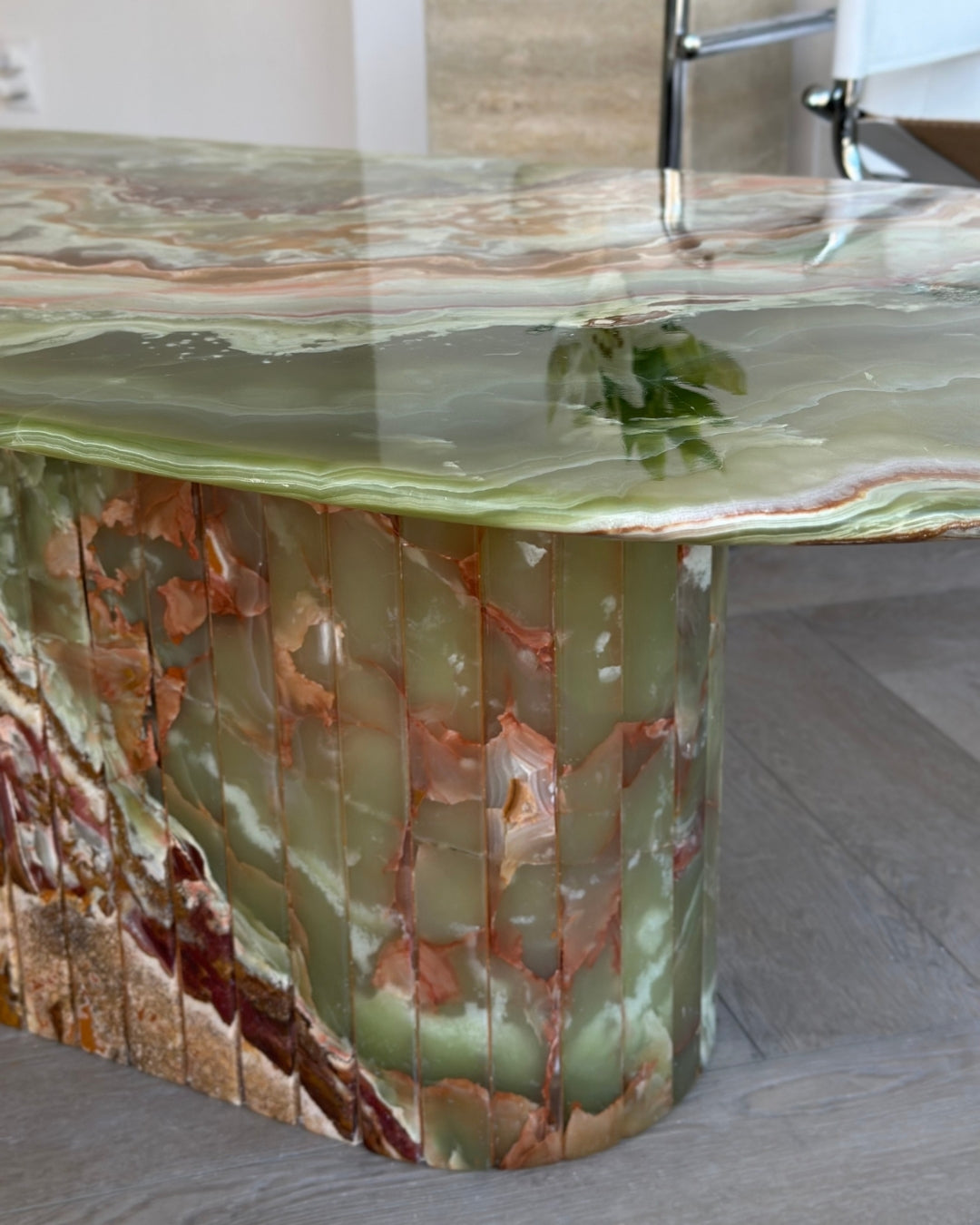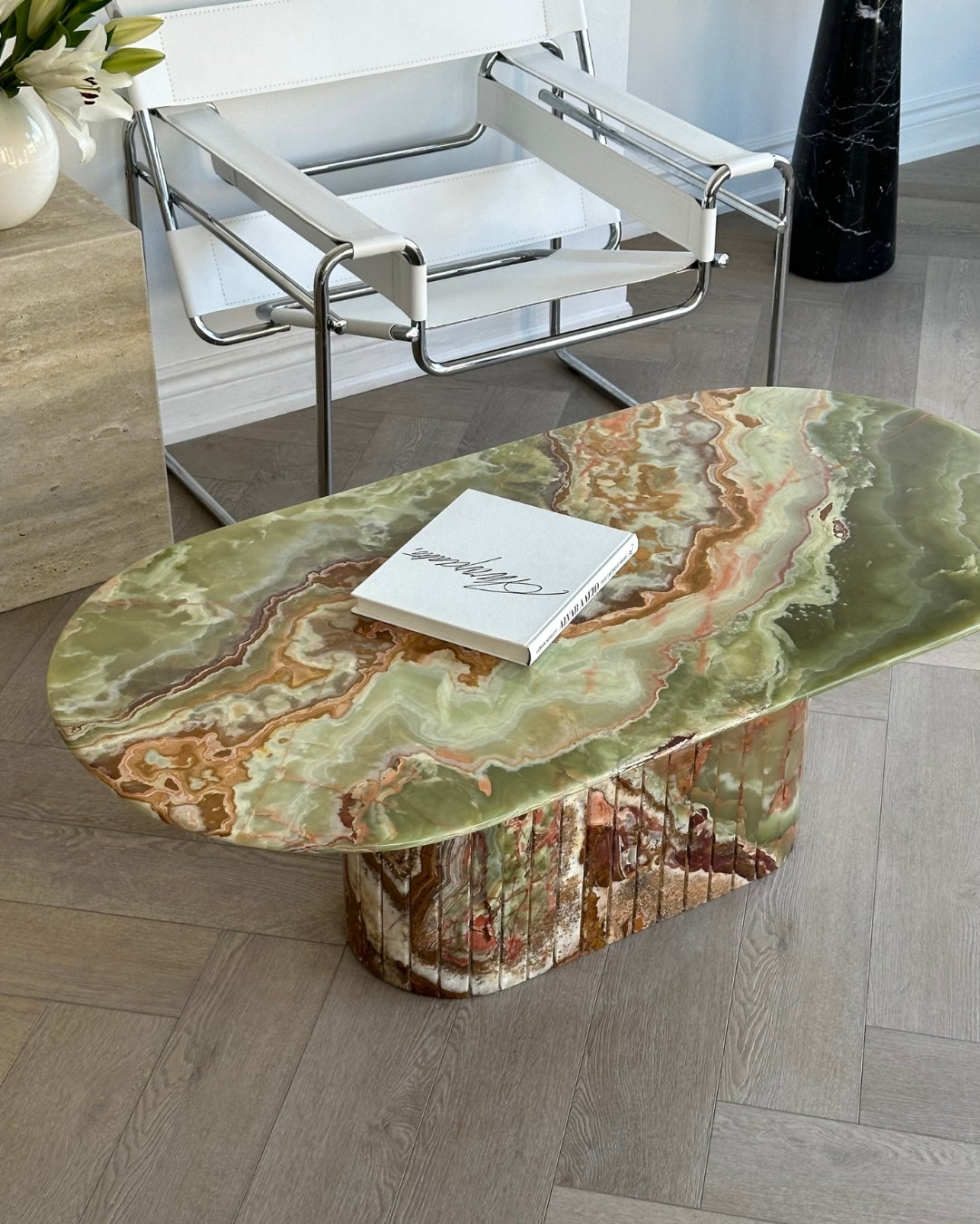 Introducing the Green Onyx Oval Coffee Table. Crafted from hand selected and incredibly rare Onyx brought to a high polish finish. The detailed fluted base adds to its timeless design, while its slim oval top was designed for longer sectionals and narrow spaces.