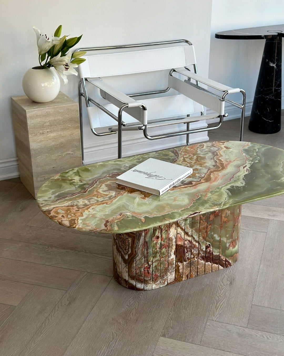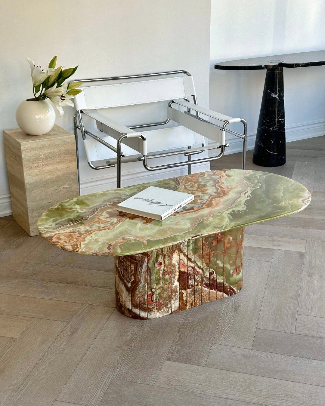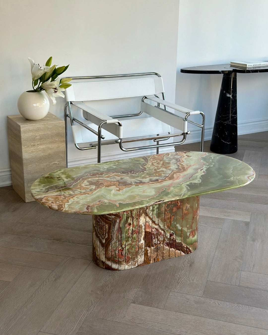 Introducing the Green Onyx Oval Coffee Table. Crafted from hand selected and incredibly rare Onyx brought to a high polish finish. The detailed fluted base adds to its timeless design, while its slim oval top was designed for longer sectionals and narrow spaces.