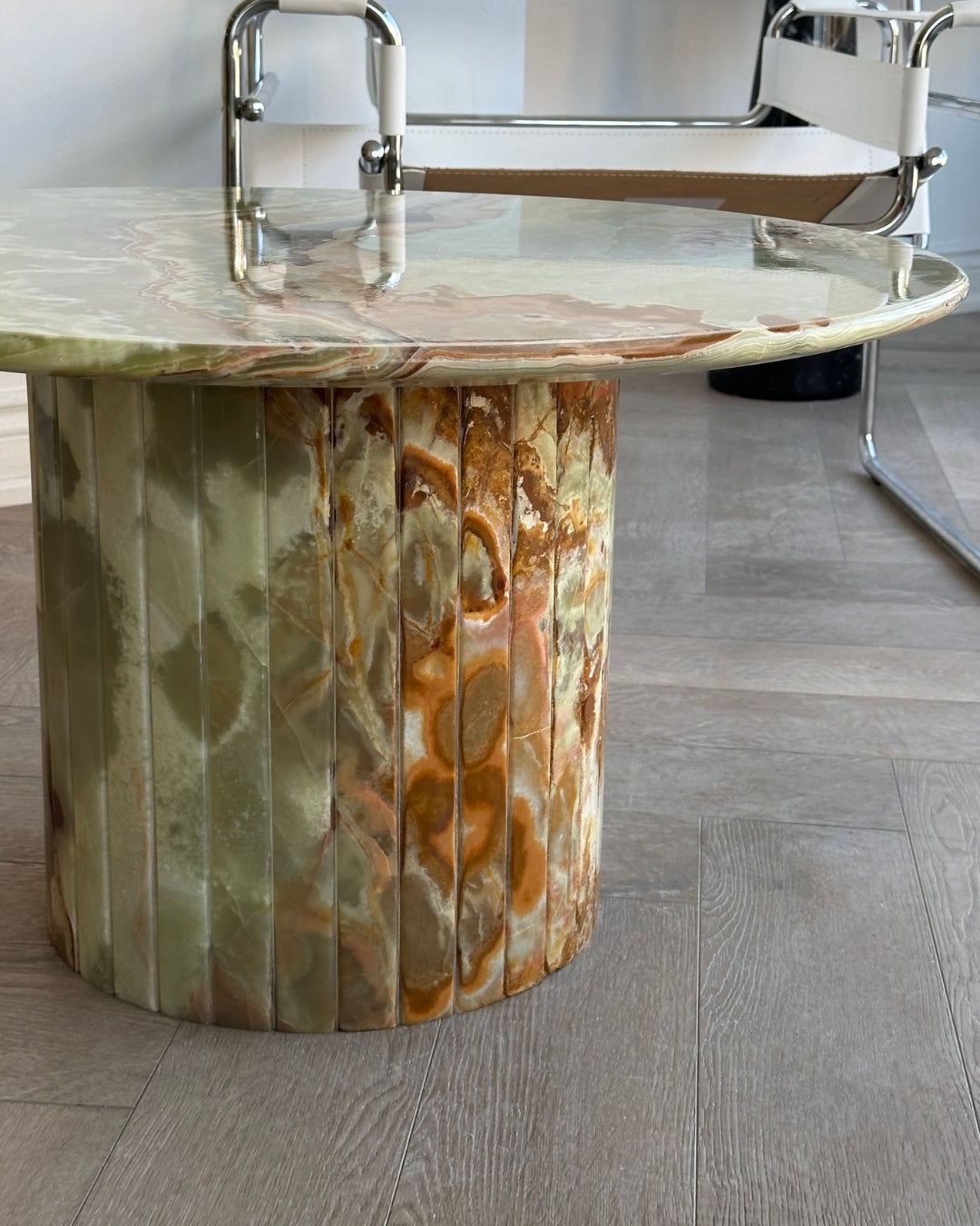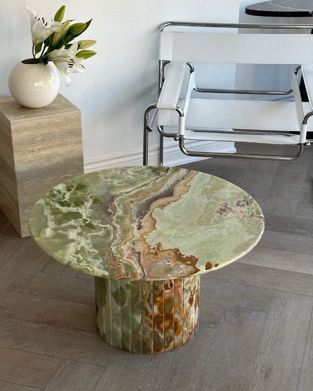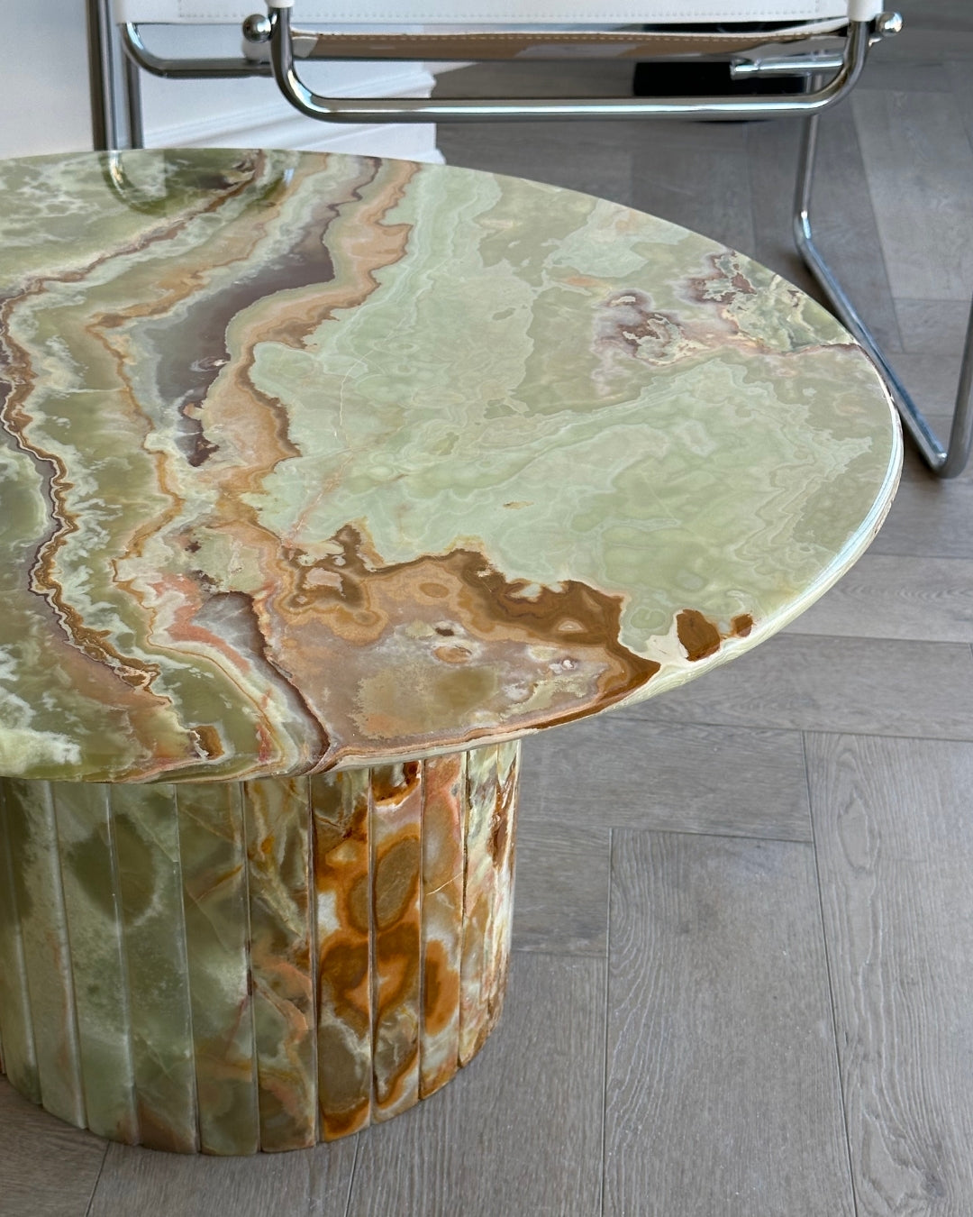 Introducing the Green Onyx Round Coffee Table. Crafted from hand selected and incredibly rare Onyx brought to a high polish finish. The detailed fluted base adds to its timeless design, while its smaller top was designed for sectionals, layering and small spaces.
