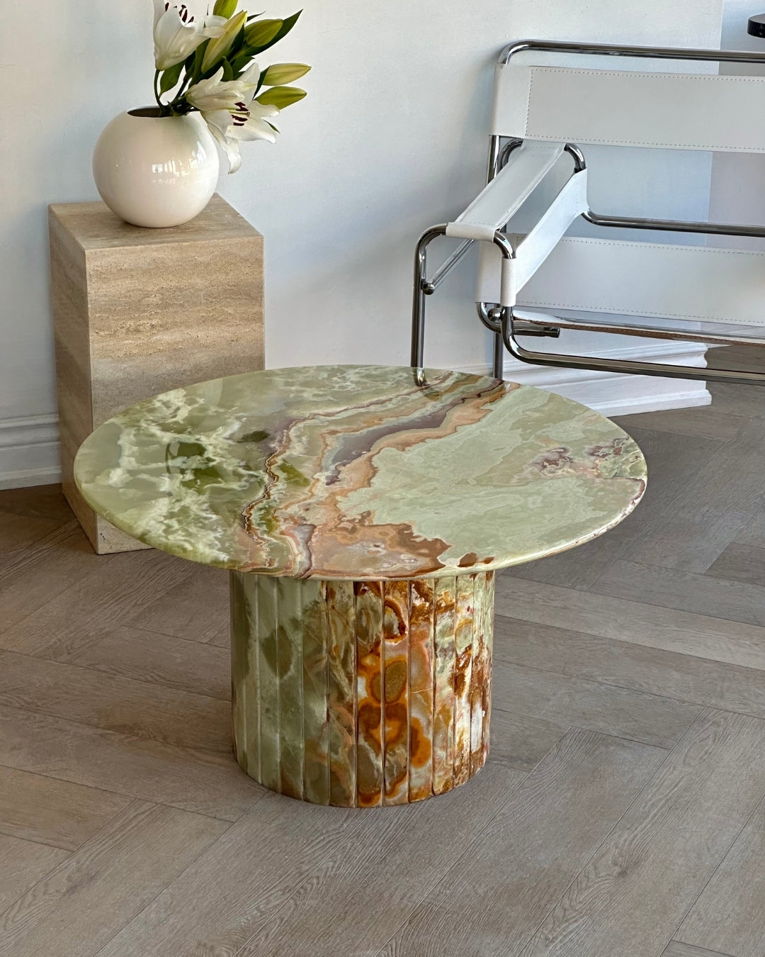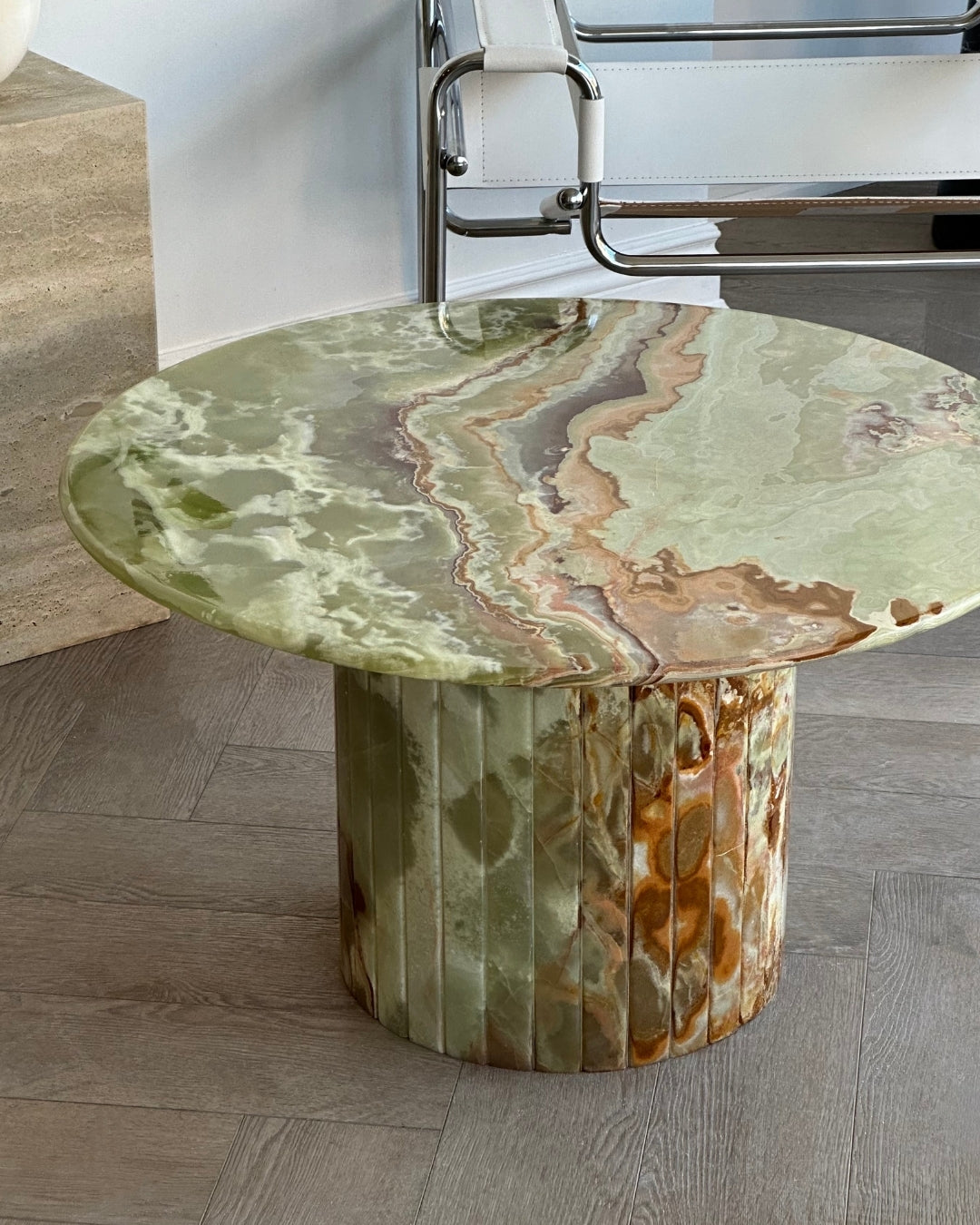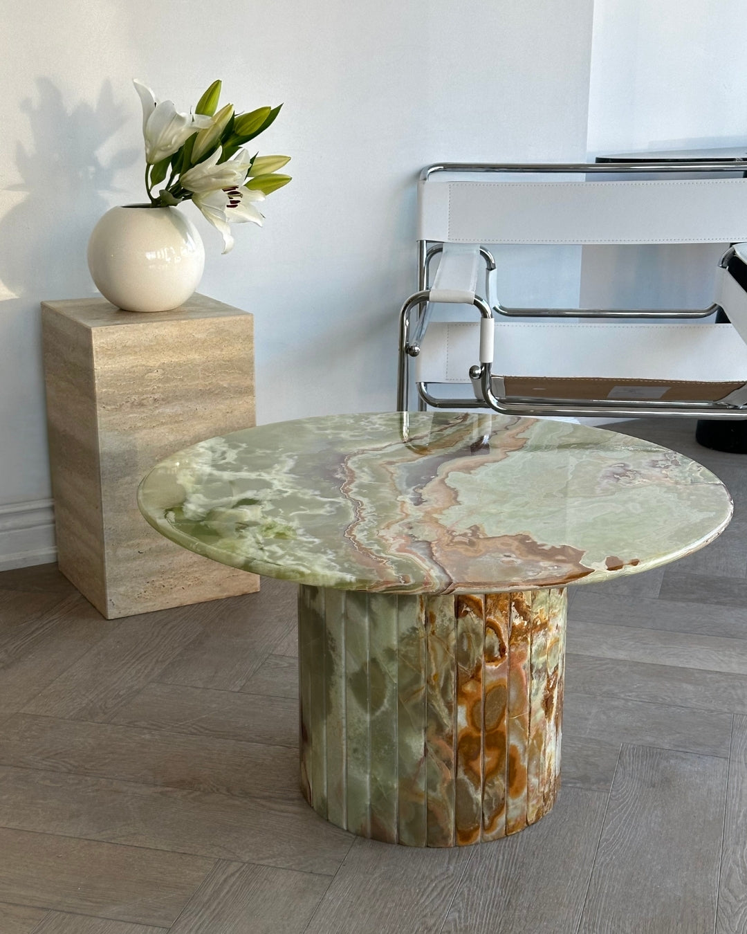 Introducing the Green Onyx Round Coffee Table. Crafted from hand selected and incredibly rare Onyx brought to a high polish finish. The detailed fluted base adds to its timeless design, while its smaller top was designed for sectionals, layering and small spaces.