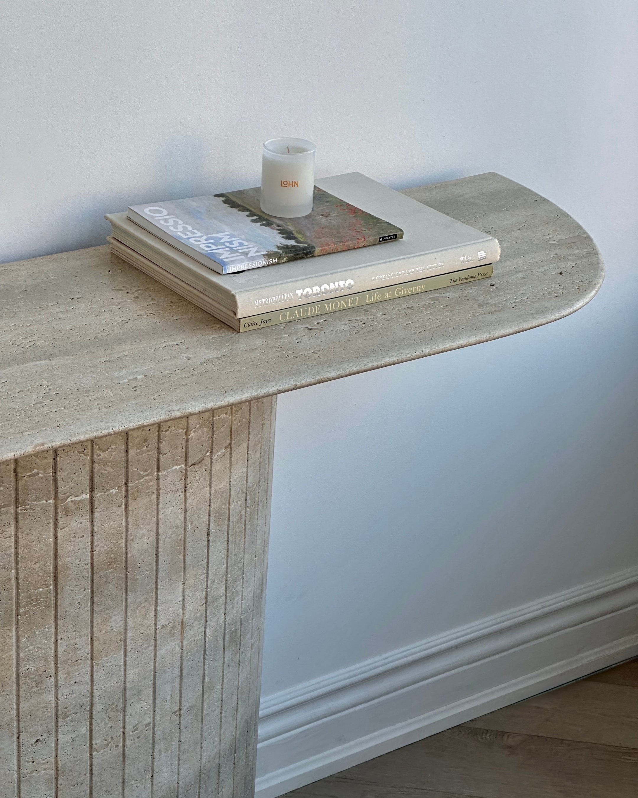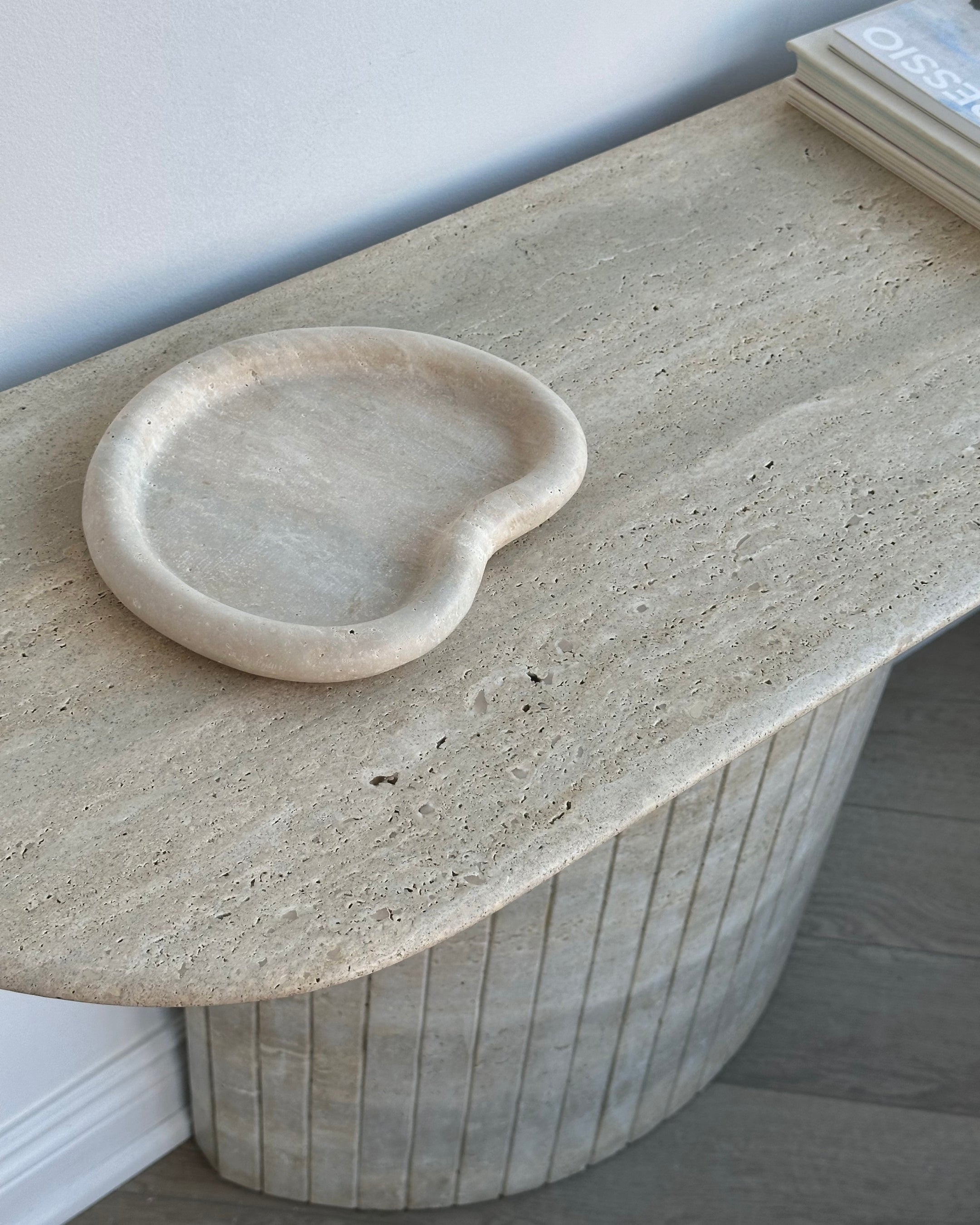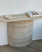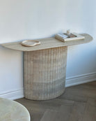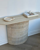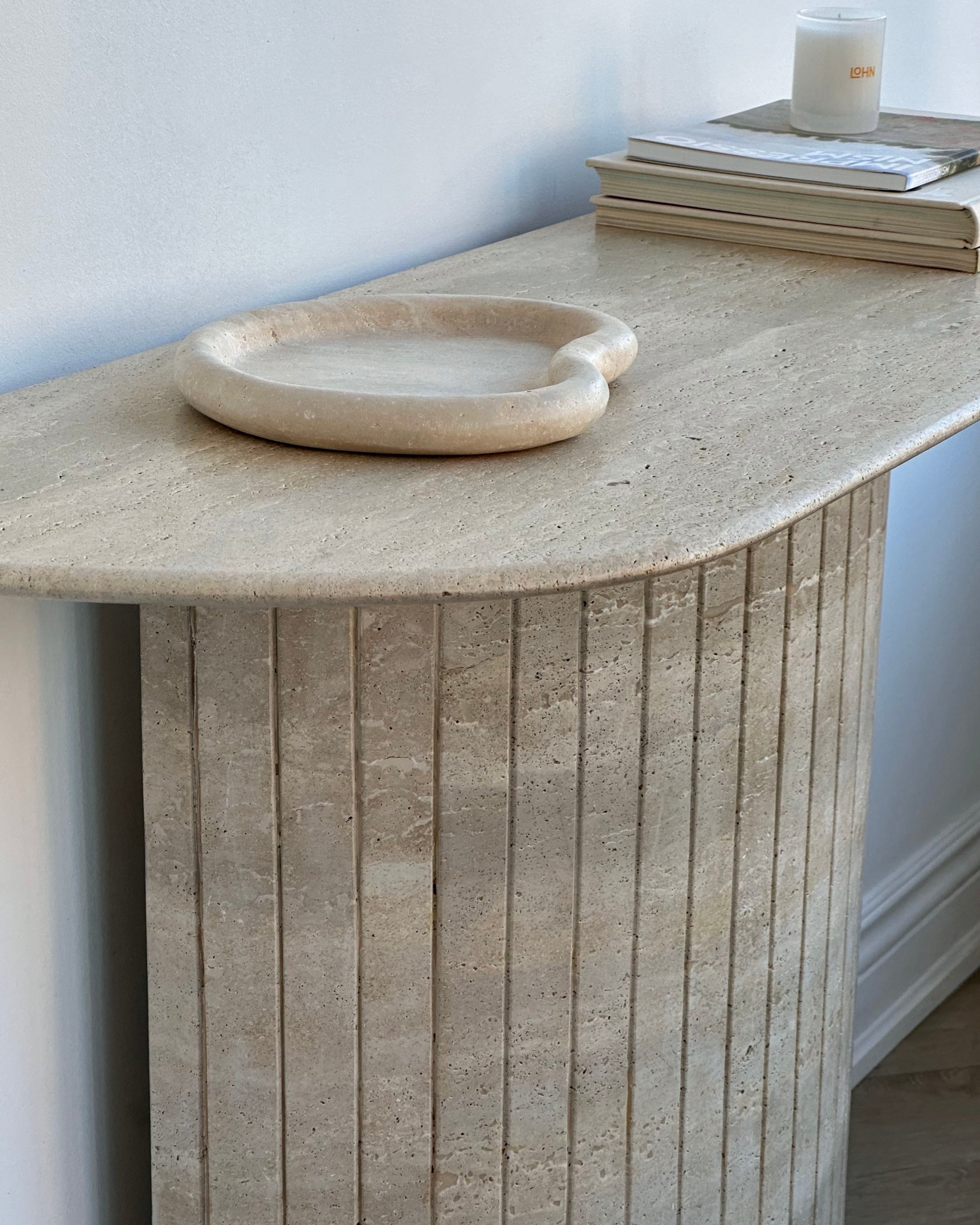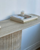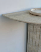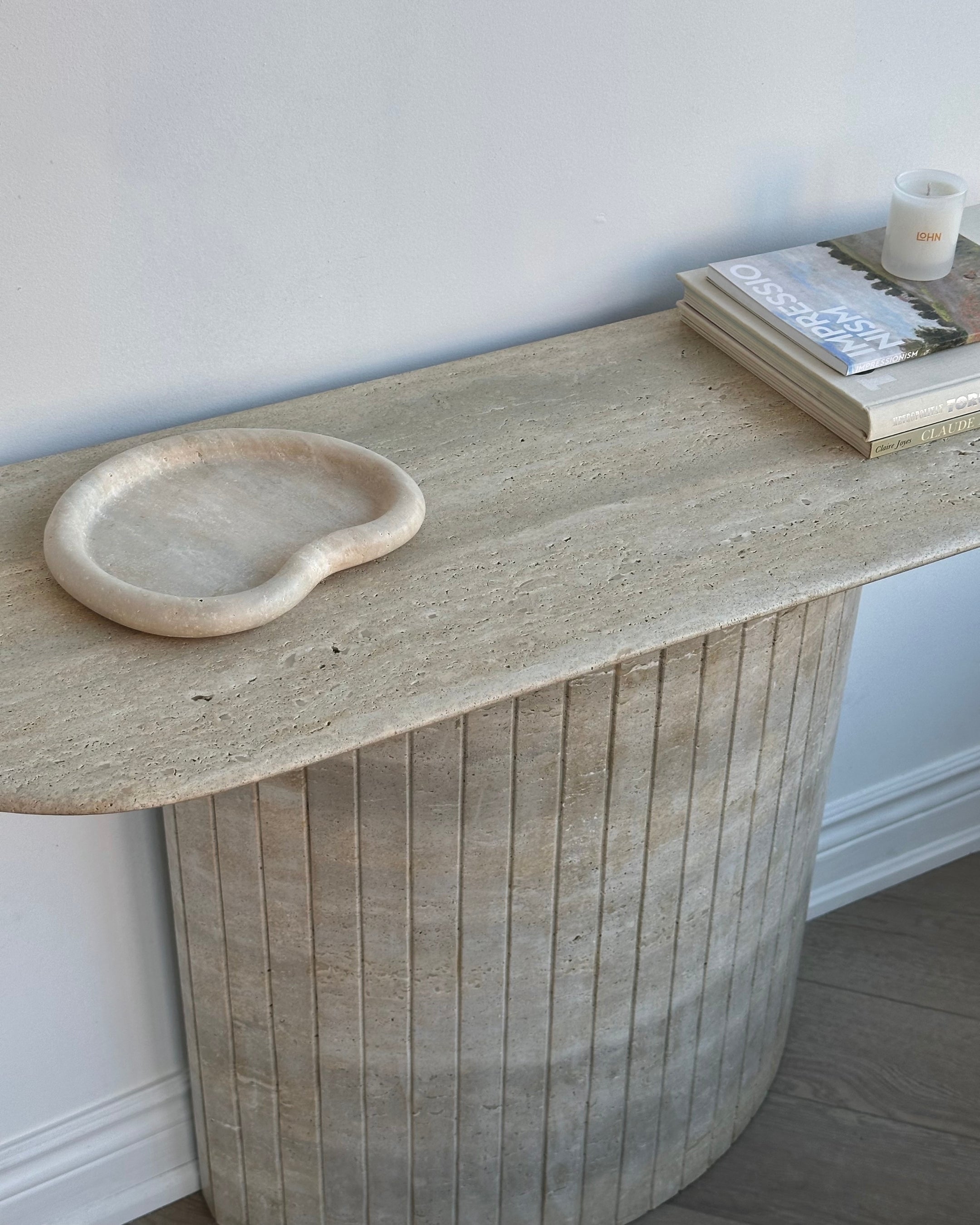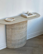 Introducing the Travertine Console Table. Crafted from hand selected Travertine honed and then lightly polished and sealed to a satin finish. The detailed fluted base adds to its timeless design, while its crescent top was intentionally designed not to disrupt flow when placed in an entryway or hallway.