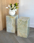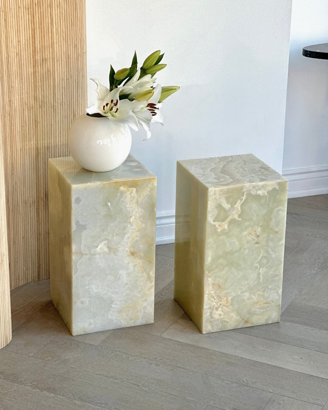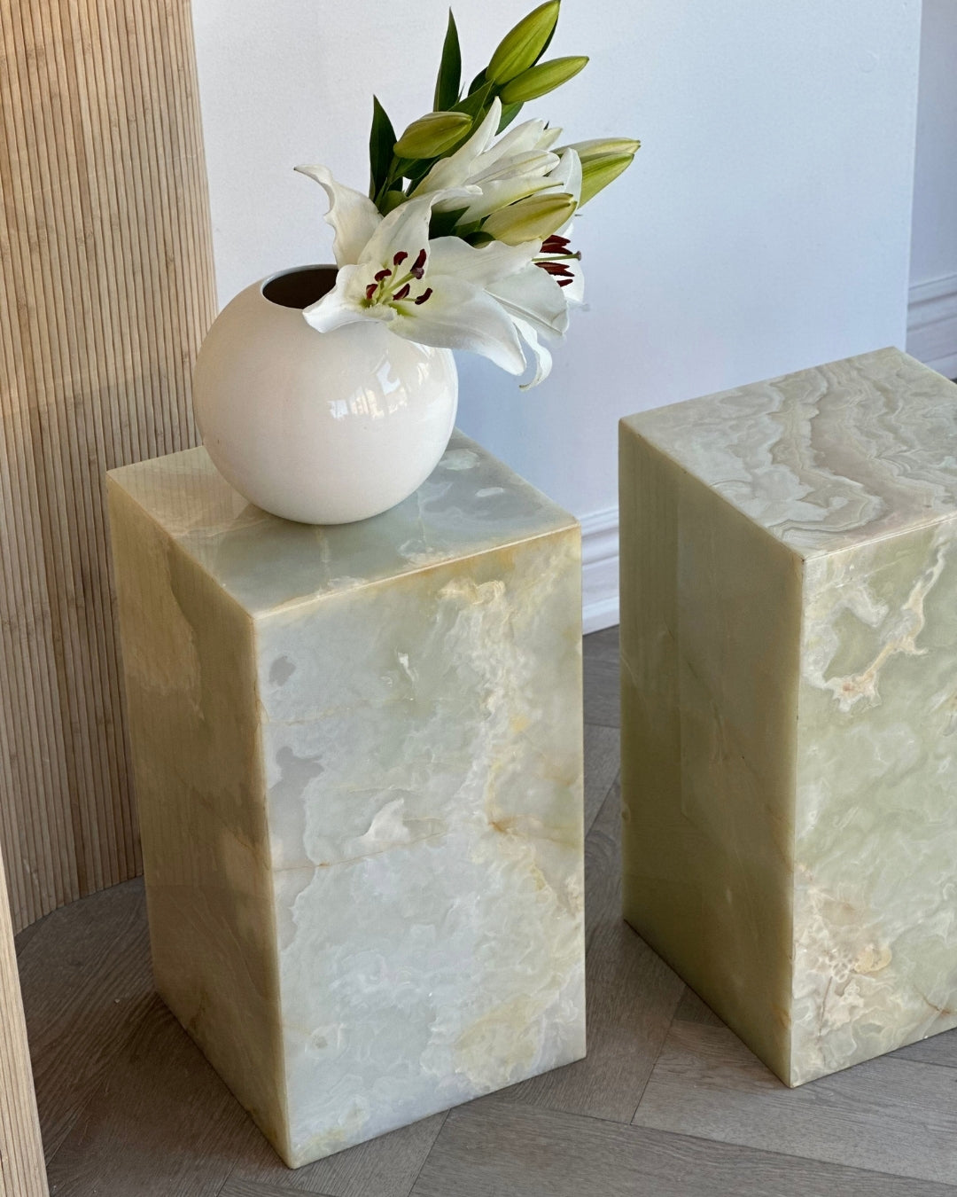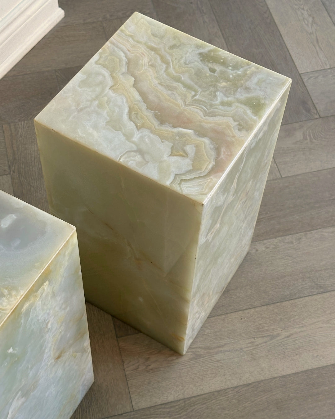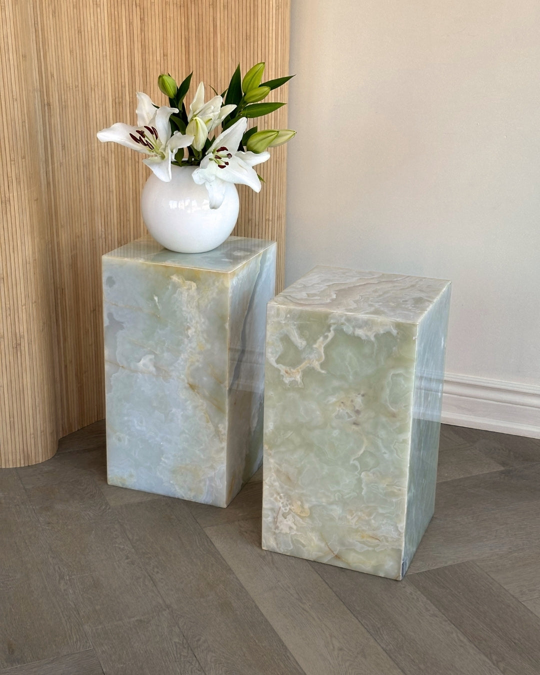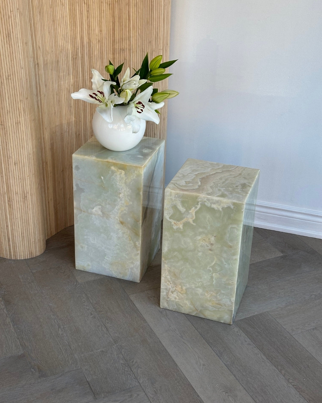 Introducing the Light Green Onyx Plinth. Crafted from hand selected and incredibly rare Onyx brought to a high polish finish. Suitable as an end table for a sofa, accent chair or bedside.