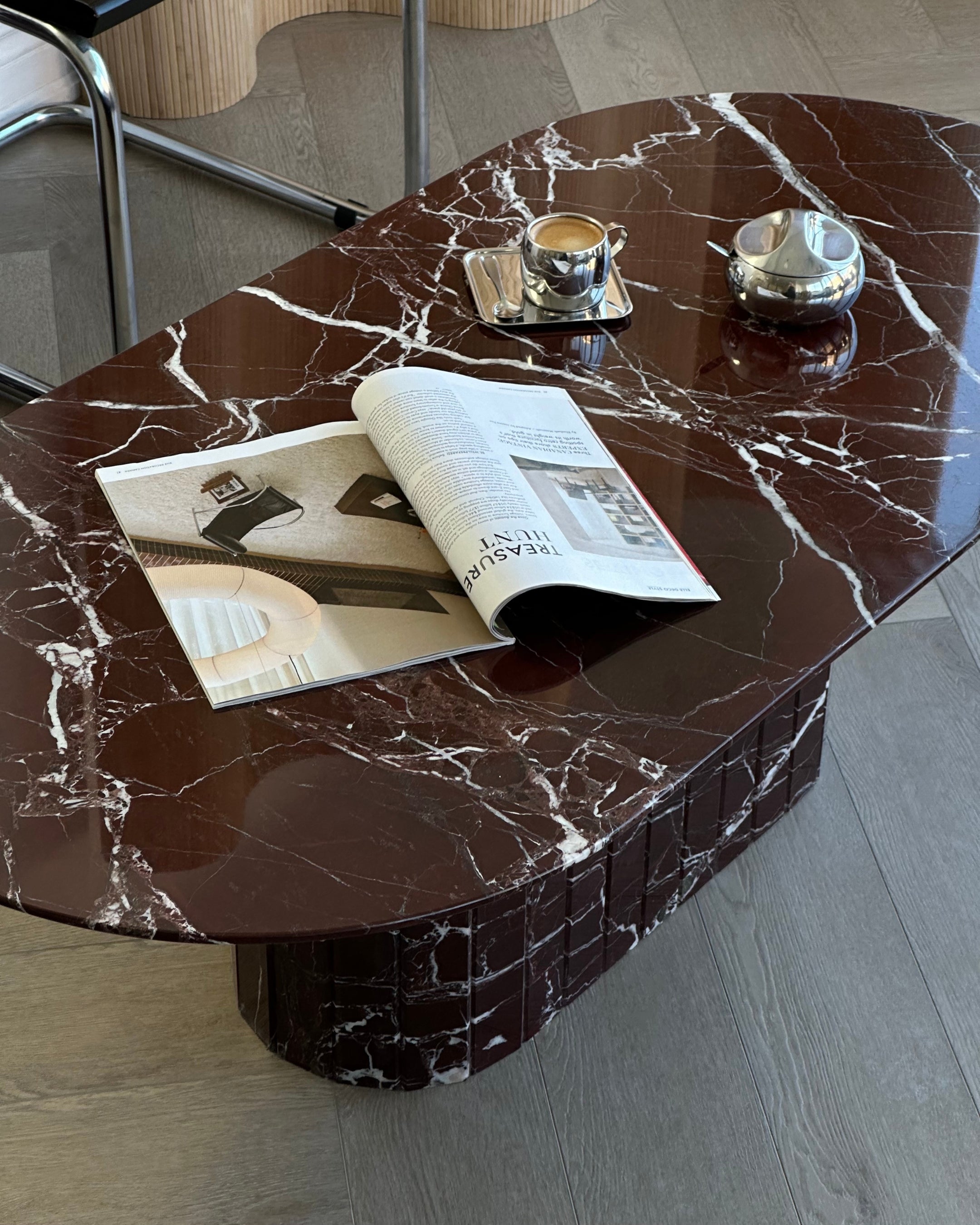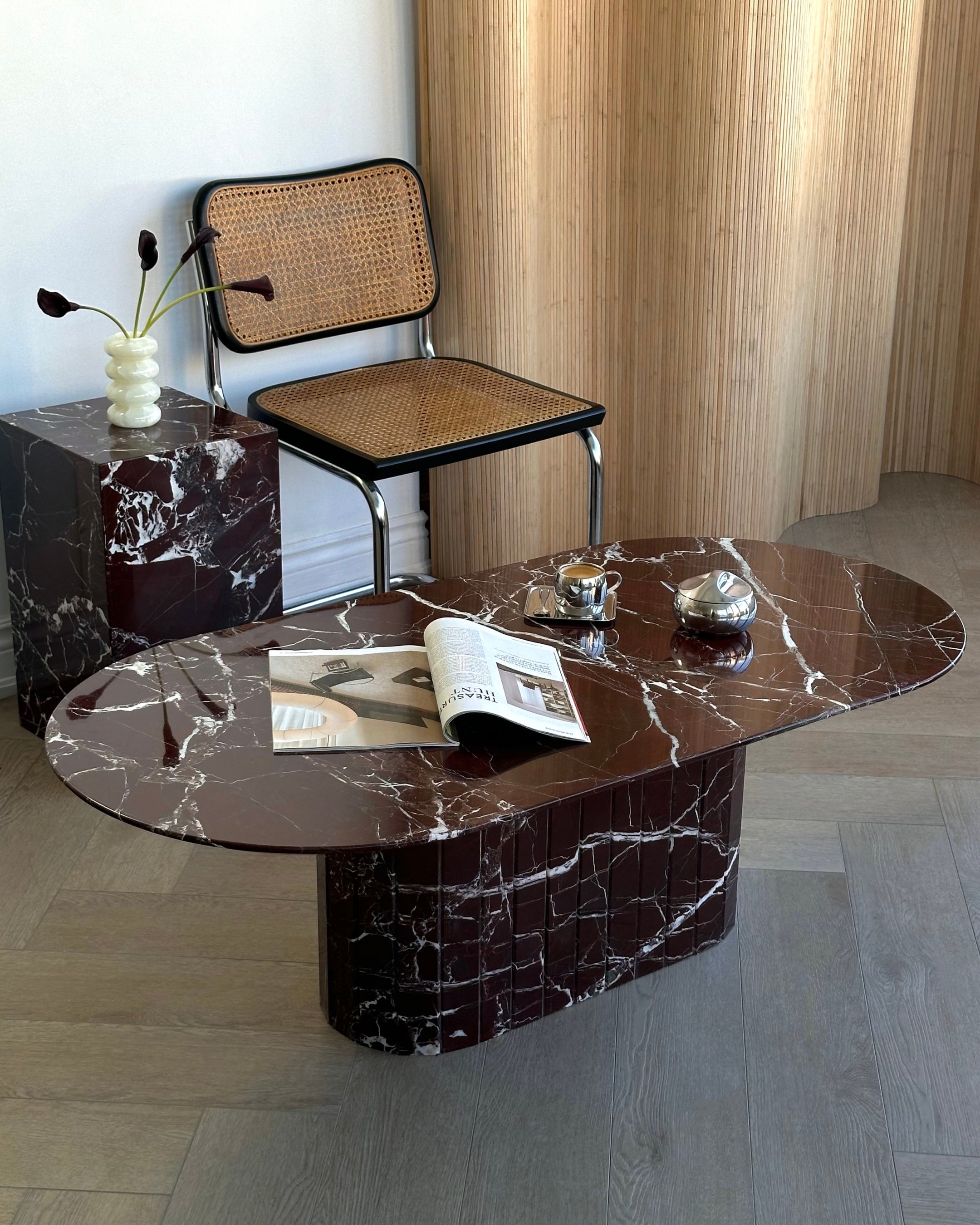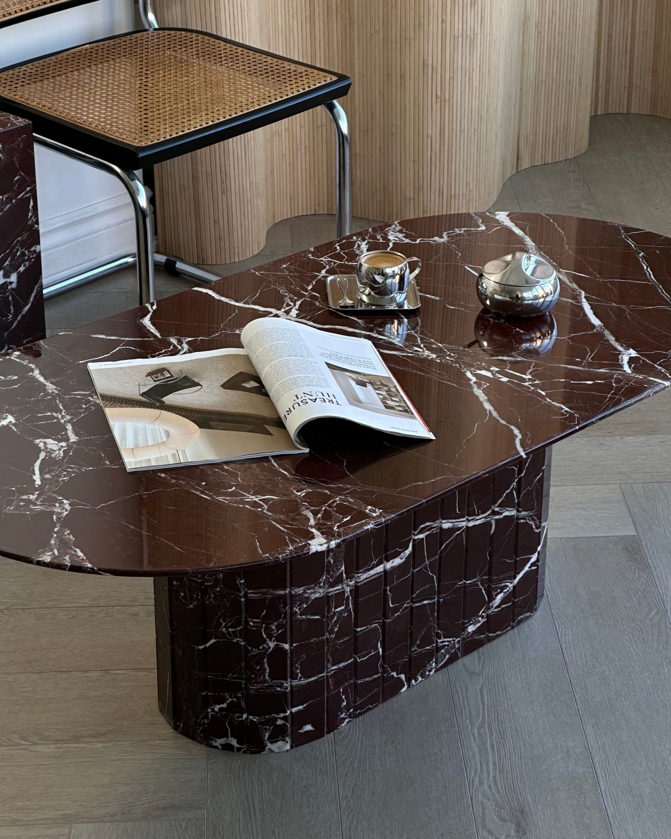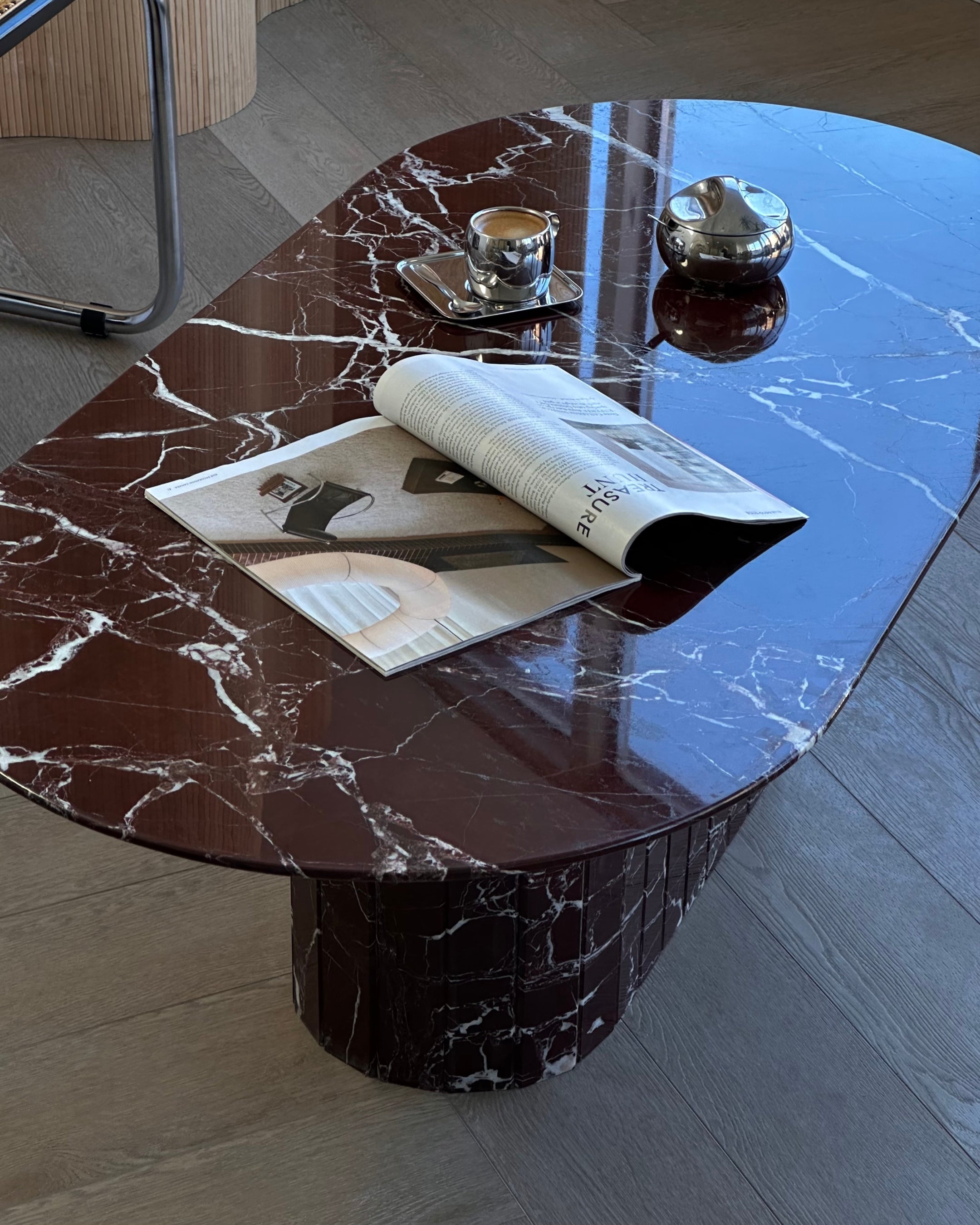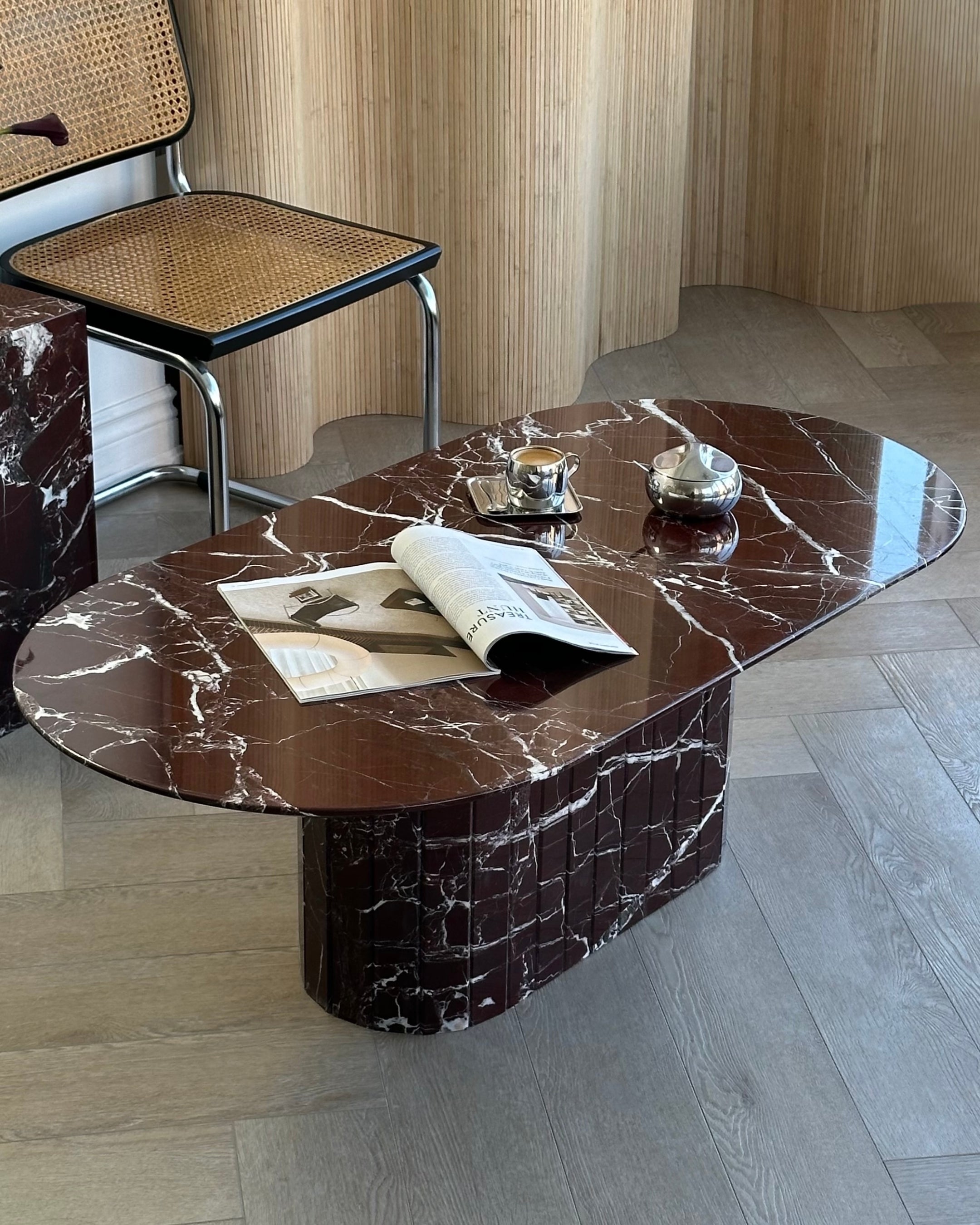 Introducing the Rosso Levanto Oval Coffee Table from our in-house collection. Crafted from hand selected Italian deep burgundy Rosso Levanto marble and brought to a high polish finish. The detailed fluted base adds to its timeless design, while its slim oval top is designed for longer sectionals and narrow spaces.
