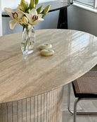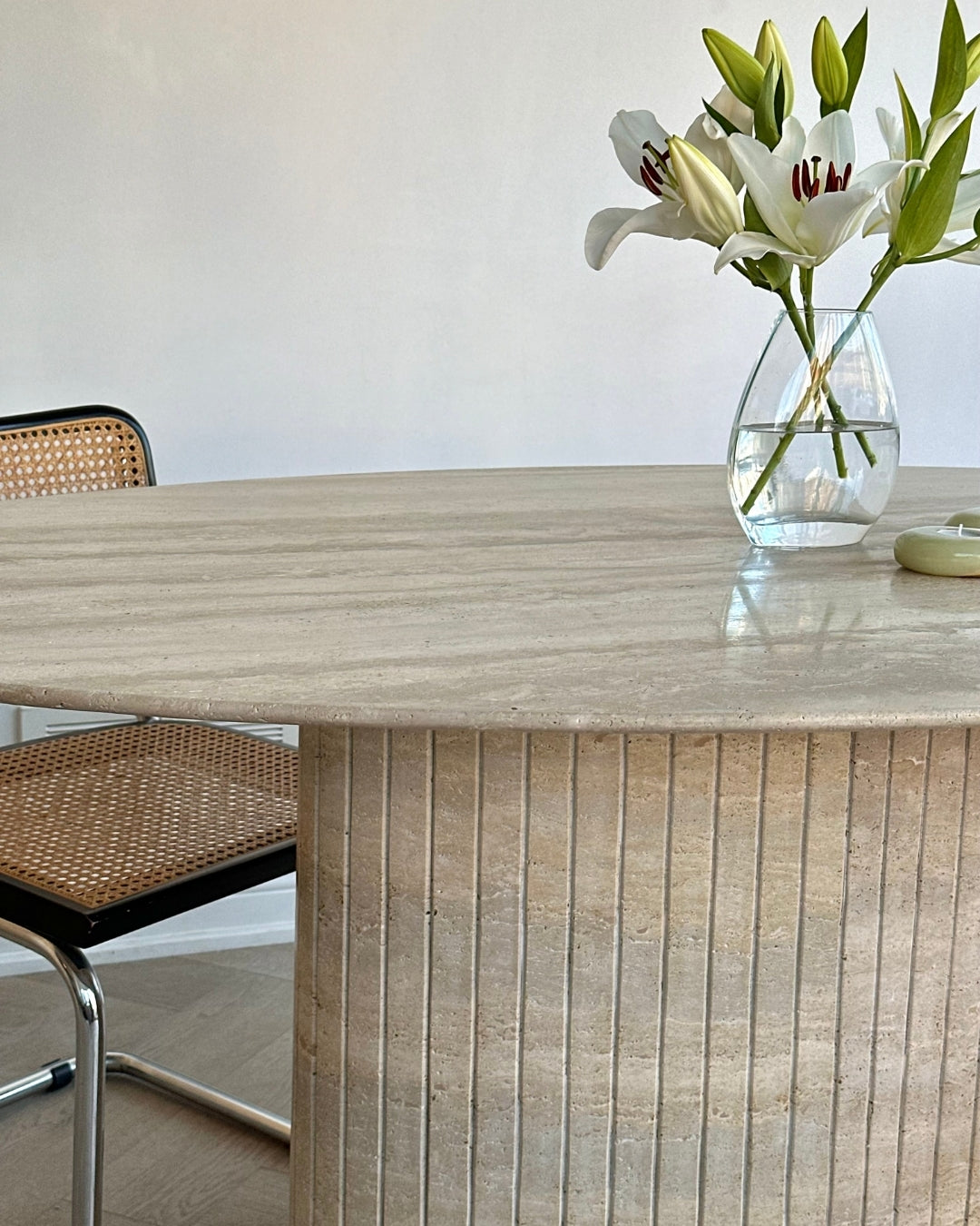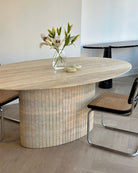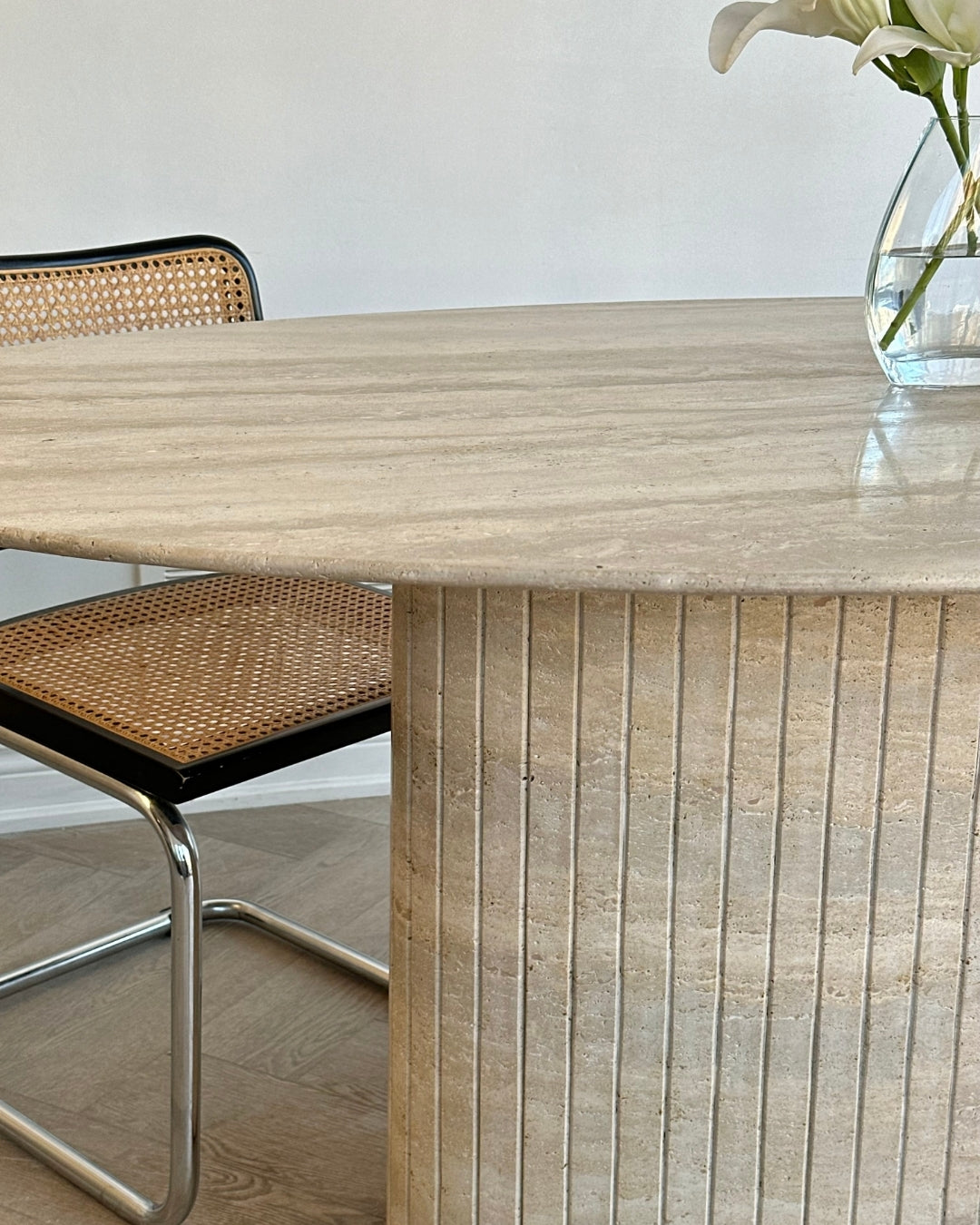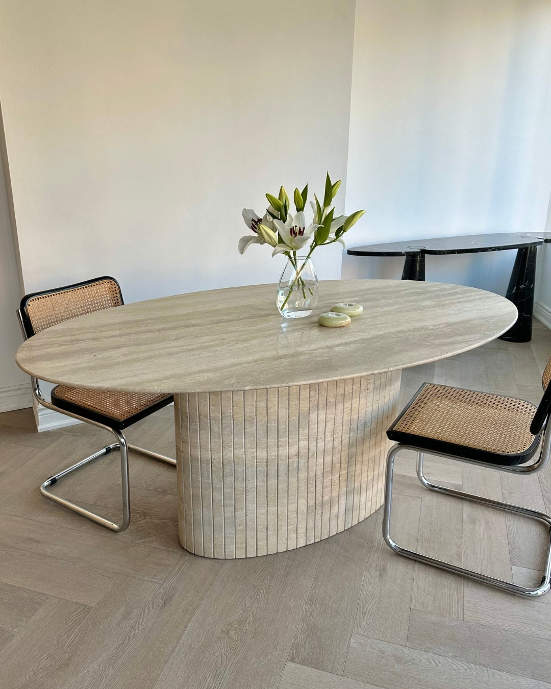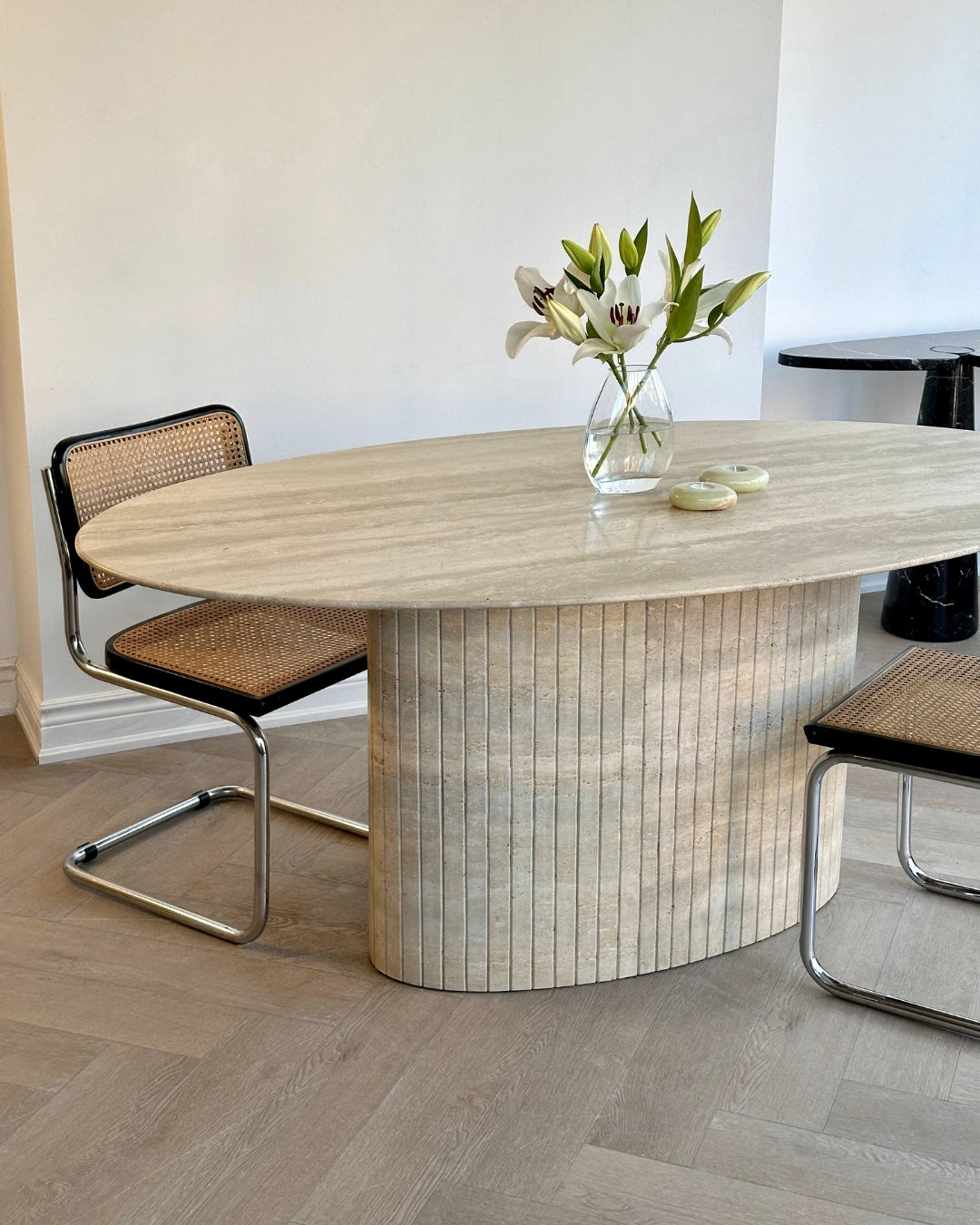 Introducing the Travertine Oval Dining Table. Crafted from hand selected Travertine honed and then lightly polished and sealed to a satin finish. The detailed fluted base adds to its timeless design, while its oval top was designed with functionality in mind. Suitable for banquettes, smaller spaces while optimally seating 6. A common material in the world of vintage, yet with softened design characteristics for the modern home.