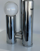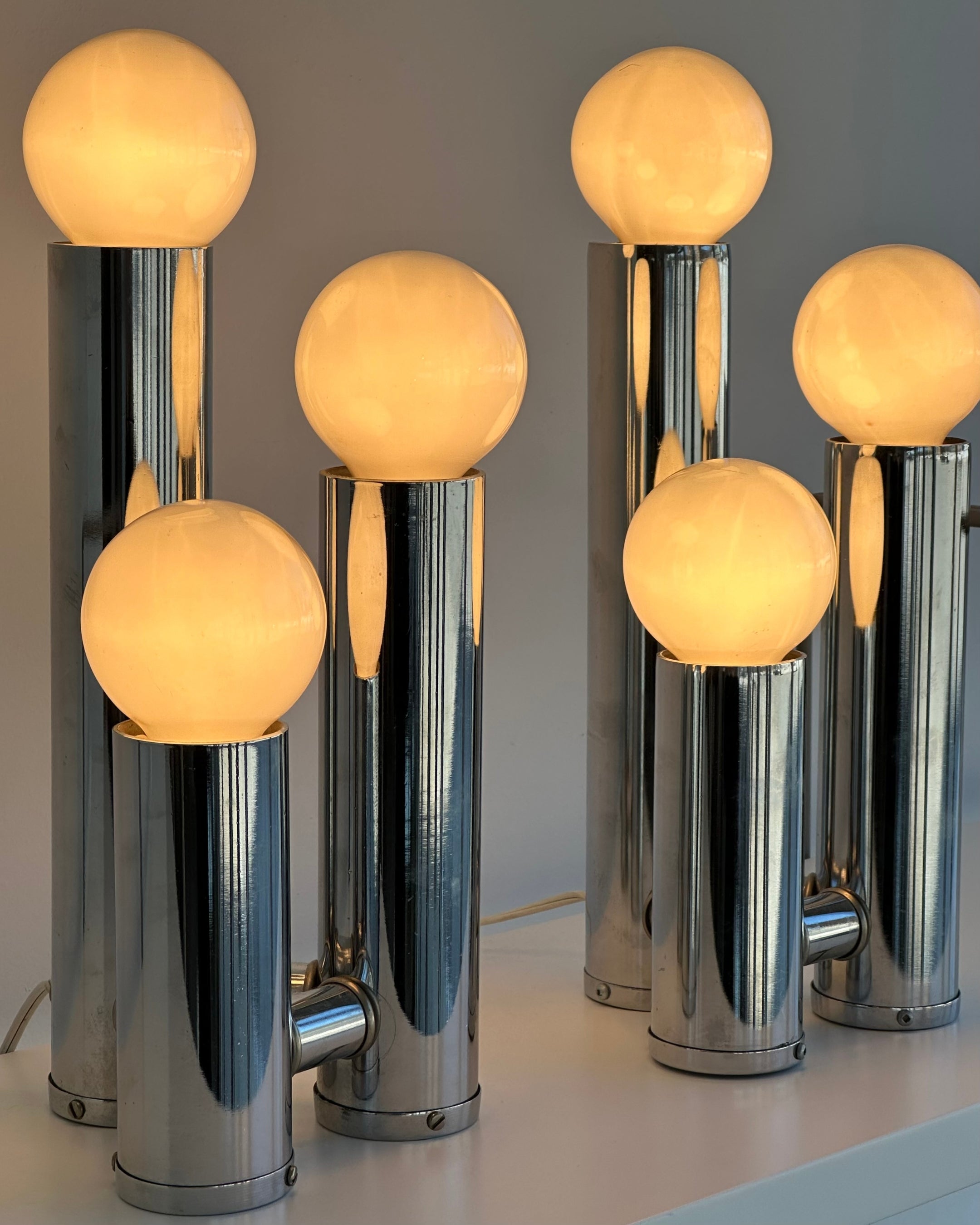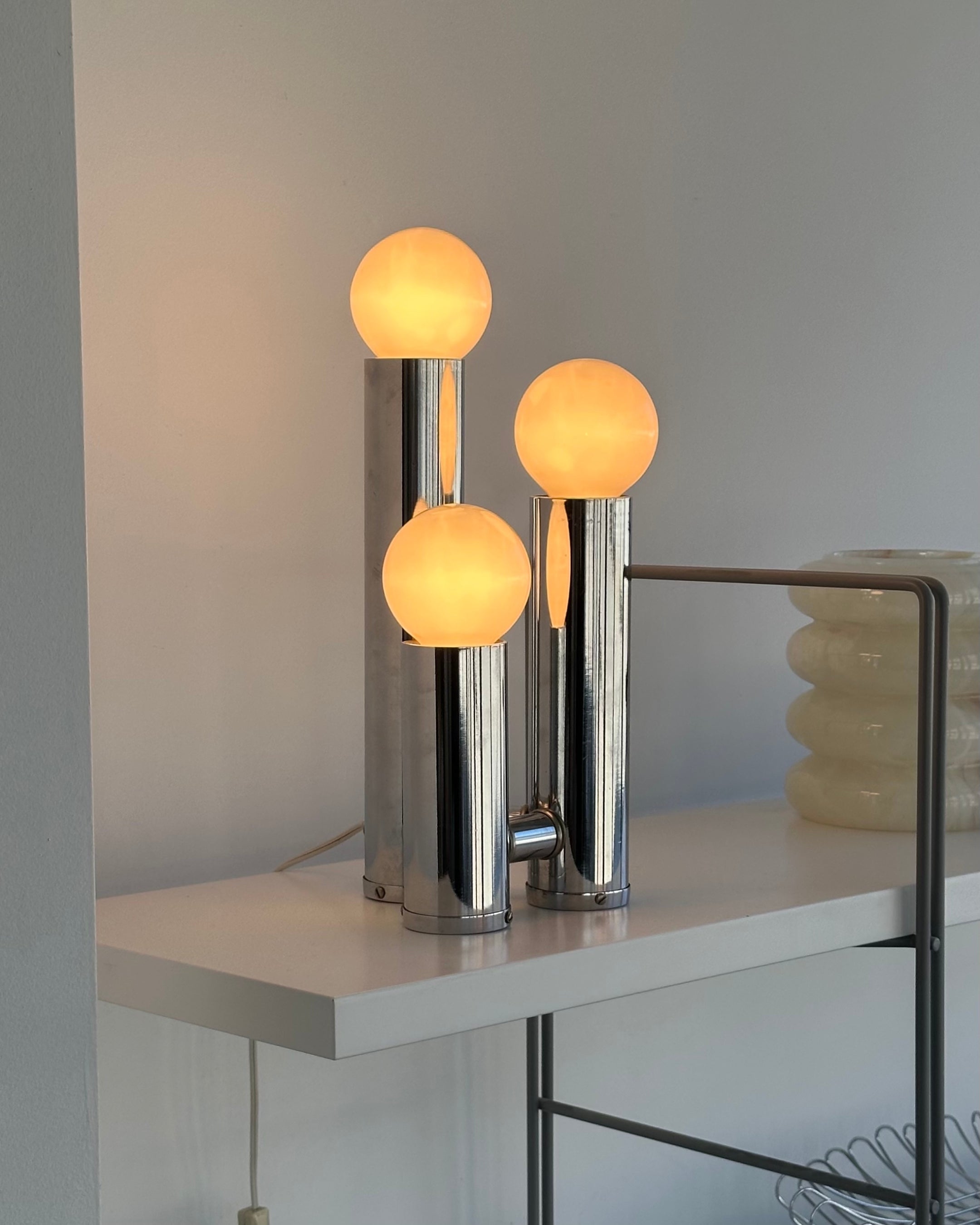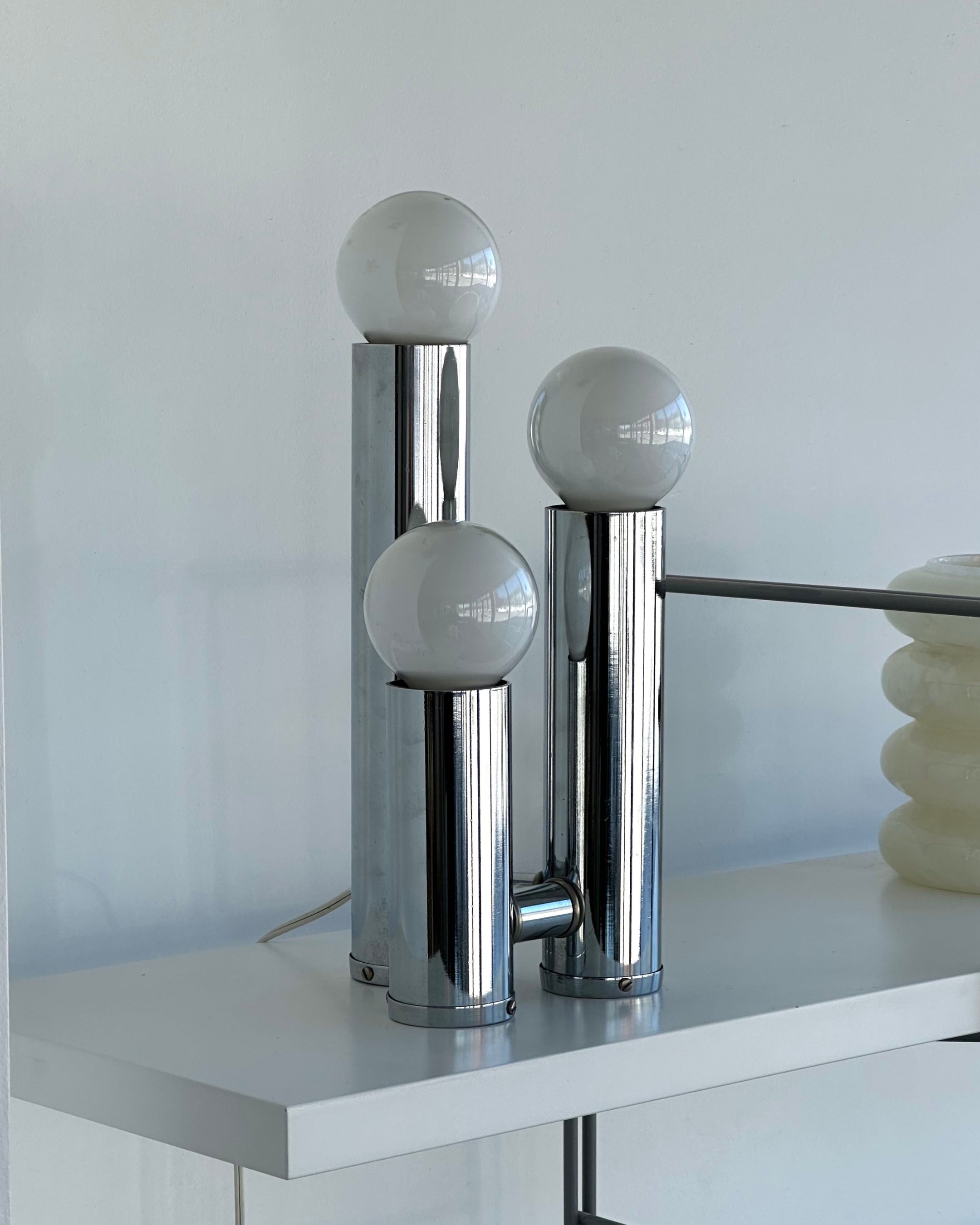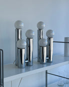 Excellent condition vintage chrome table lamps. Price per lamp; 2 available* Features three chrome tubular pillars with frosted globe bulbs. A true Hollywood recency style lamp. Little to no vintage wear; chrome in excellent shape and bulbs are brand new.