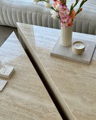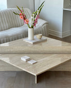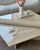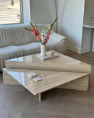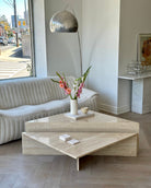 Vintage two-tier travertine coffee table in excellent condition. Features two triangular nesting sets at 15” and 11” high, adding depth and dimension to the piece. The soft Travertine Bianco material is complimented by angled legs for a sharper look. Reconfigure to your heart’s desire. Surface has been professionally polished and restored.