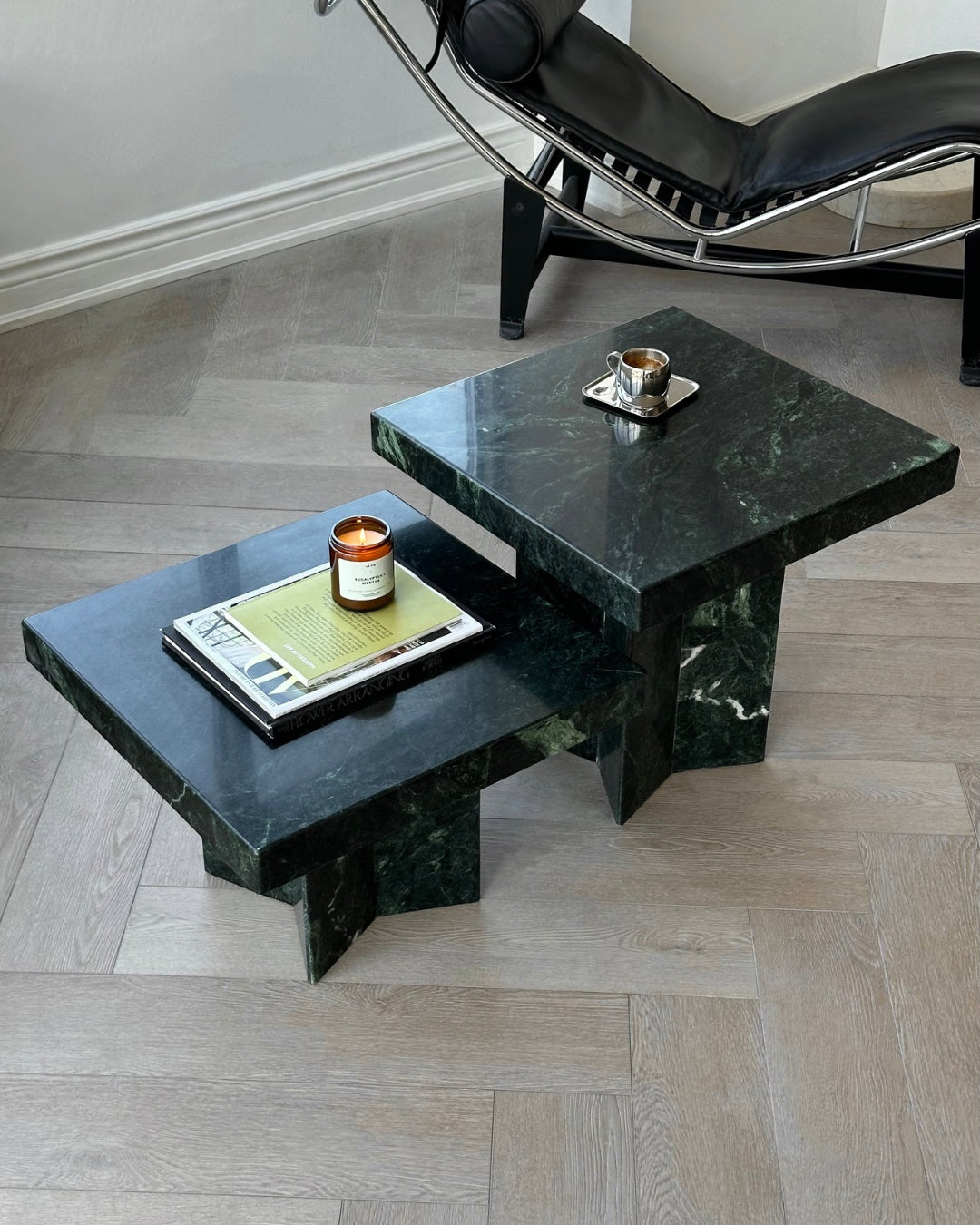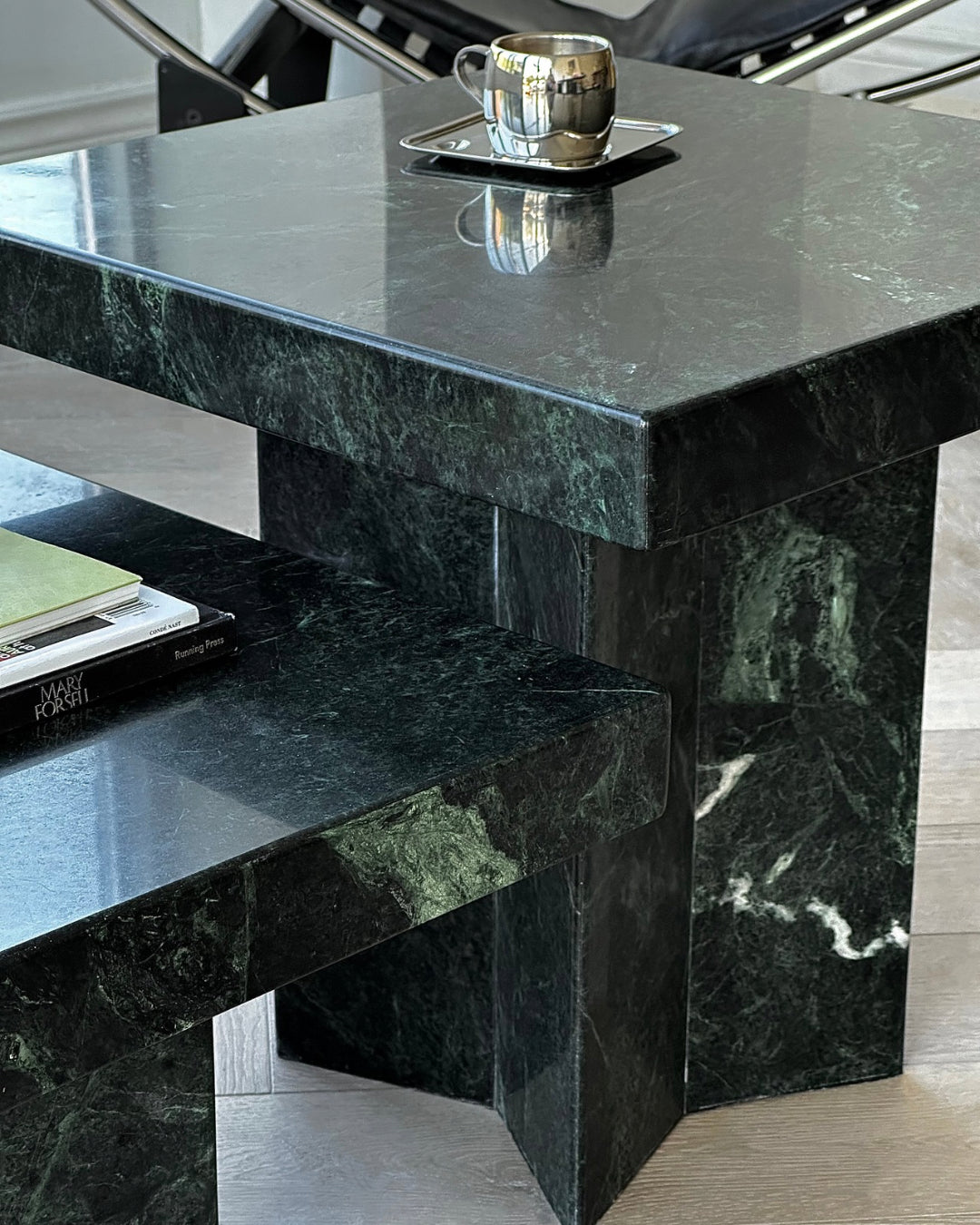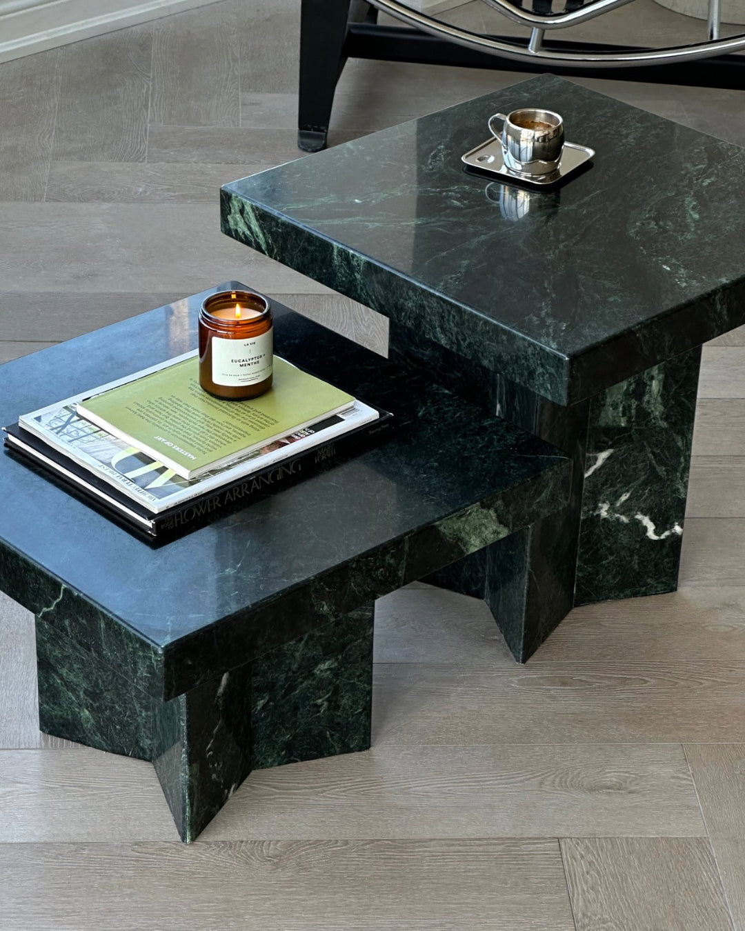 Vintage two-tier Verde Alpi marble coffee table in excellent condition. Surface has been professionally polished. A beautiful deep green with further depth and dimension provided by the layering effect of the two-tiered heights. Heights currently stand at 19” and 14.5”. Option to have as a low-profile height at 14.5” and lower for the second table for an additional cost.
