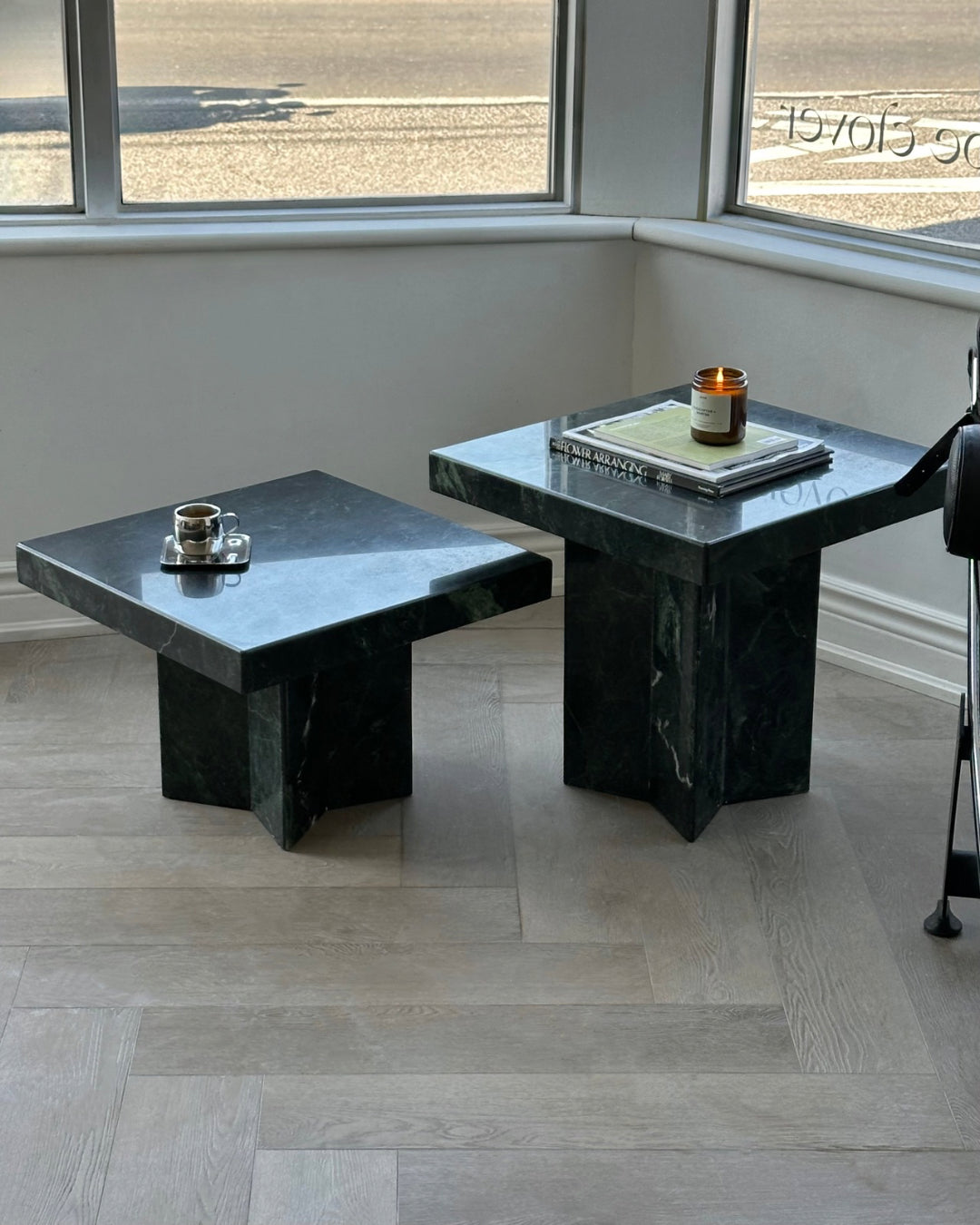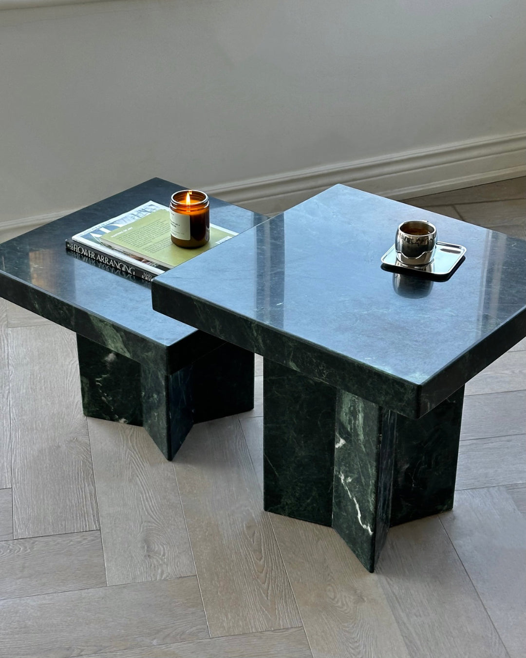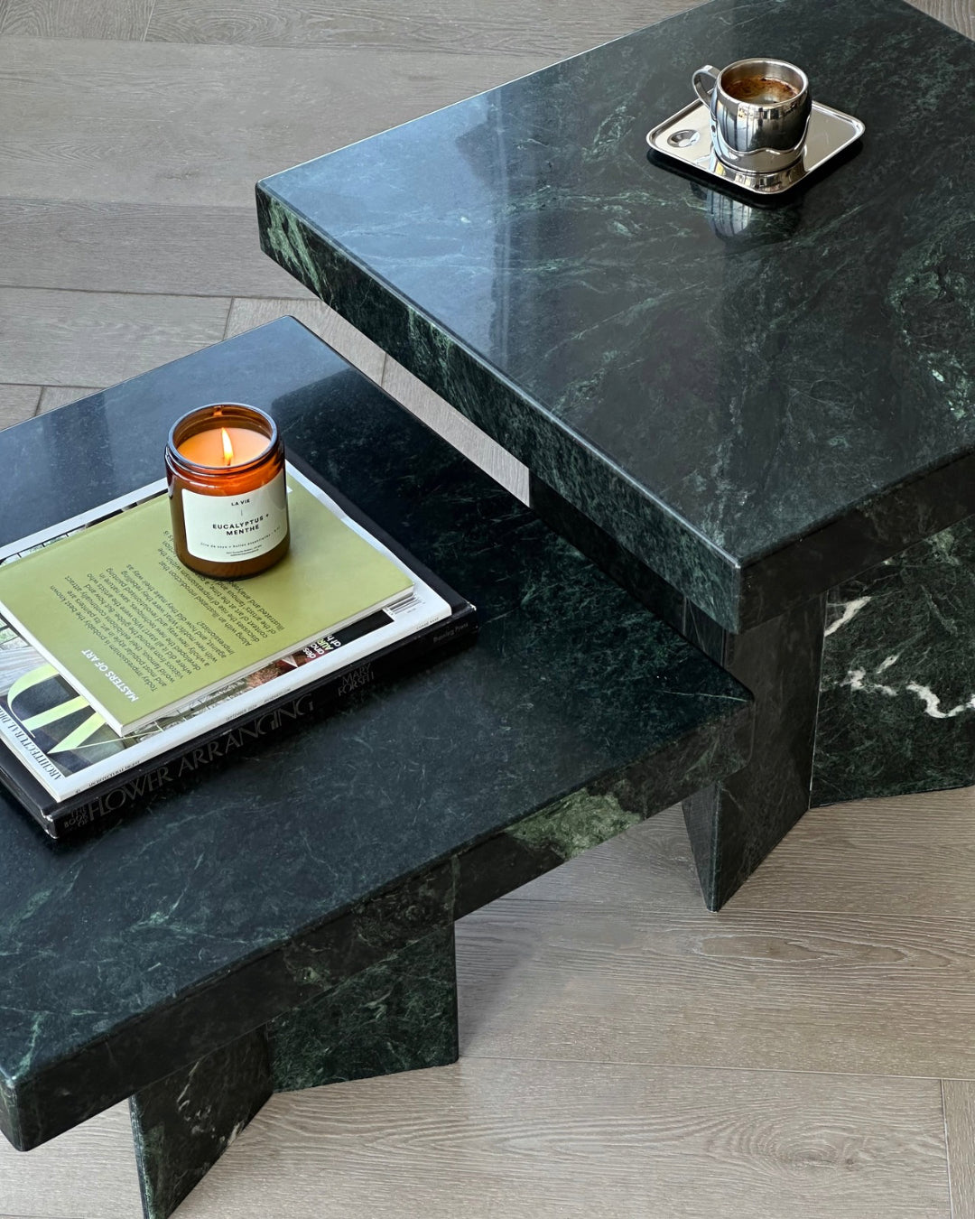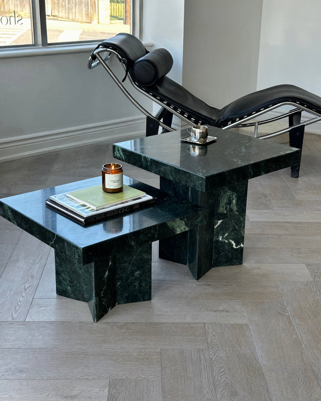 Vintage two-tier Verde Alpi marble coffee table in excellent condition. Surface has been professionally polished. A beautiful deep green with further depth and dimension provided by the layering effect of the two-tiered heights. Heights currently stand at 19” and 14.5”. Option to have as a low-profile height at 14.5” and lower for the second table for an additional cost.