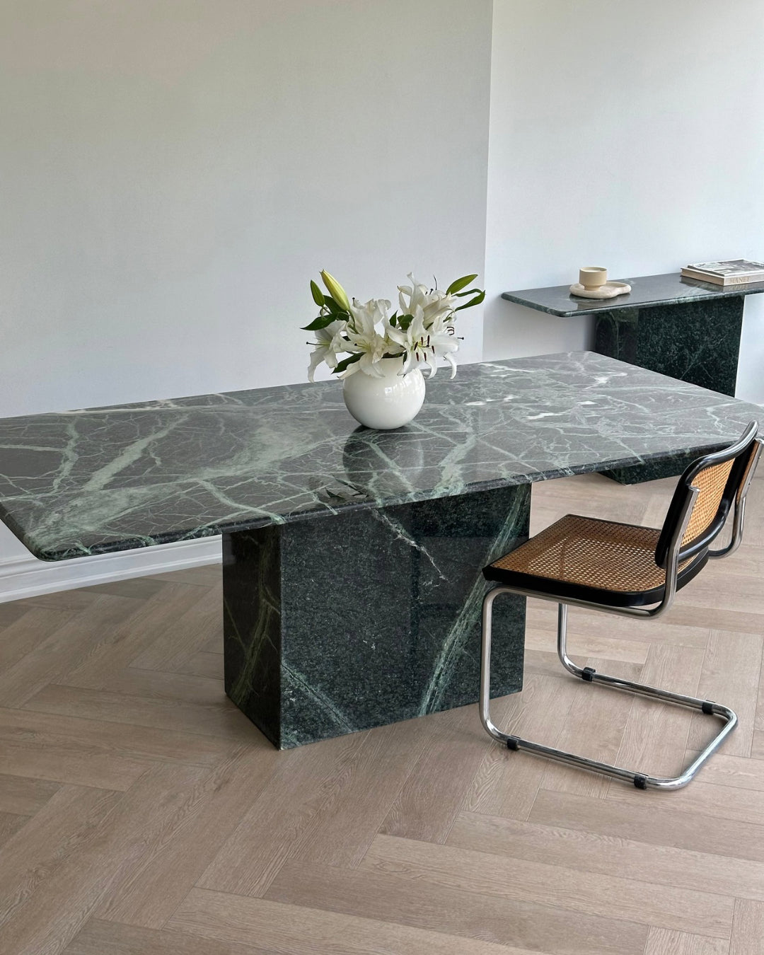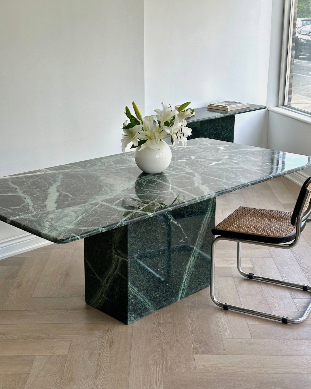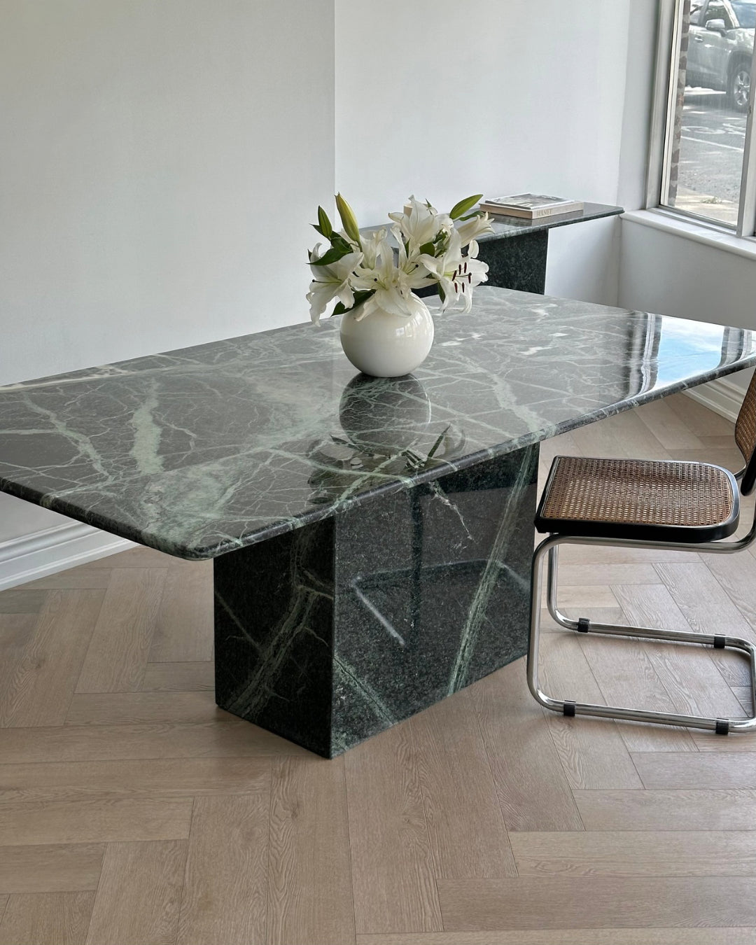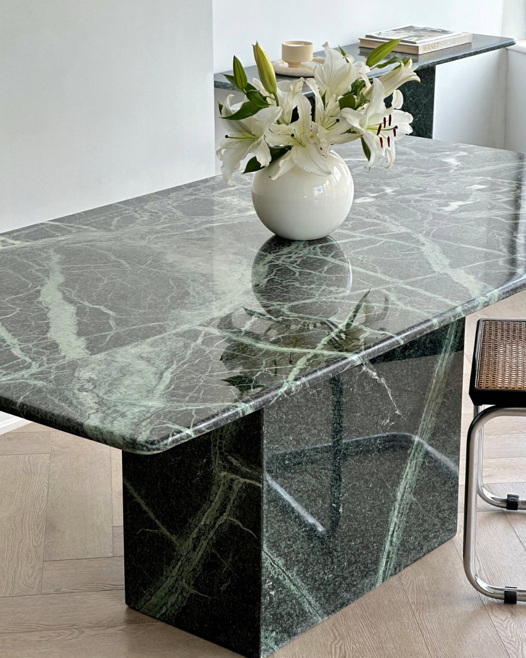 Excellent condition vintage Verde Alpi green marble dining table. A large, suitable size for 6-10 guests. Striking veining throughout the surface stone. Surface is coated in a protective epoxy which has been buffed and polished to a high shine and like-new condition.