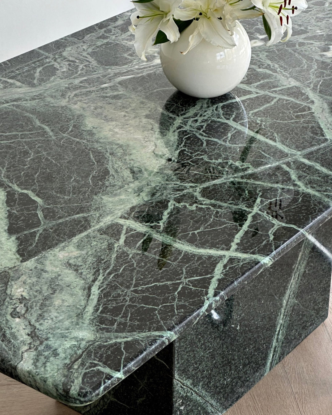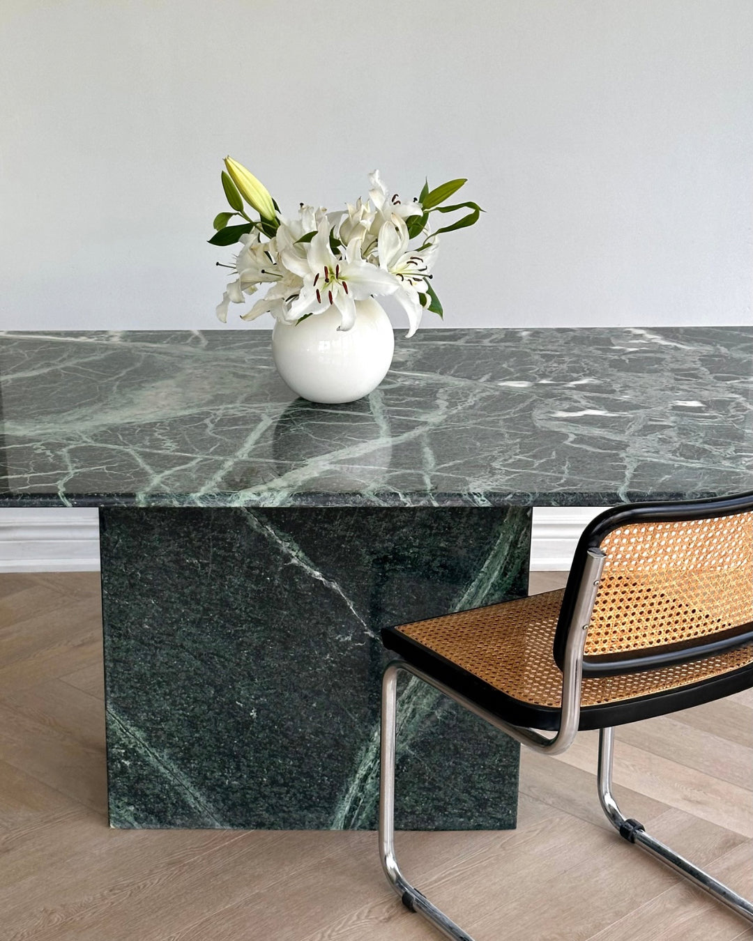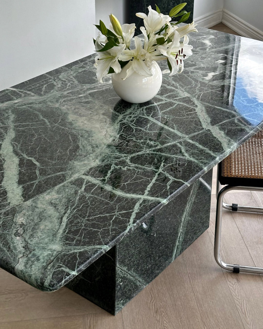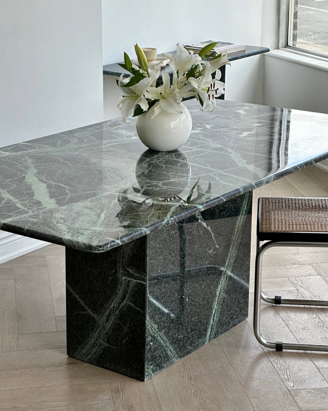 Excellent condition vintage Verde Alpi green marble dining table. A large, suitable size for 6-10 guests. Striking veining throughout the surface stone. Surface is coated in a protective epoxy which has been buffed and polished to a high shine and like-new condition.