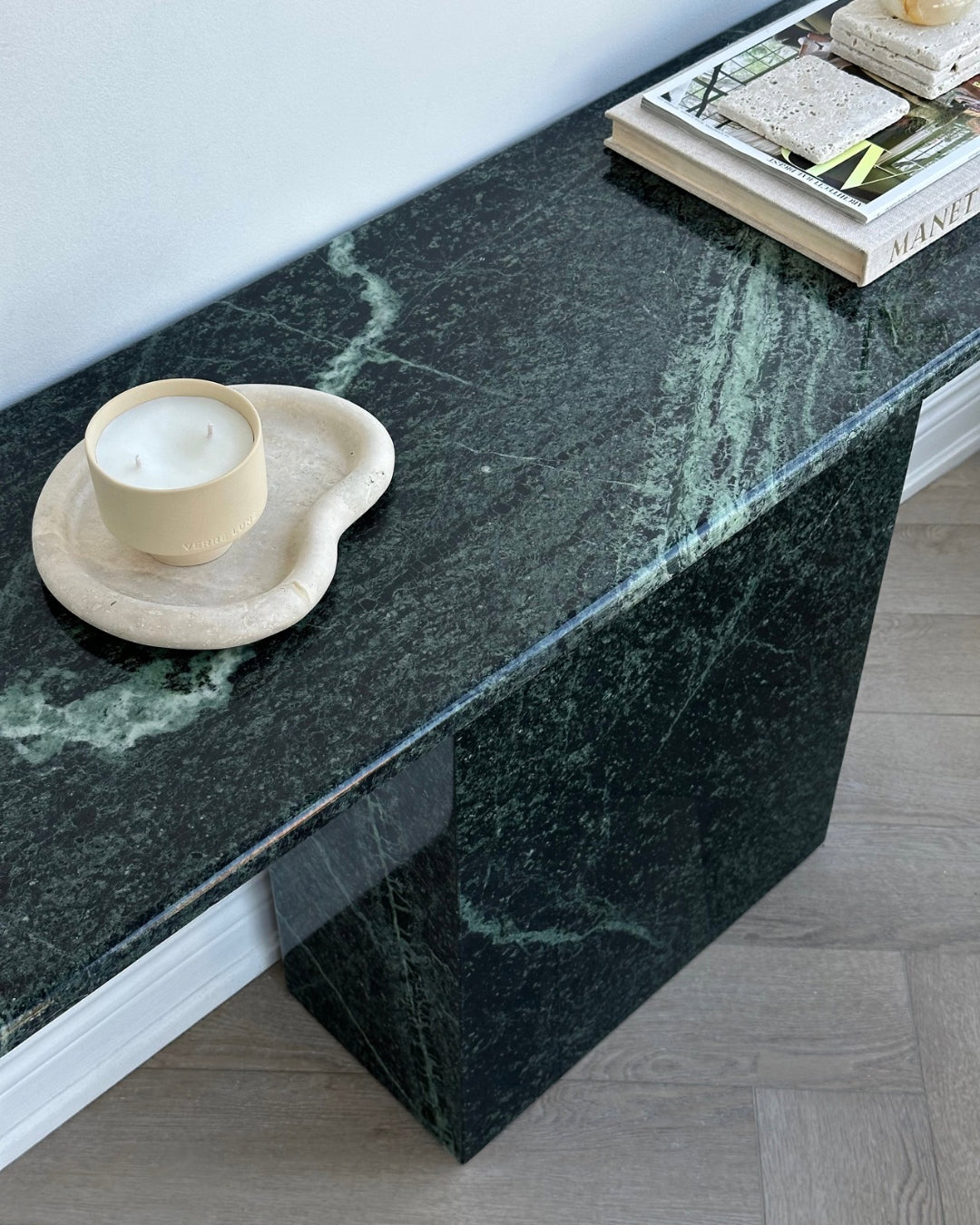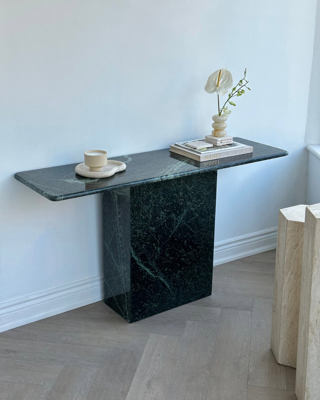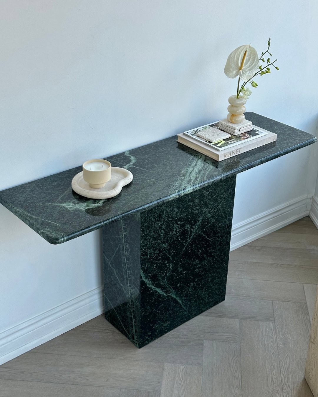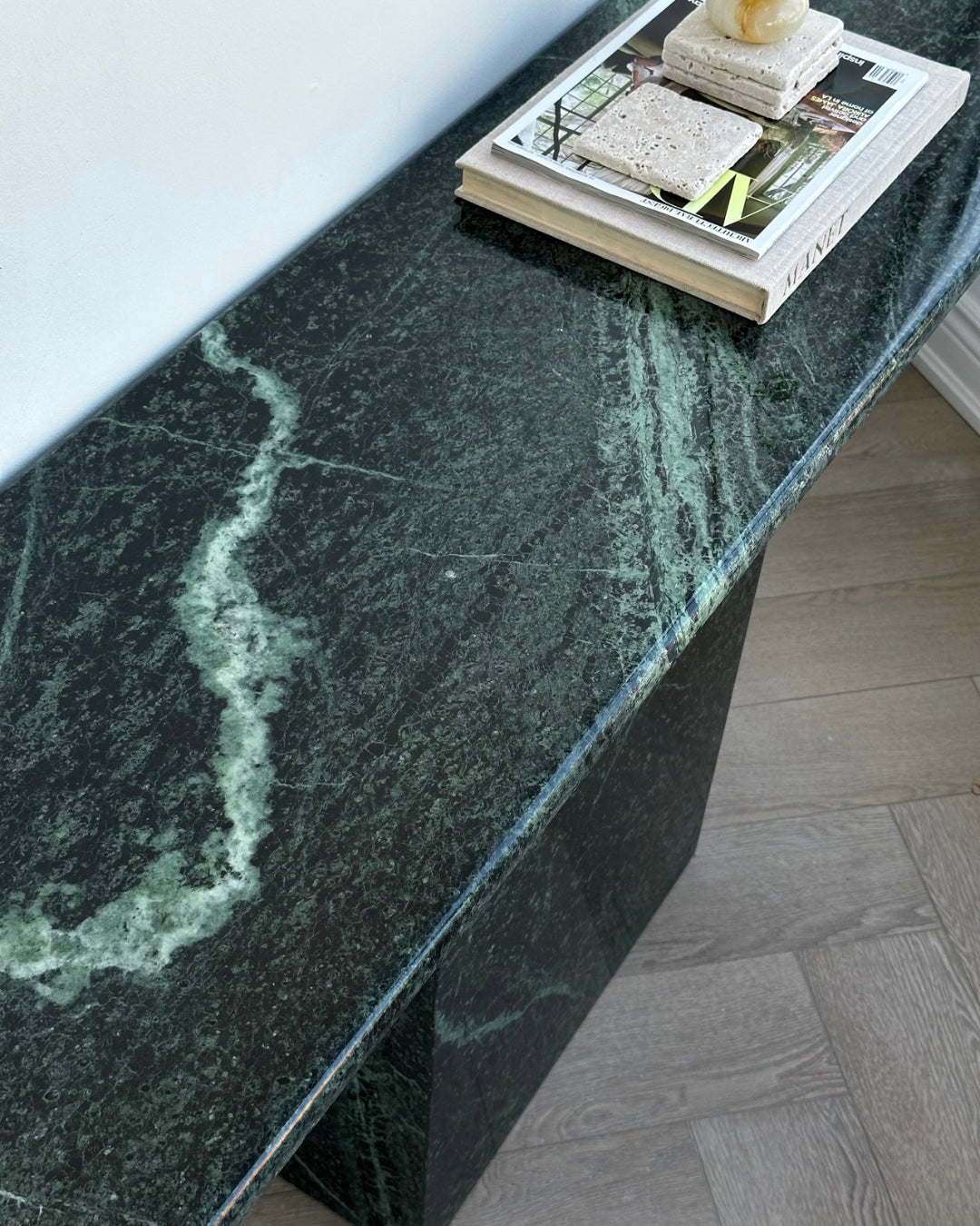Vintage Verde Alpi marble console table in excellent condition. Surface has been professionally polished. A gorgeous statement piece for an entryway or any wall for that matter. Striking veining throughout the surface. Re-sizing available for an extra cost.