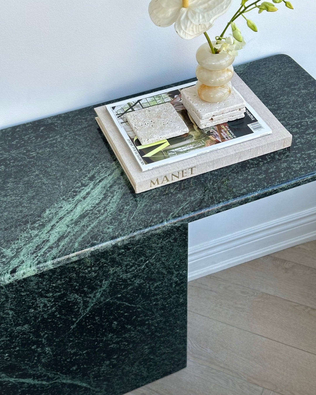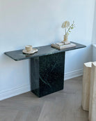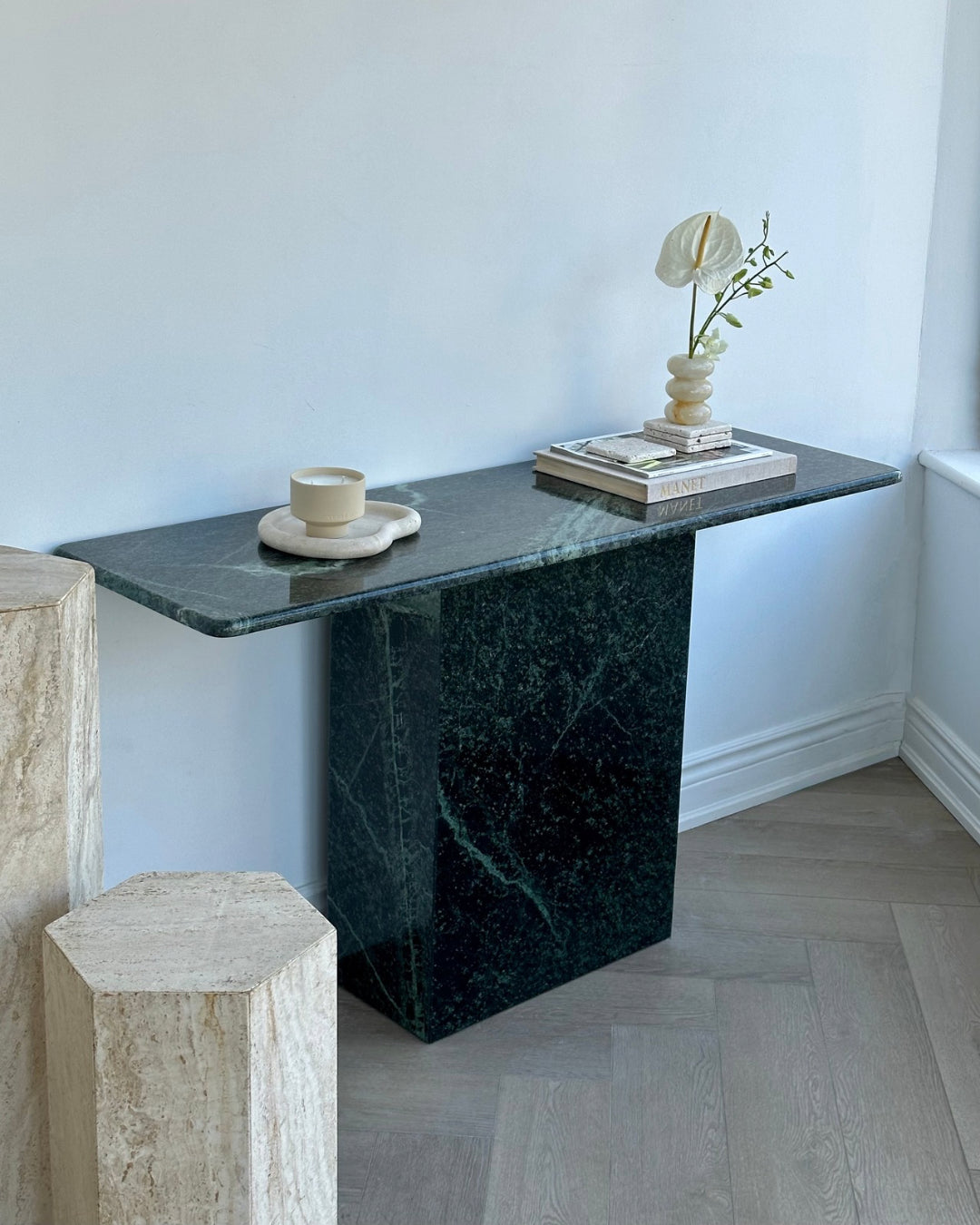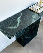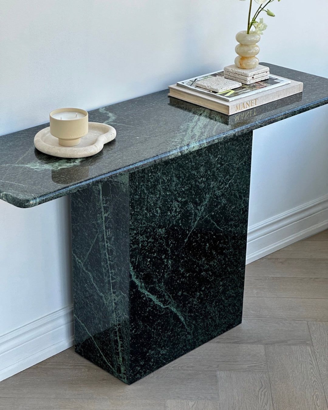 Vintage Verde Alpi marble console table in excellent condition. Surface has been professionally polished. A gorgeous statement piece for an entryway or any wall for that matter. Striking veining throughout the surface. Re-sizing available for an extra cost.