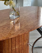 Flawless vintage condition oval marble dining table with a fluted base. In a rare and striking red marble; Rosso Breccia Pernice, a similar style and tone to Red Travertine with beautiful scalloped detailing. Surface has been professionally restored and polished. Seats 6 comfortably or 8 occasionally.