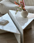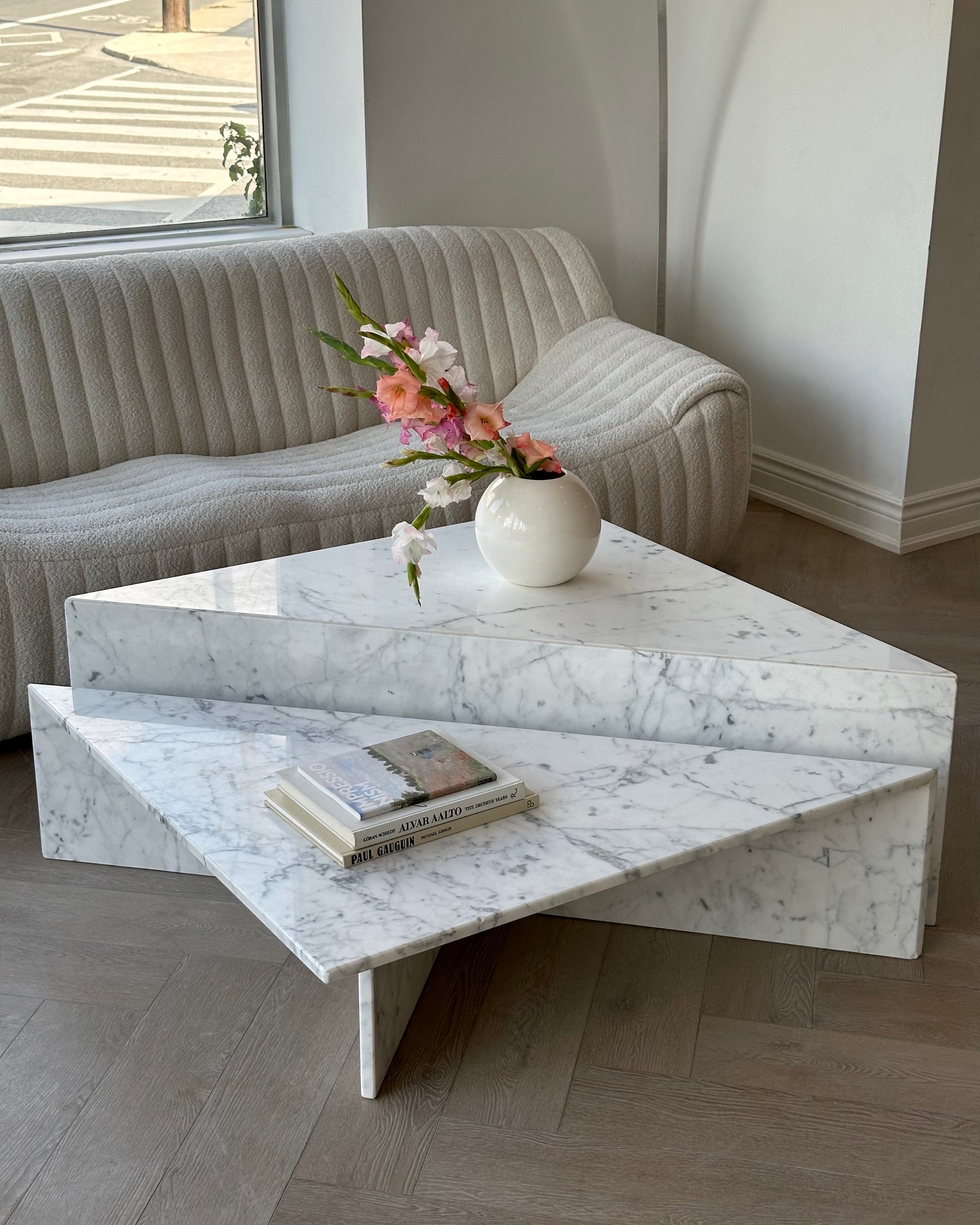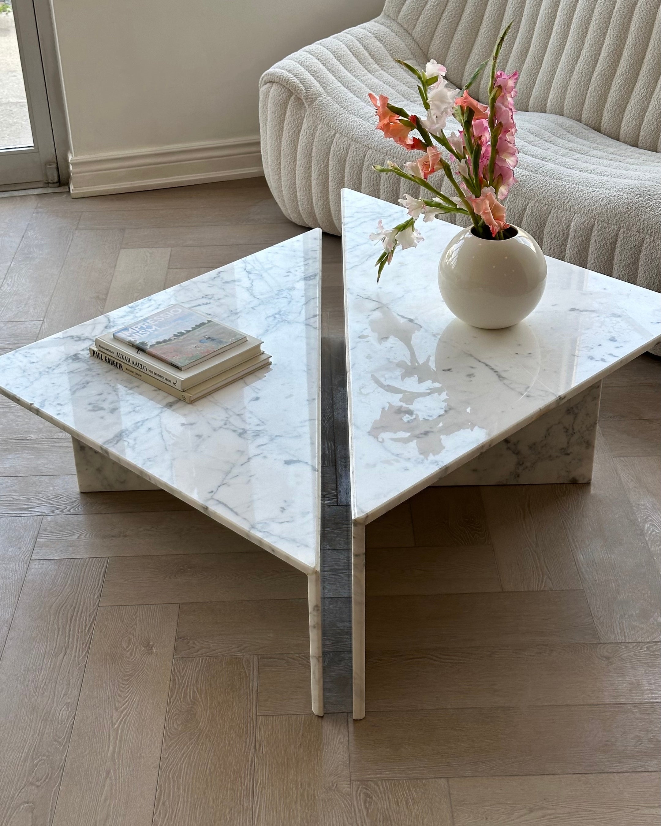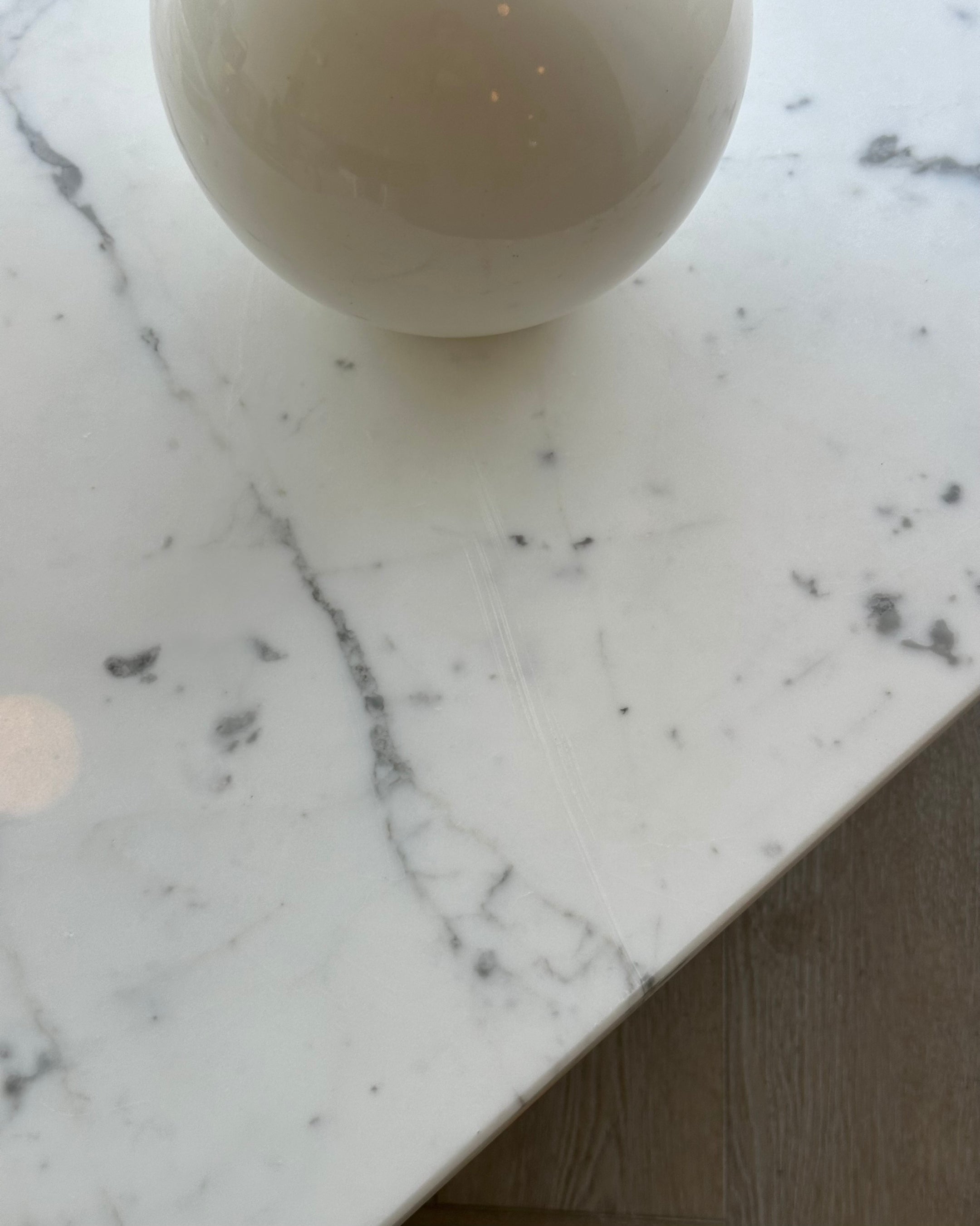 A classic vintage design in a material we haven’t seen before. Excellent condition vintage Carrara marble coffee table. Surface has been professionally restored and polished, however some deeper scratches and age related wear remain after the restoration process.