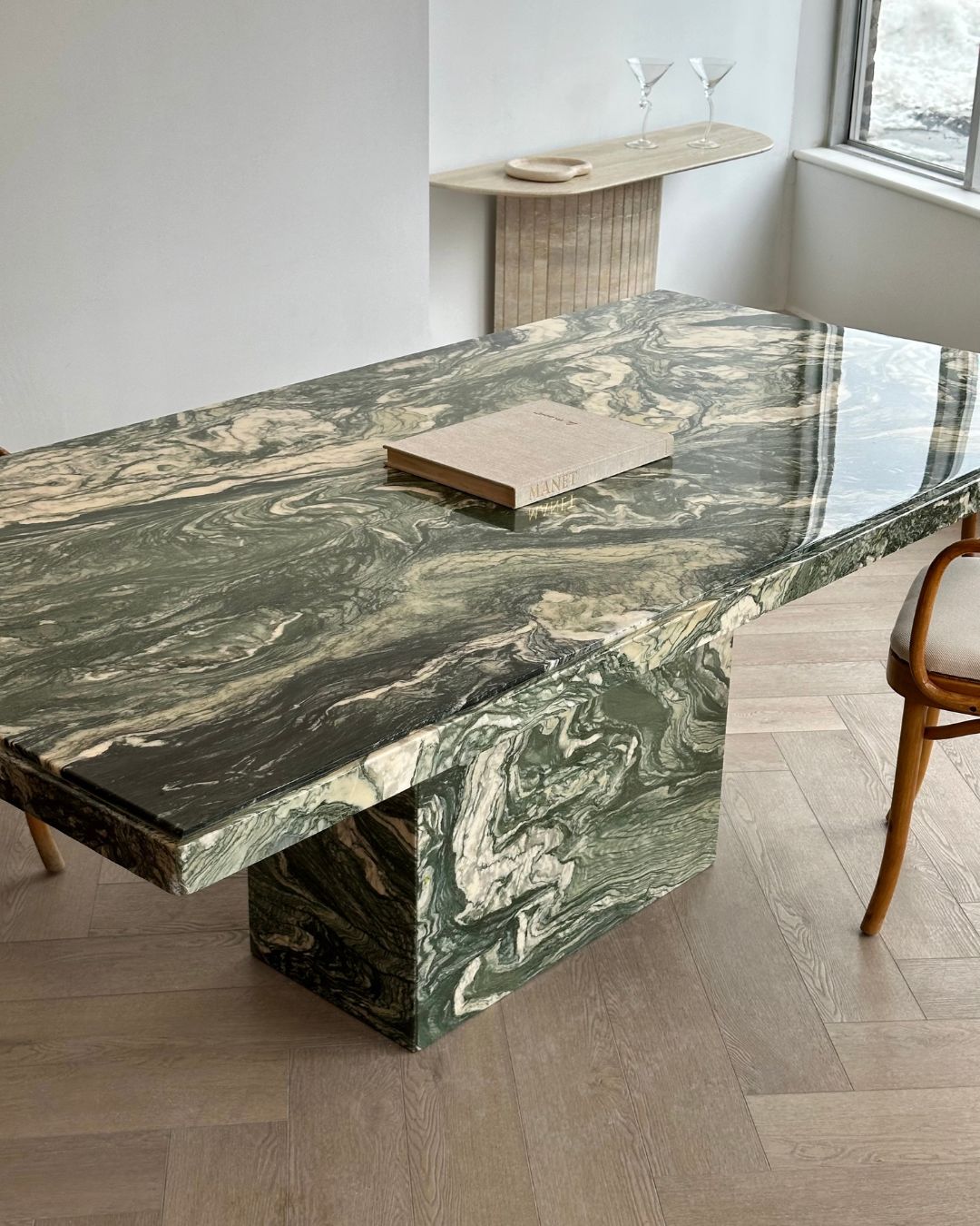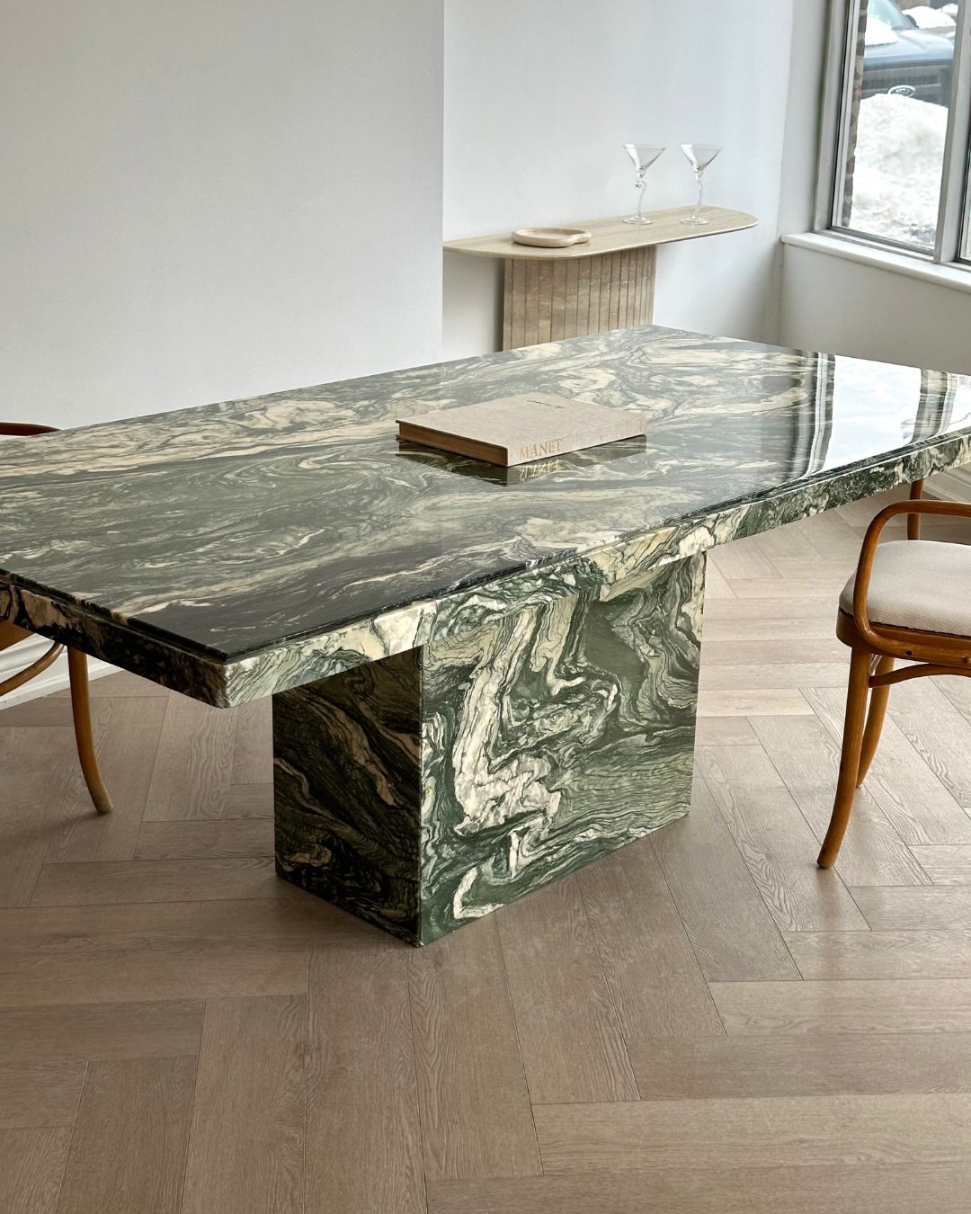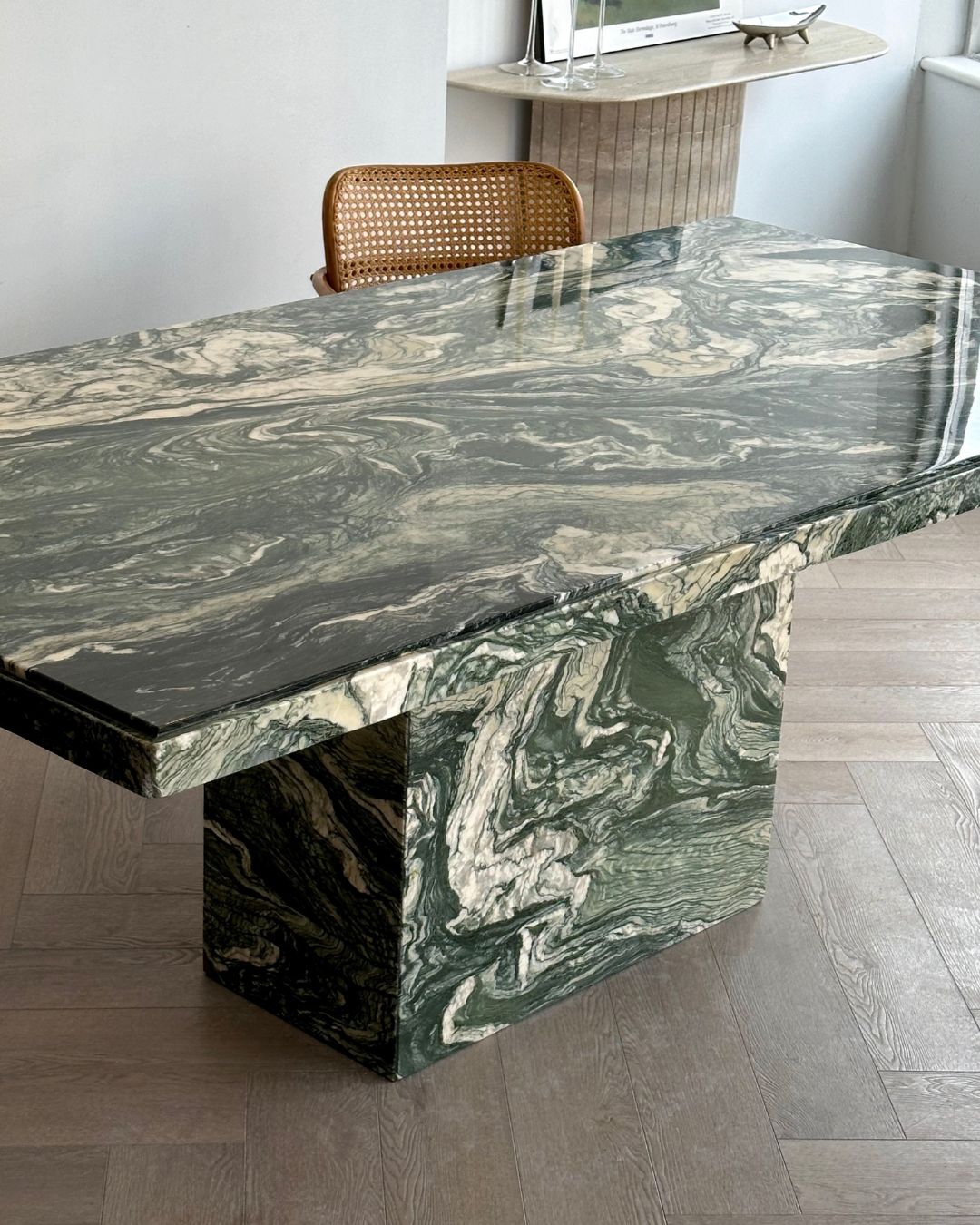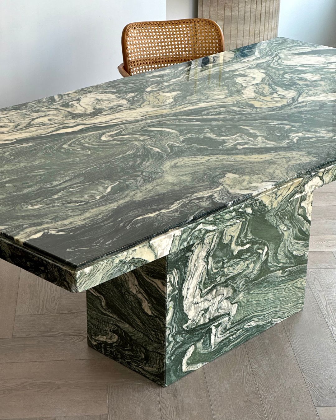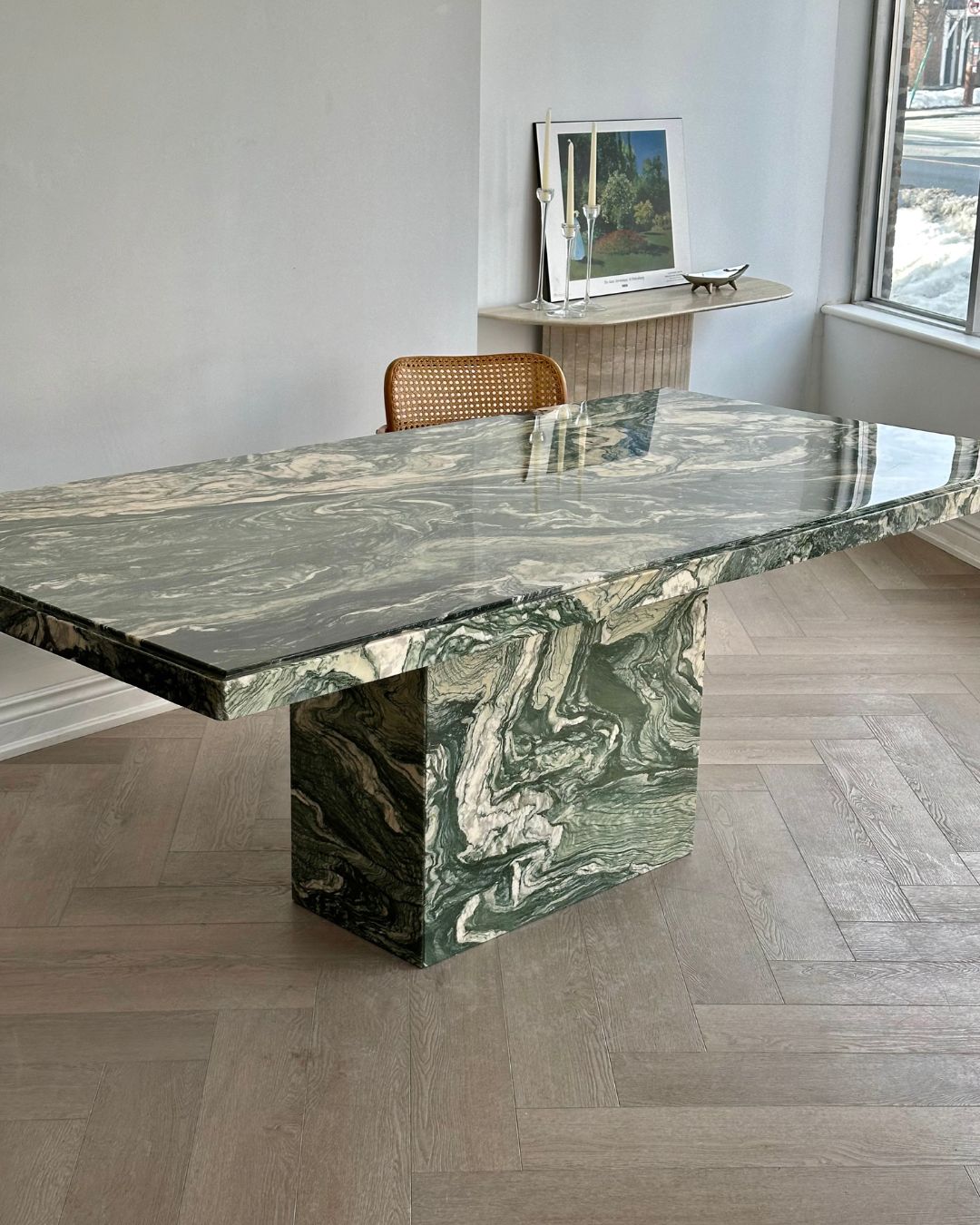 Flawless vintage condition Verde Luana marble dining table with rare larger dimensions and a beveled edge. Surface is coated in a strong, glossy epoxy coating providing ultimate protection from marble staining. The epoxy coating has been professionally polished and restored to like-new condition. We seldom come across Verde Luana marble, let alone in this larger size, so for that reason it truly is one-of-a-kind!