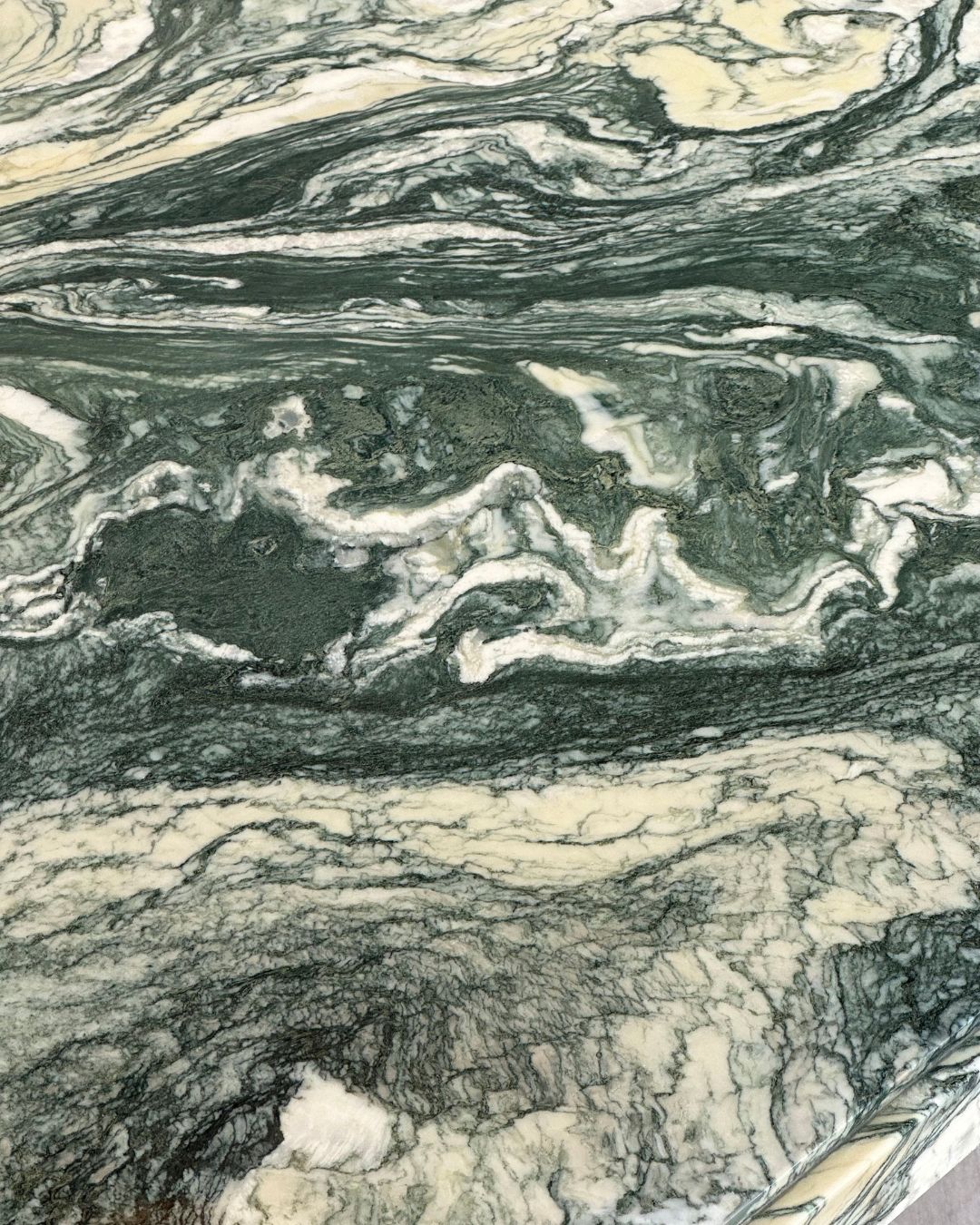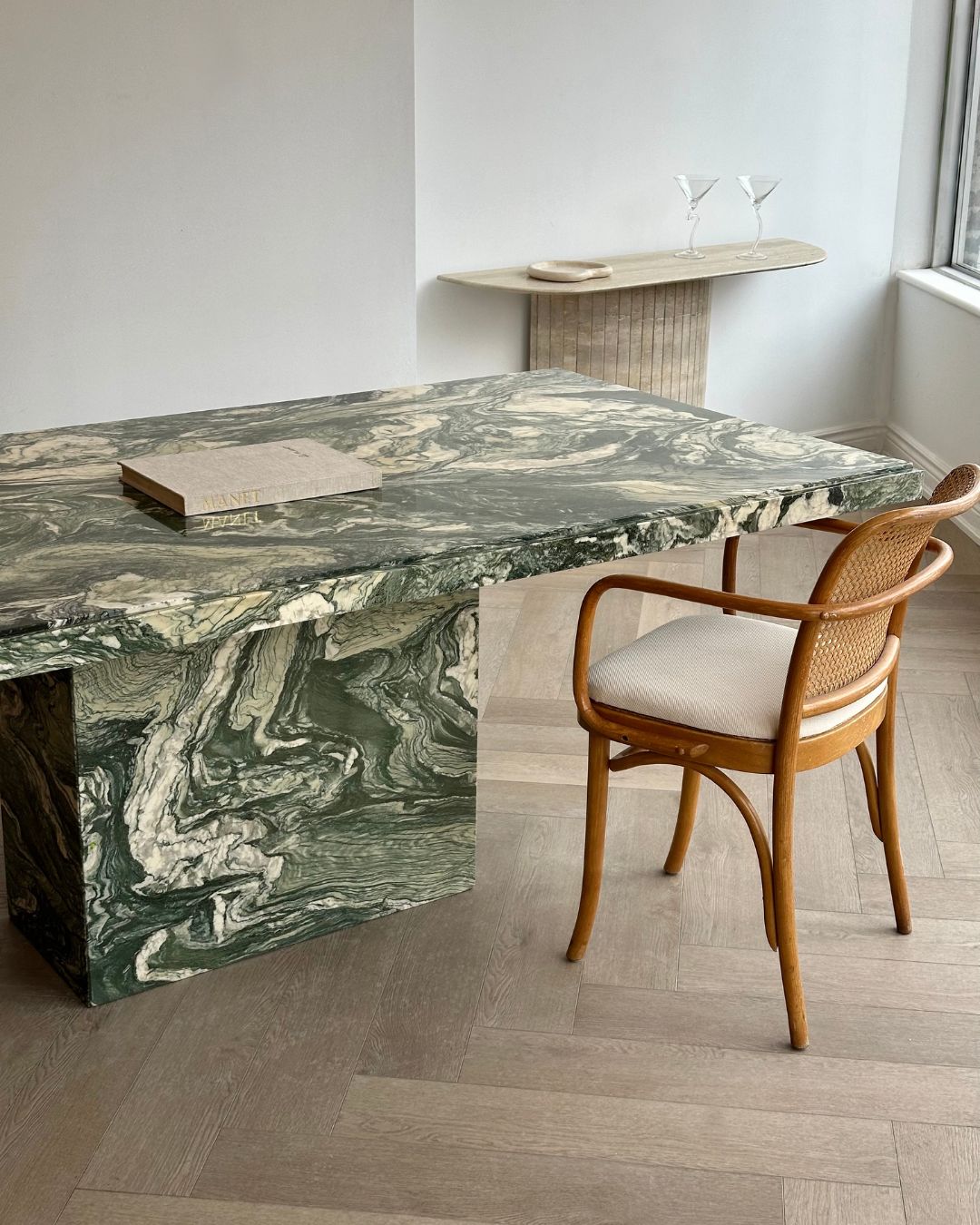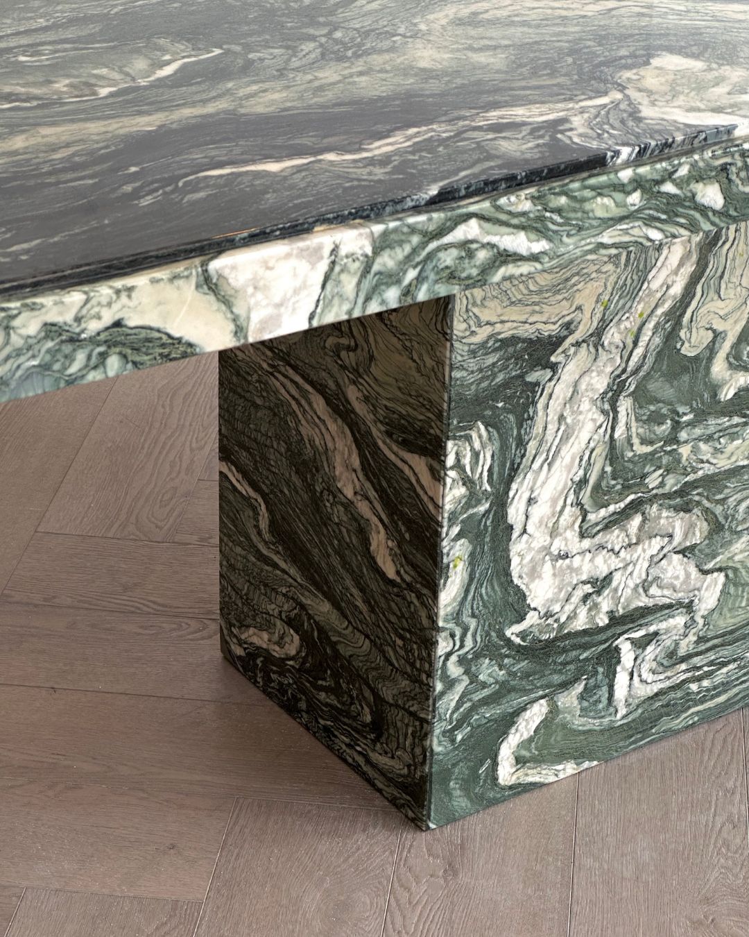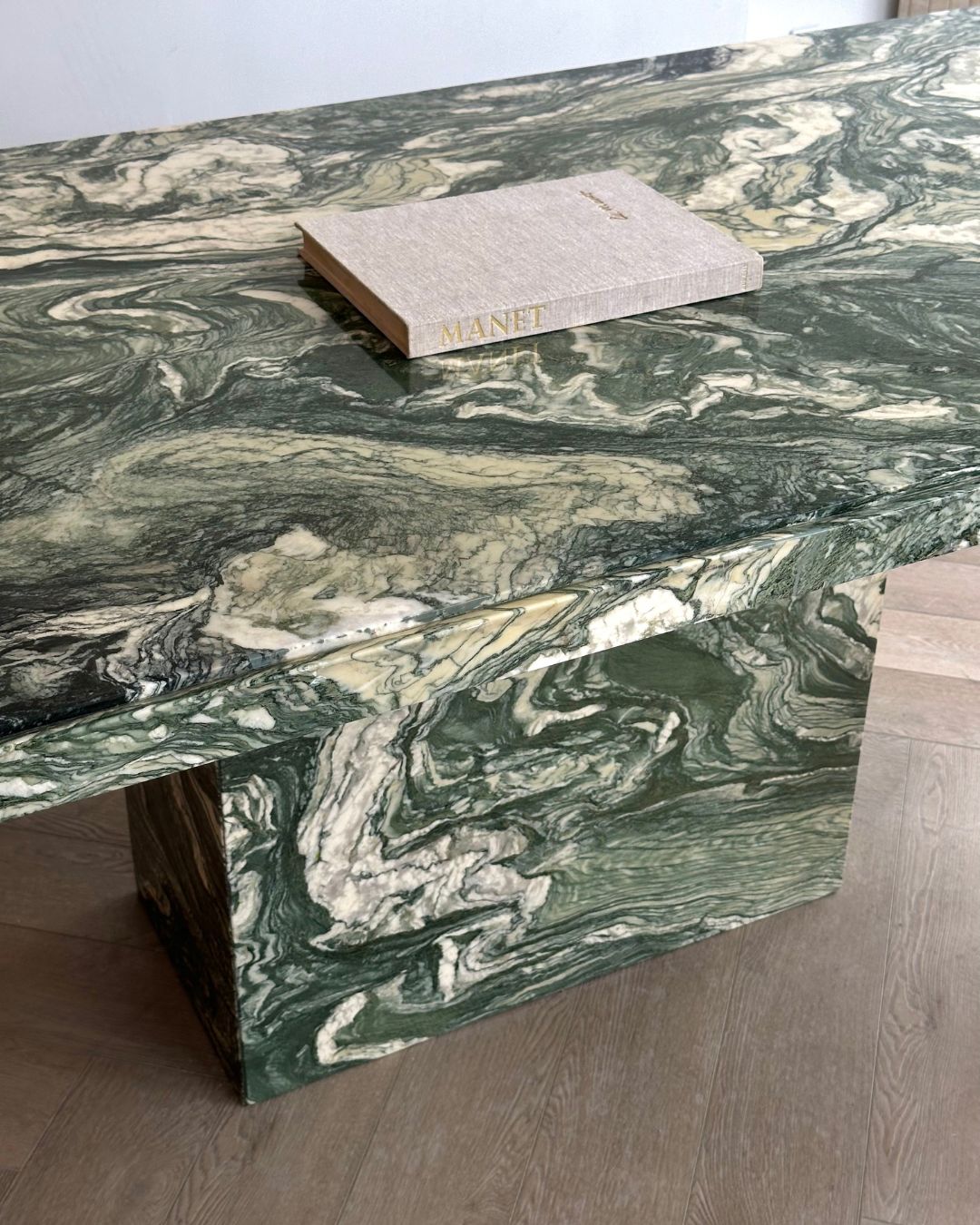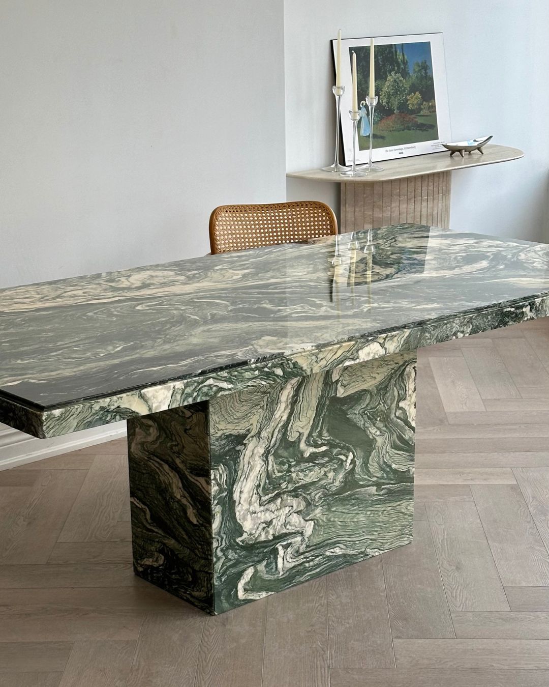 Flawless vintage condition Verde Luana marble dining table with rare larger dimensions and a beveled edge. Surface is coated in a strong, glossy epoxy coating providing ultimate protection from marble staining. The epoxy coating has been professionally polished and restored to like-new condition. We seldom come across Verde Luana marble, let alone in this larger size, so for that reason it truly is one-of-a-kind!