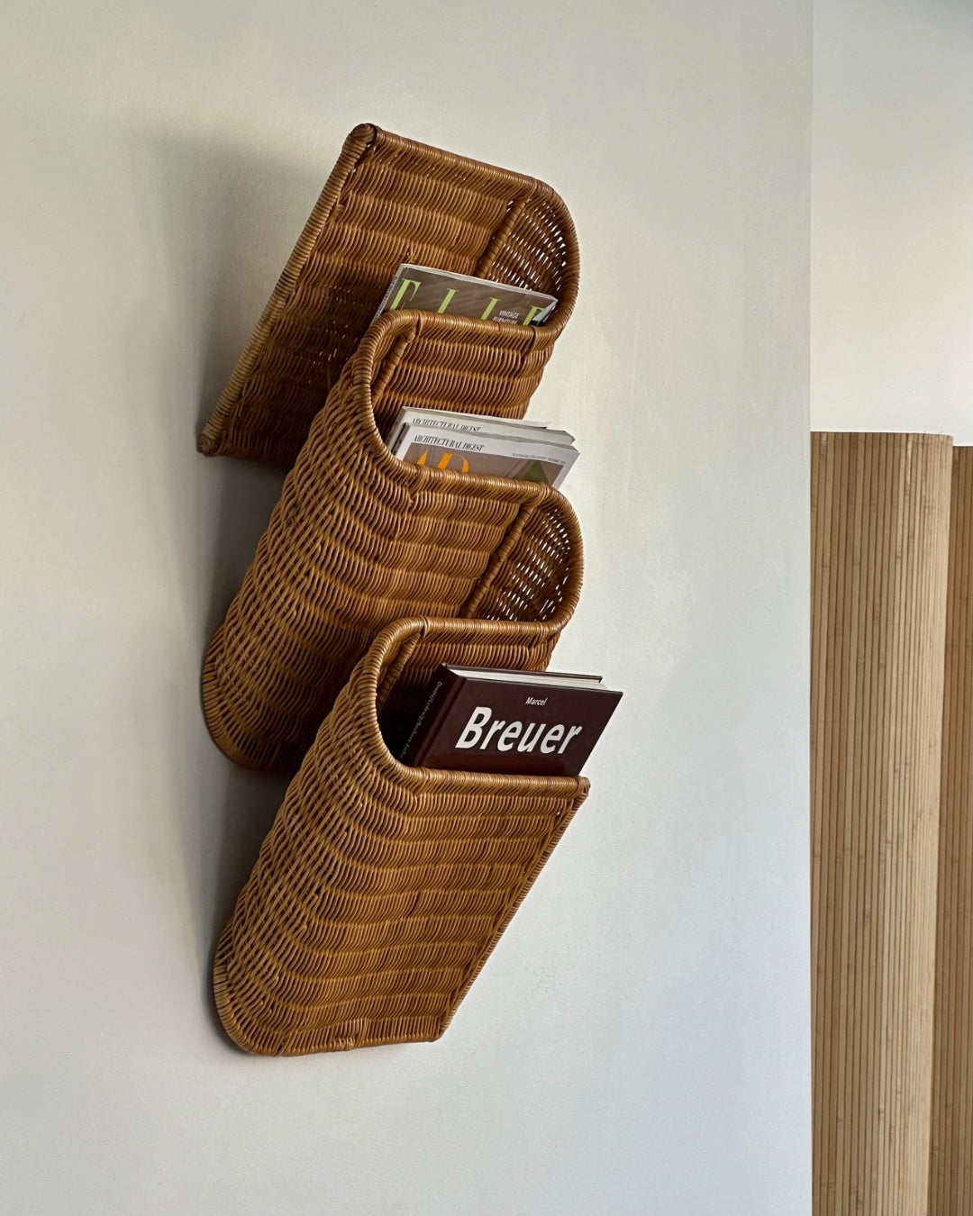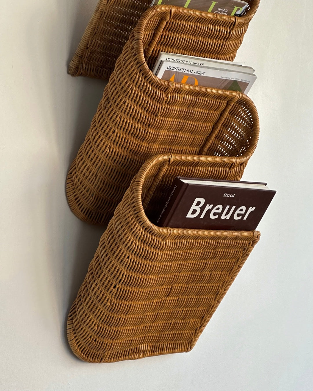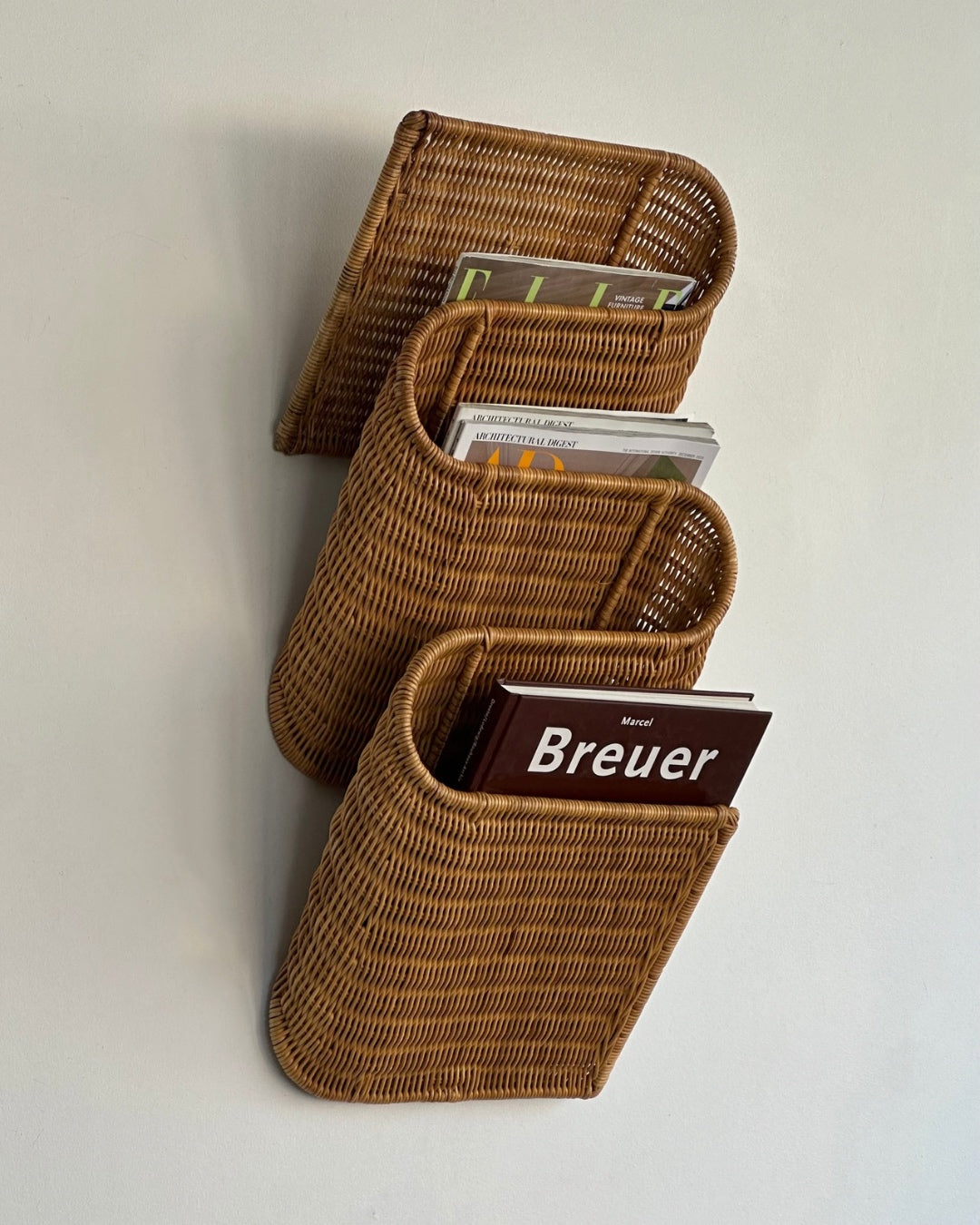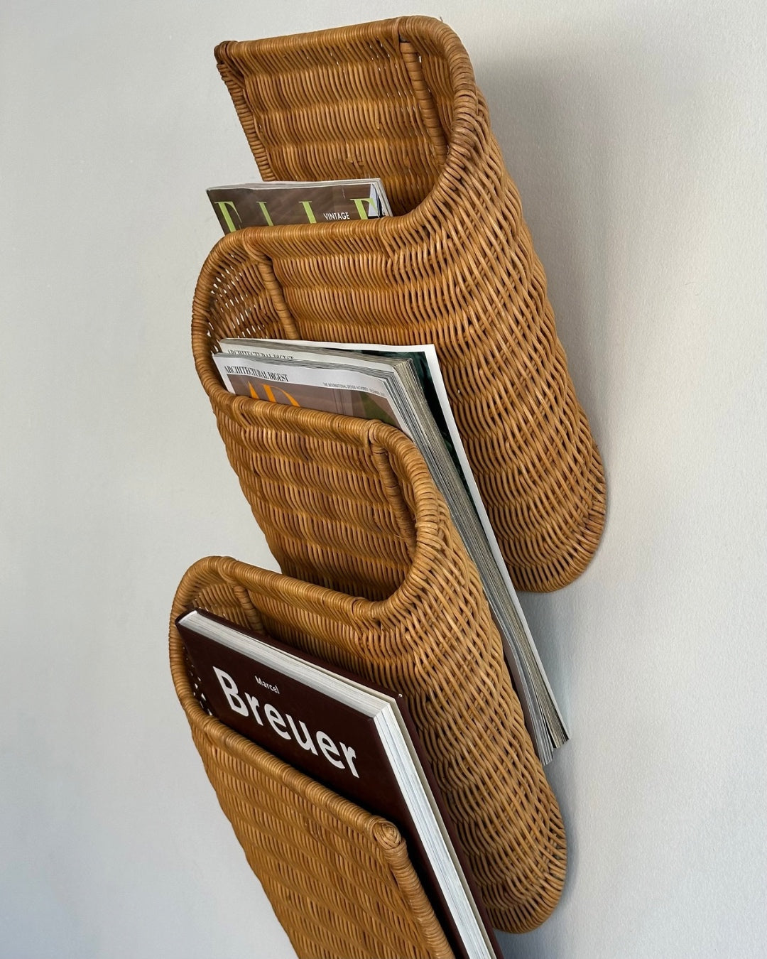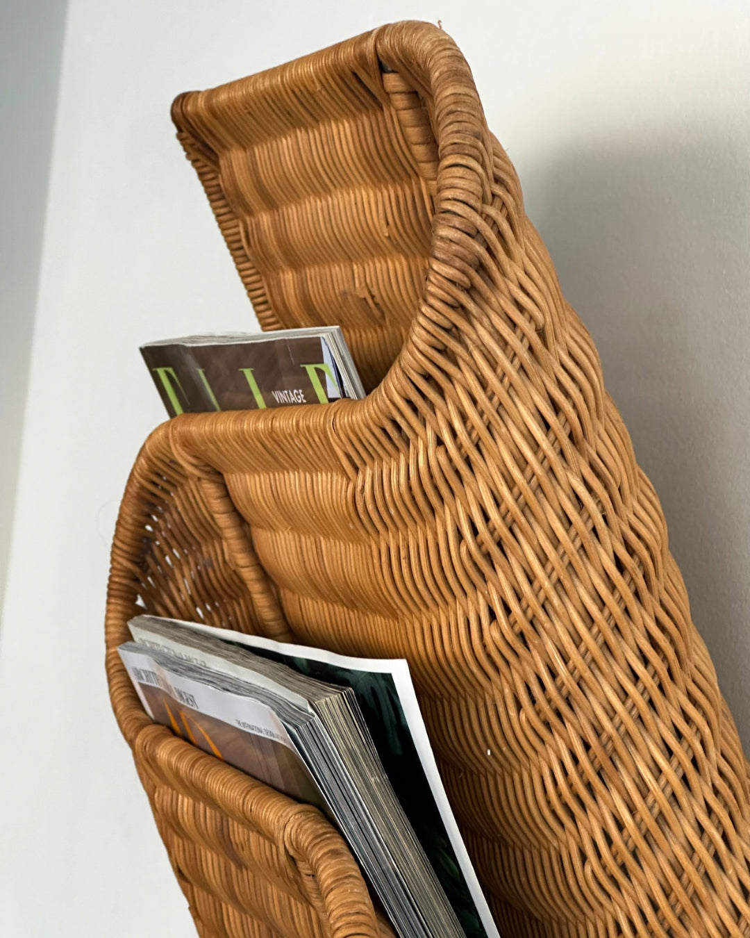 Excellent vintage condition wall-mounted magazine rack in wicker rattan. Designed by Karl Malmvall for IKEA in 1998 through 2002. Minimal wear overall, expected with age. Features two inserts for wall plugs.